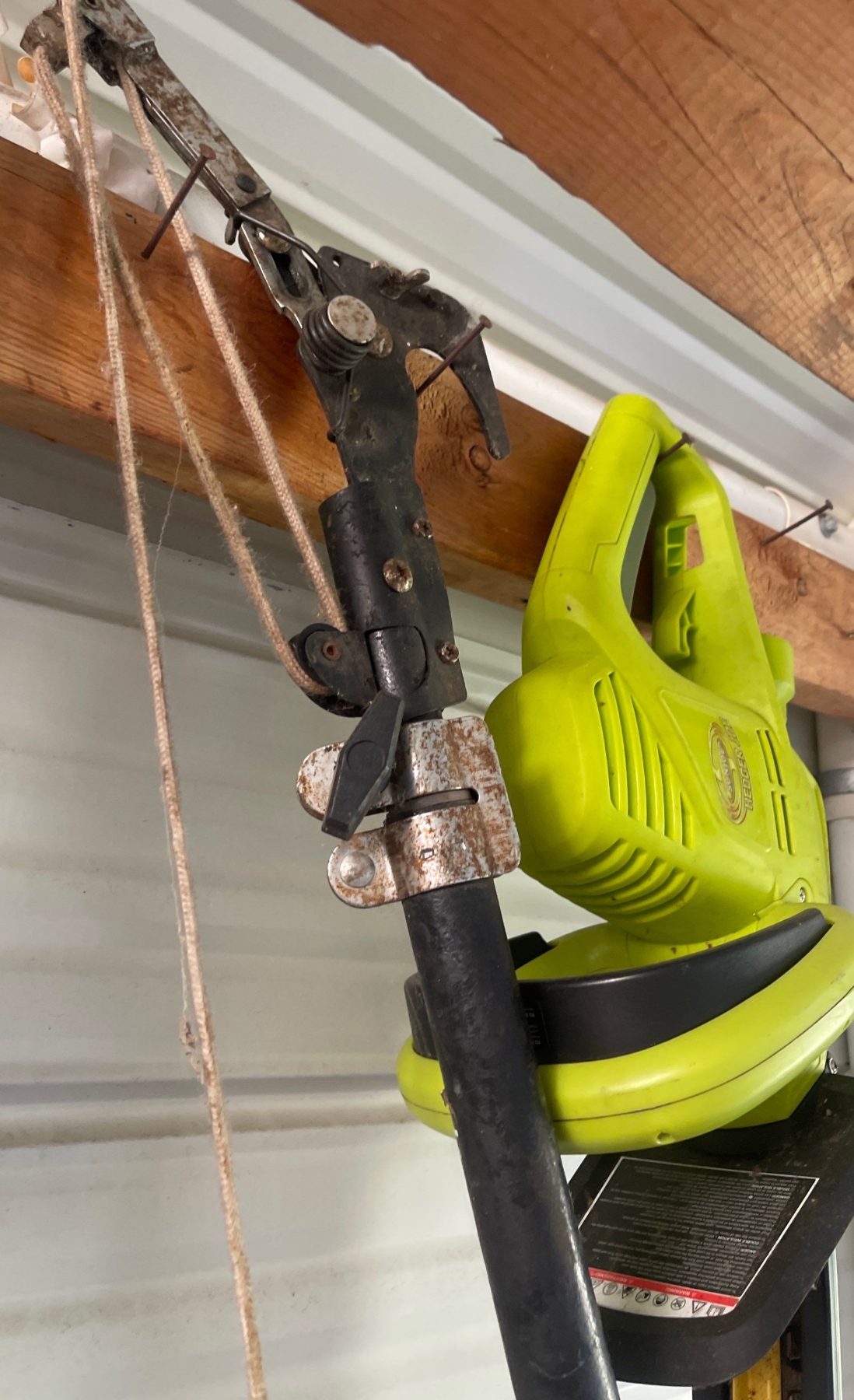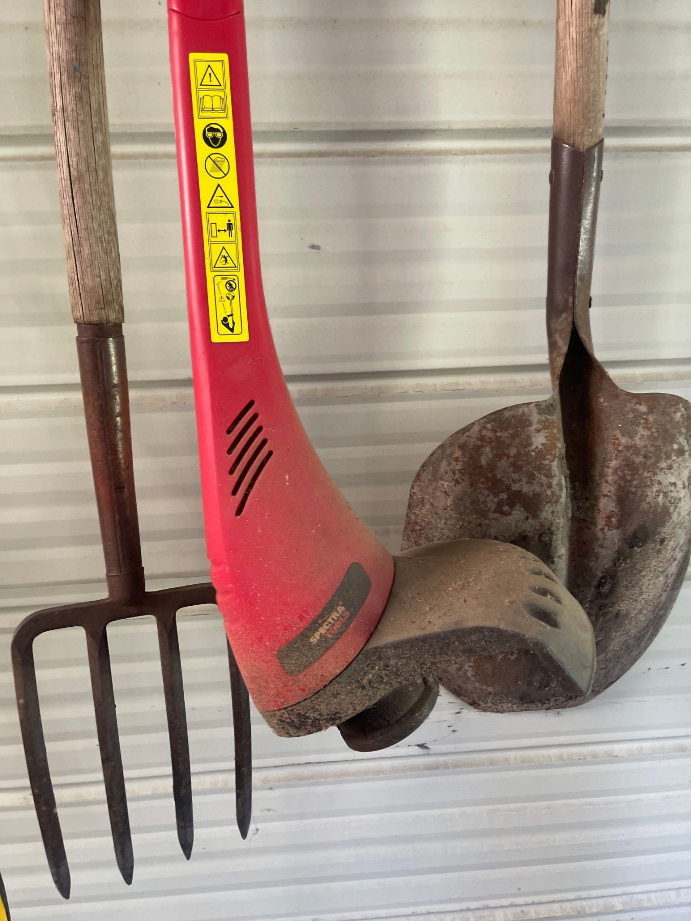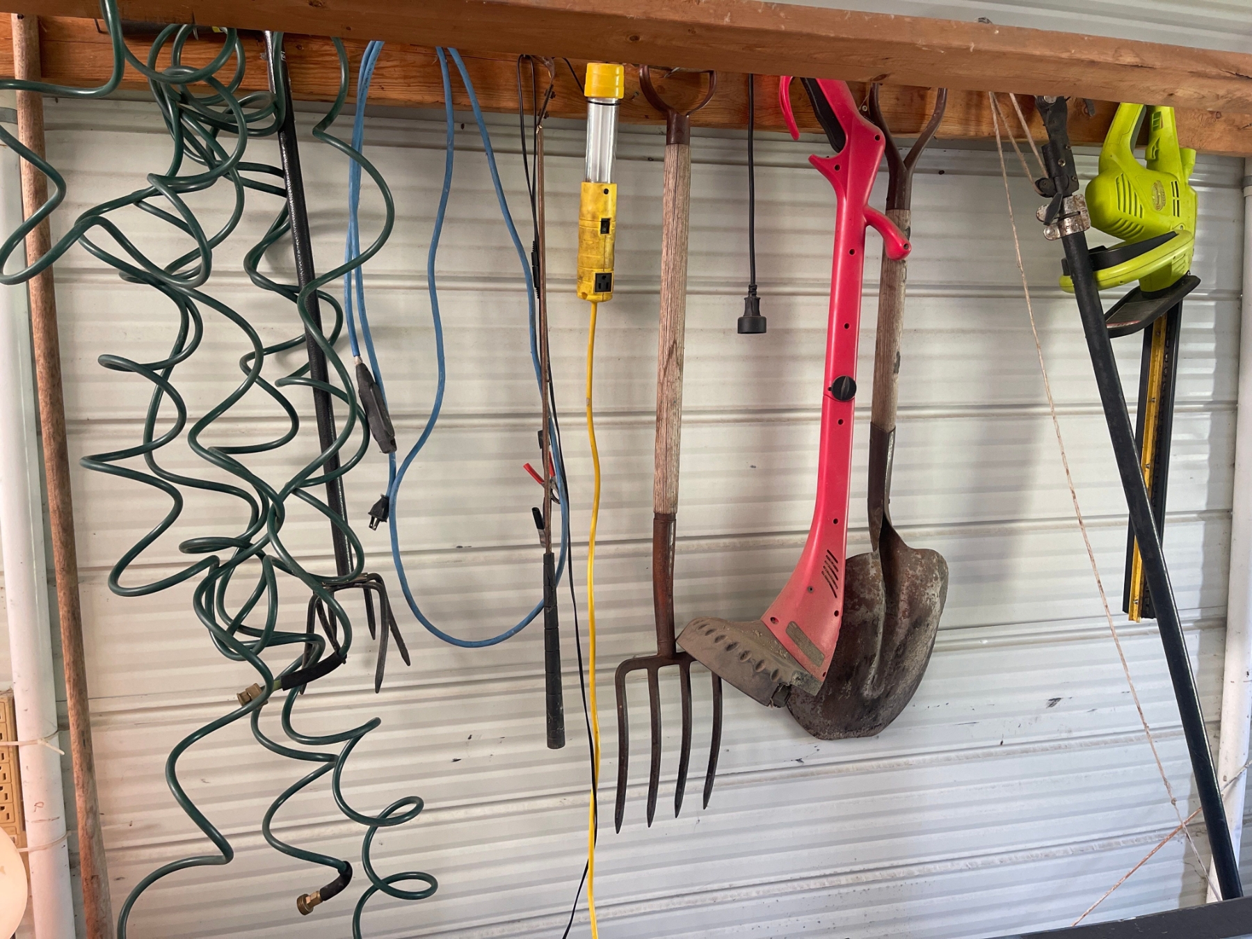 Line Up Of Yard Tools- Hose, Pitch Fork, Weed Whacker, Trimmer, Shovel & More