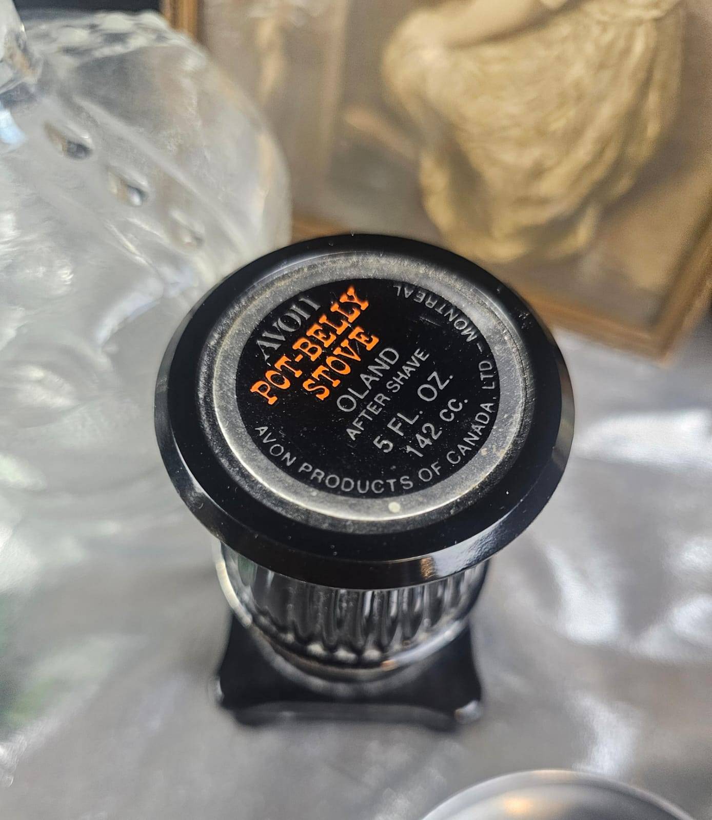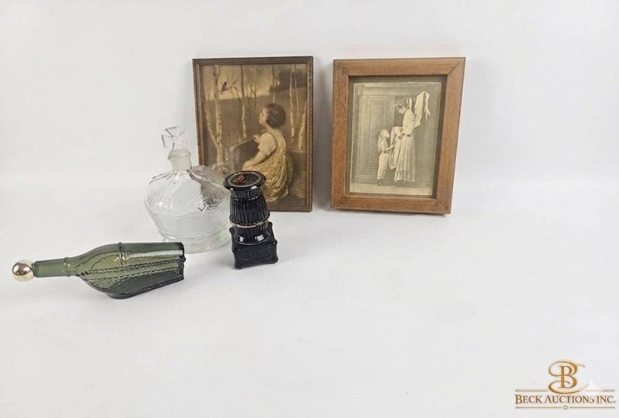 This lot features a charming mix of household items including 8 sleek metal bowls, a unique green glass bottle with a stopper, a crystal decanter adorned with an ornate cross-shaped stopper, and a black "Pot Belly Stove" salt/pepper shaker marked as 5 1/2 ounces. Also included are two nostalgic framed art prints in wooden frames depicting heartwarming scenes. A versatile collection perfect for decor enthusiasts or collectors.