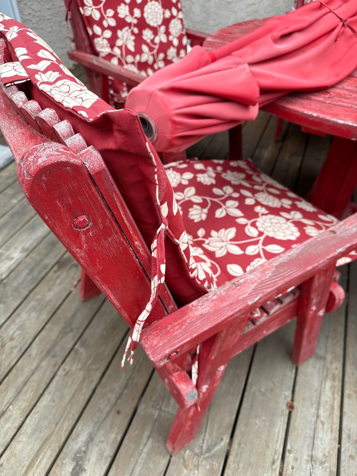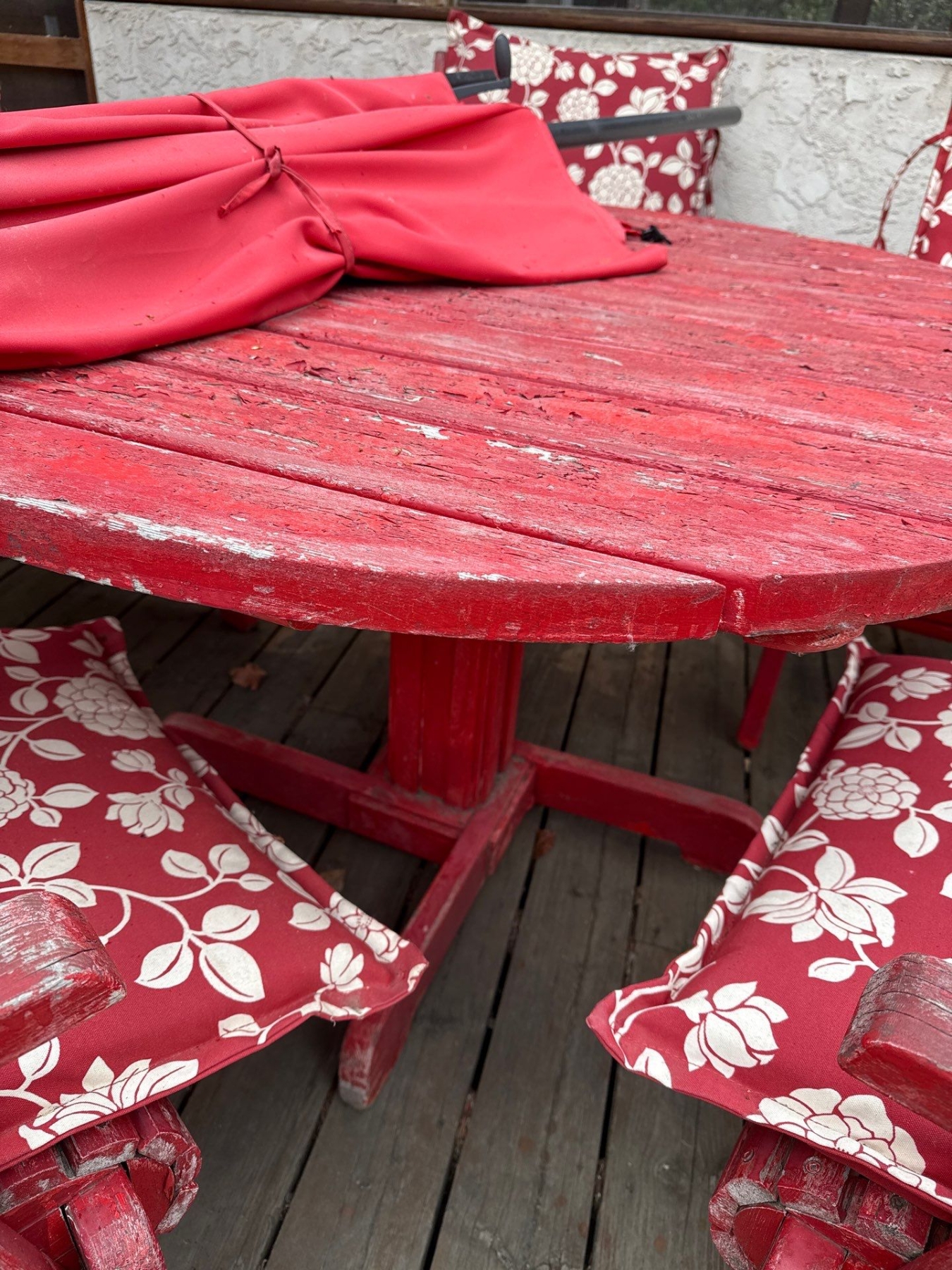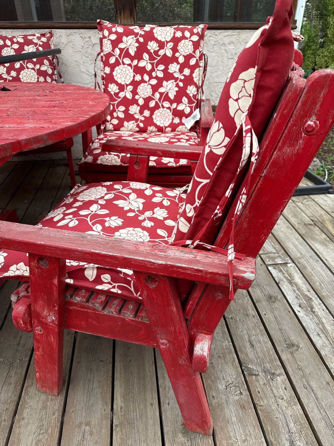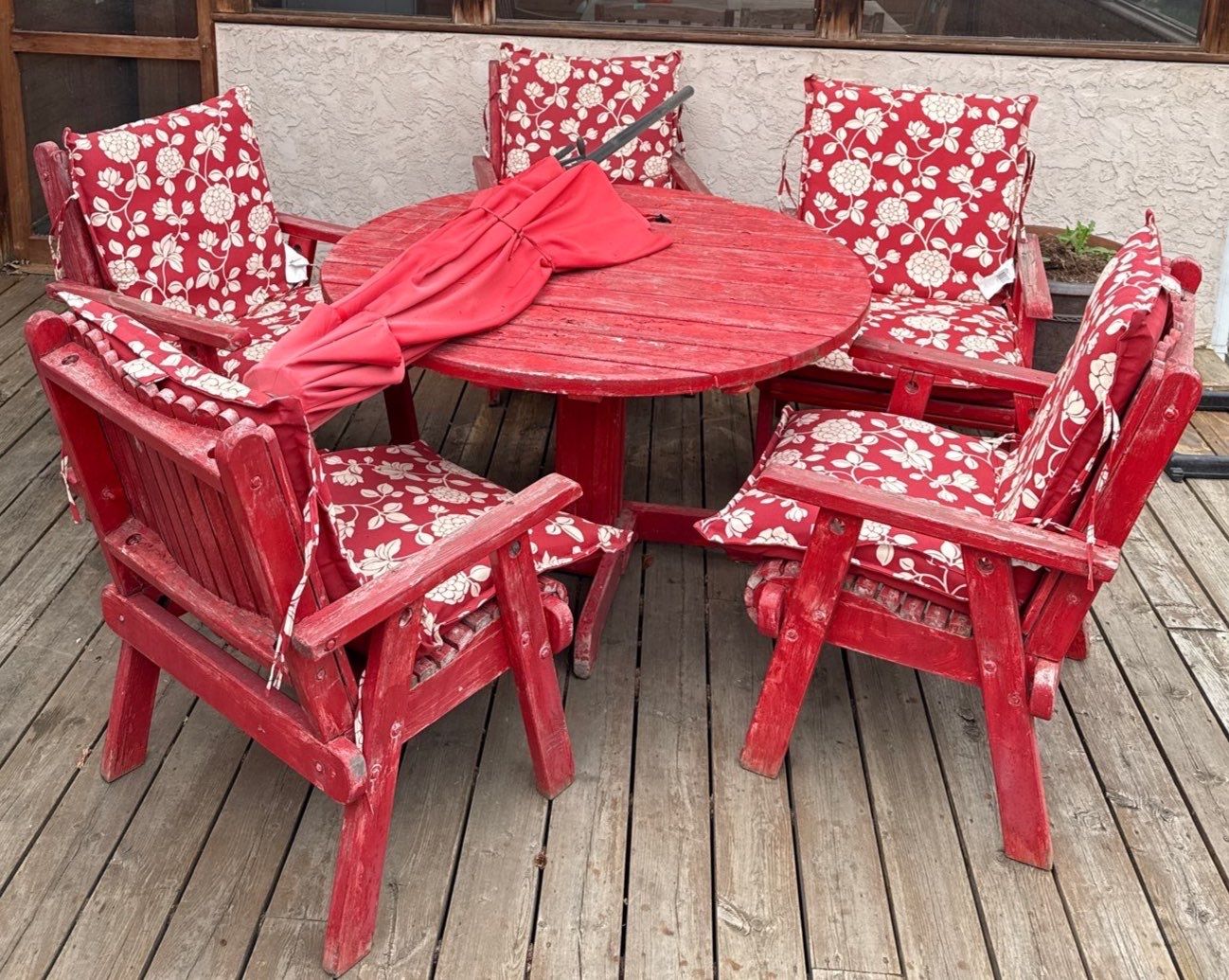 Lovely Wooden Outdoor Patio Table Set (Chairs, Umbrella, Cushions) - Table is 48W, 29T