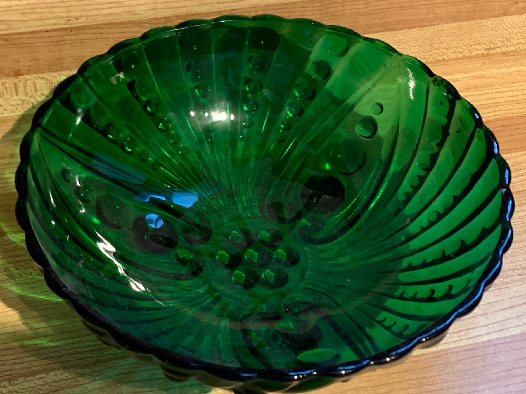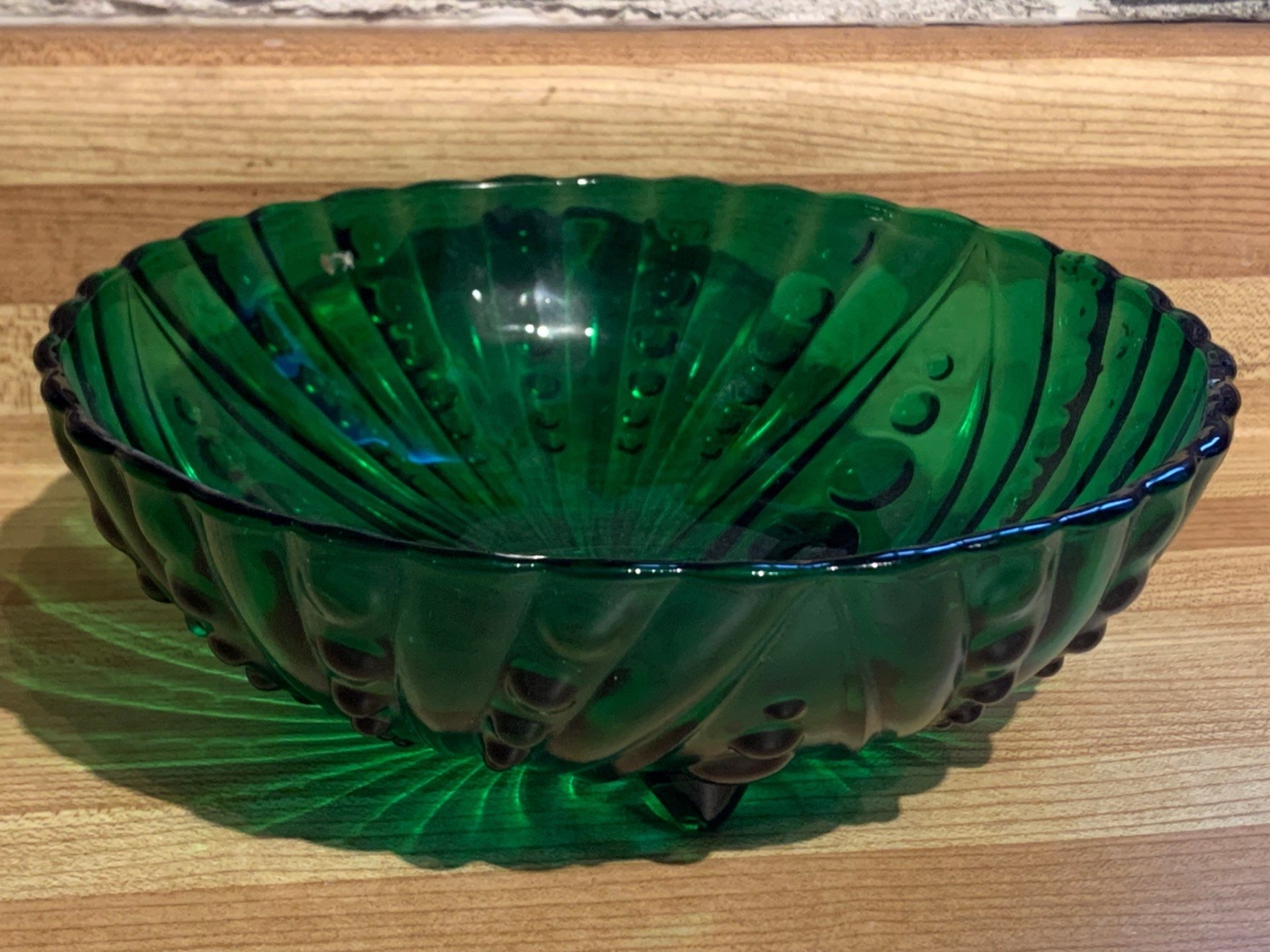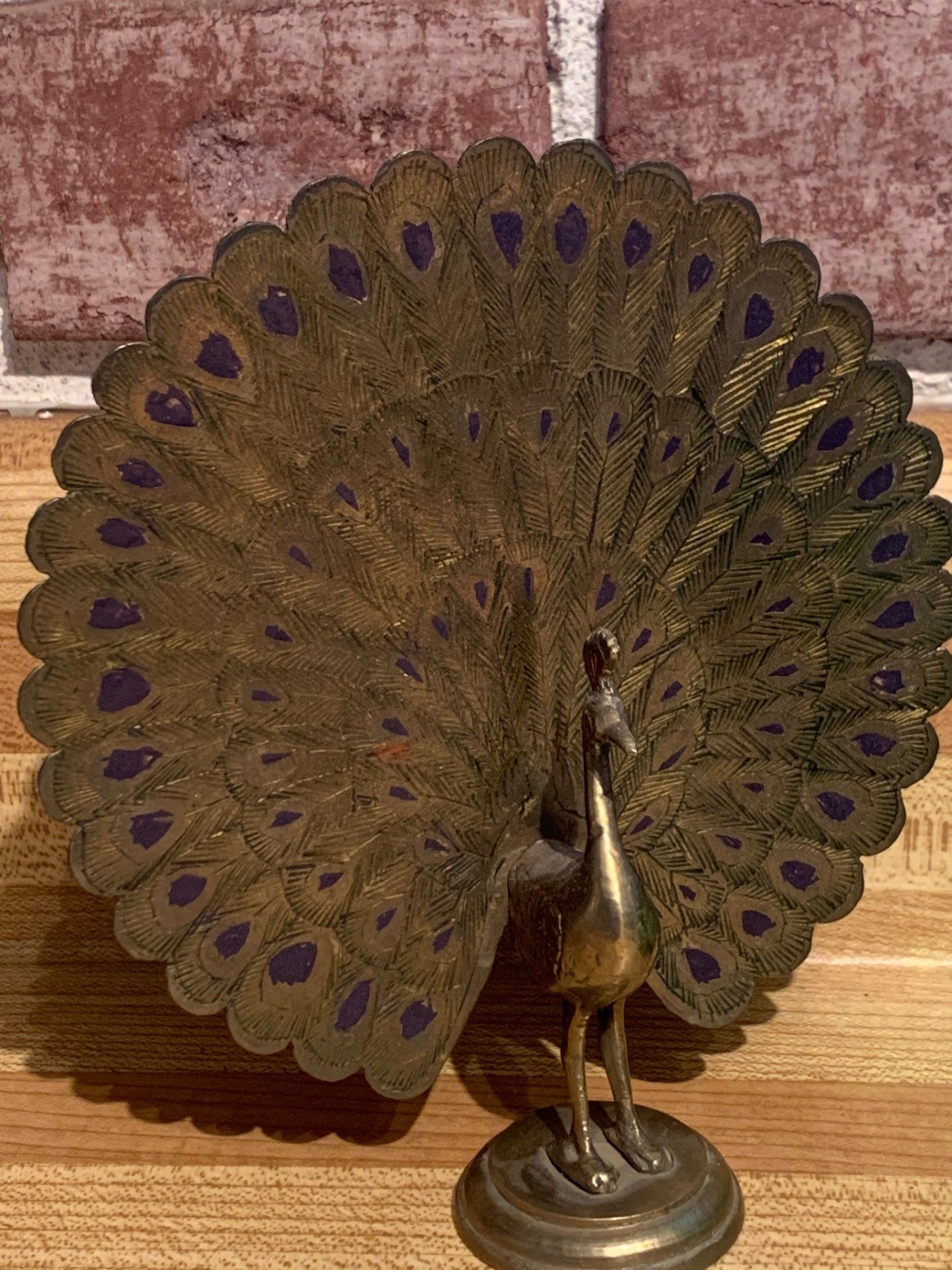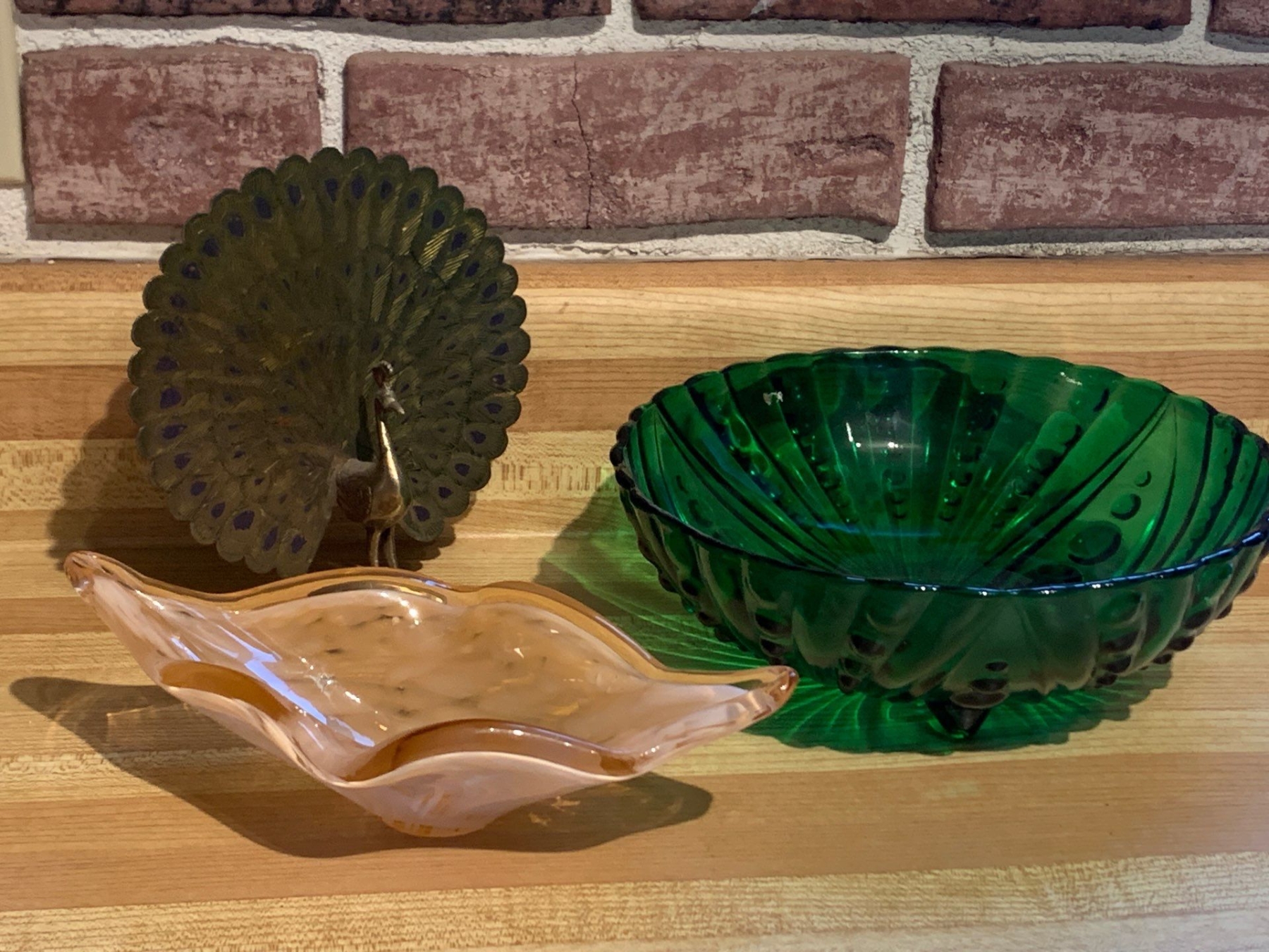 MCM Decor Lot Featuring Vintage Brass Peacock, Vintage Green Serving Dish and Vintage Art Deco Candy Dish