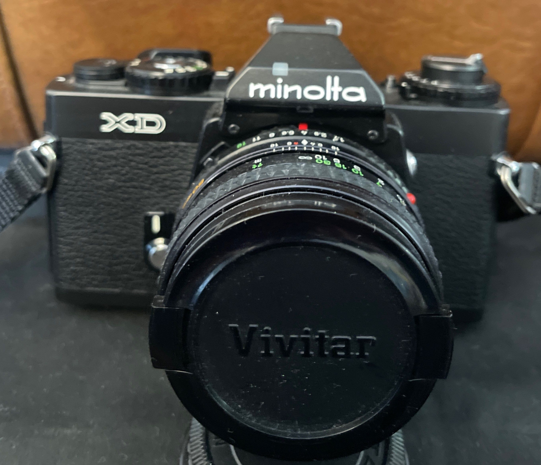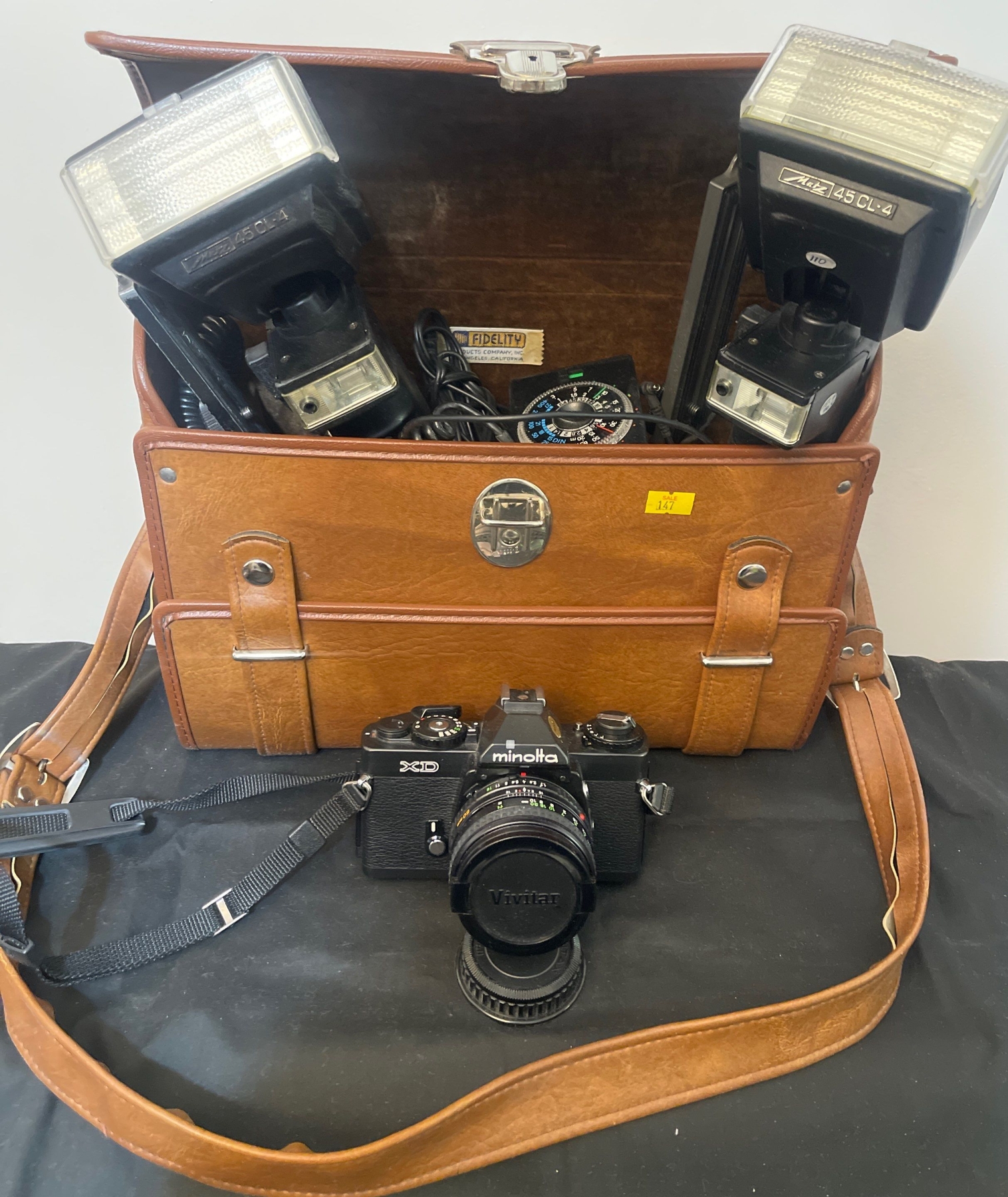 MINOLTA XD Camera w/ Flash Package in Leather Messenger Bag