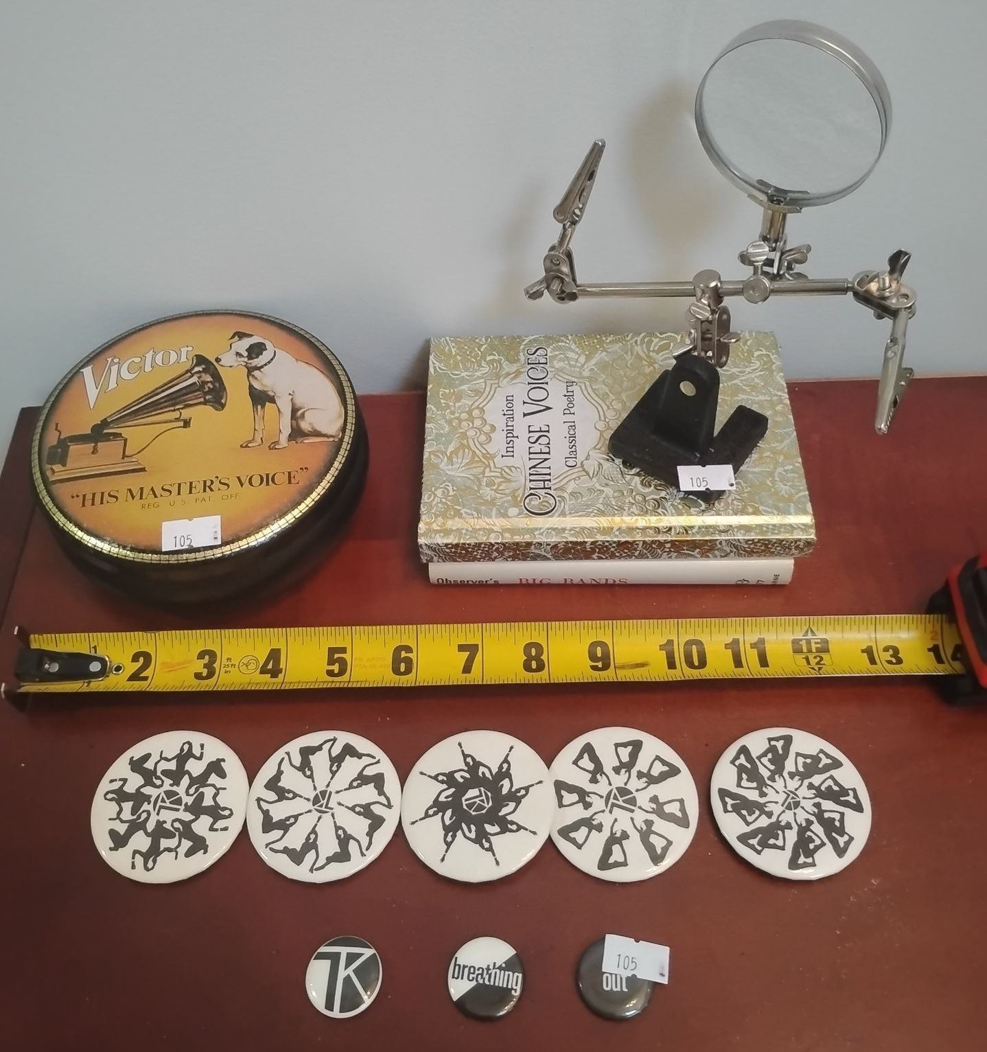 Magnification Apparatus on Stand w/ Vintage Tin & Pin/ Button Collection