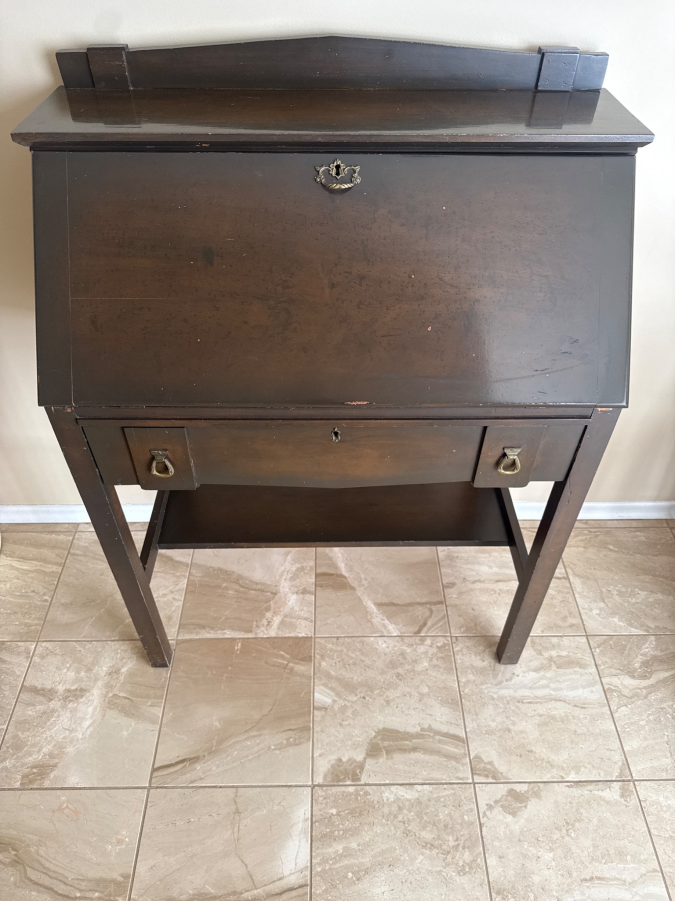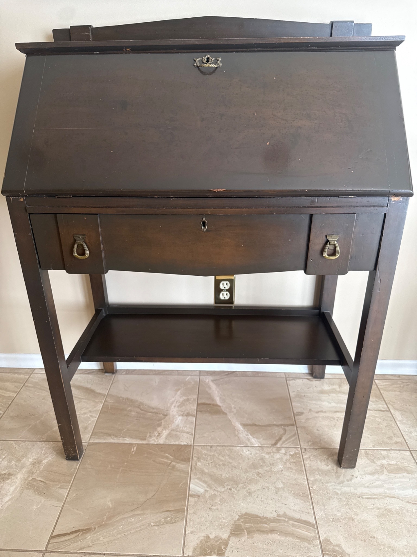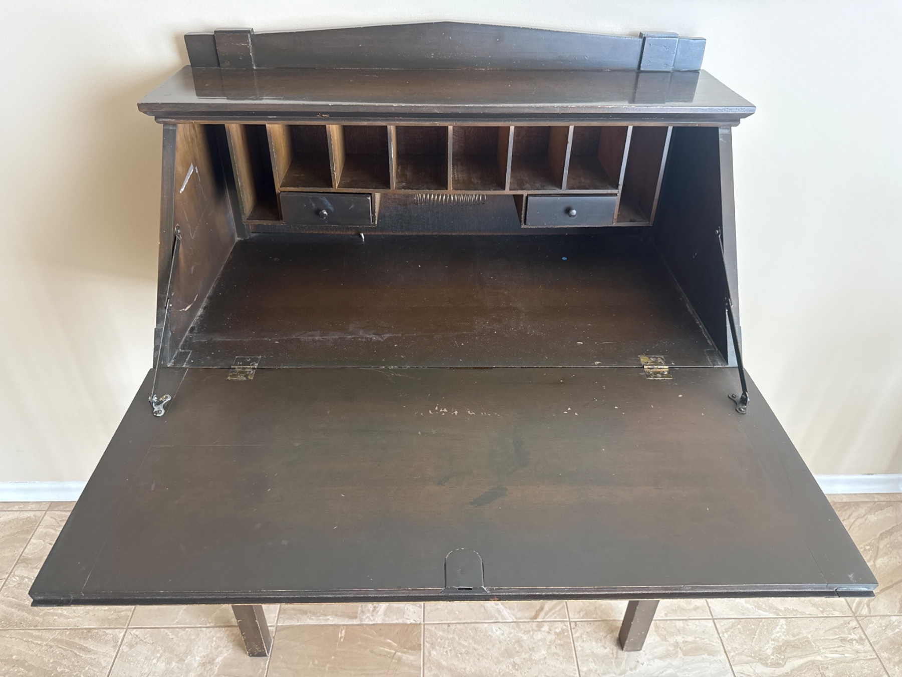 Mahogany secretary desk featuring a drop-front writing surface that opens to reveal multiple cubbyholes and two small drawers for organizing documents and supplies. Below the writing area, the desk includes a full-width drawer with brass handles and a lower shelf for additional storage. Structurally sound, showing some surface wear consistent with age and use. A functional addition to your home or office.
