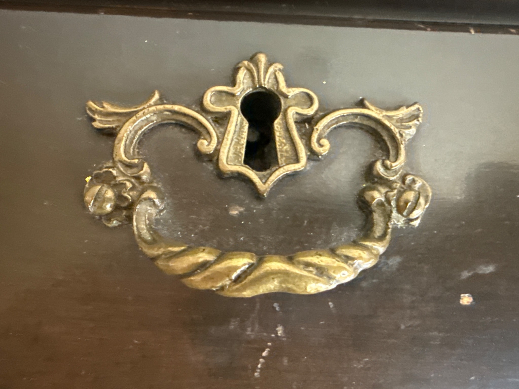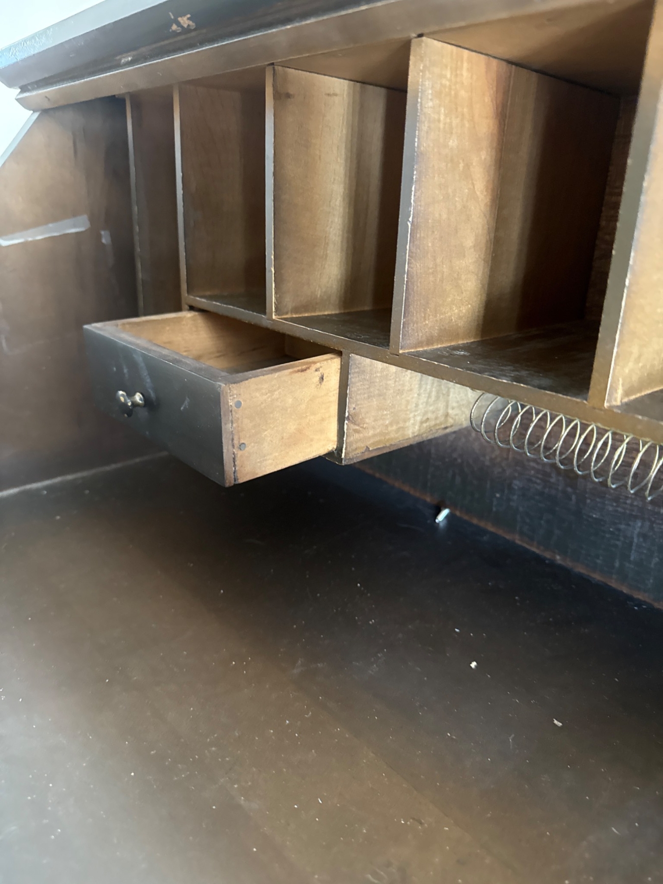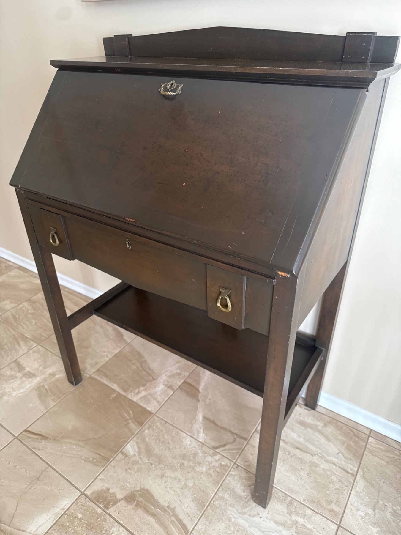 Mahogany secretary desk featuring a drop-front writing surface that opens to reveal multiple cubbyholes and two small drawers for organizing documents and supplies. Below the writing area, the desk includes a full-width drawer with brass handles and a lower shelf for additional storage. Structurally sound, showing some surface wear consistent with age and use. A functional addition to your home or office.