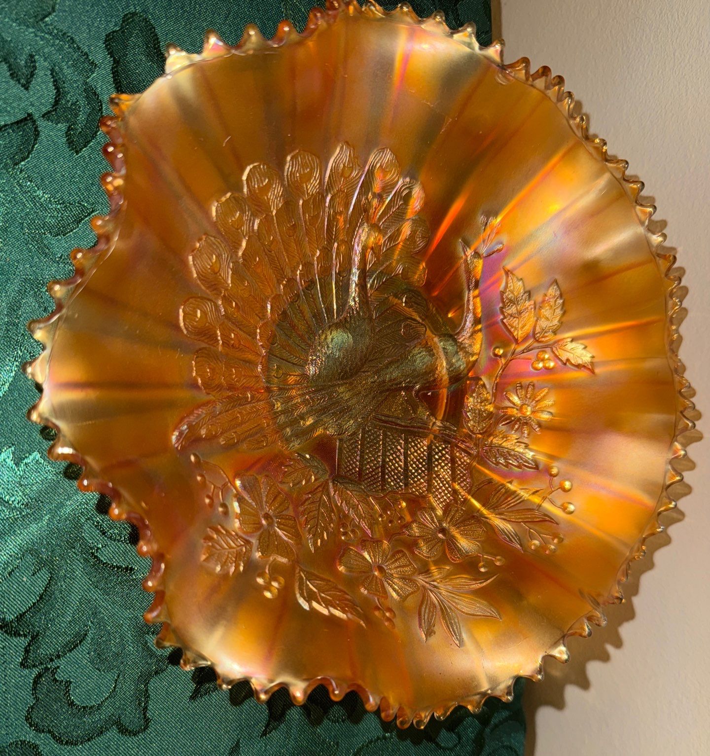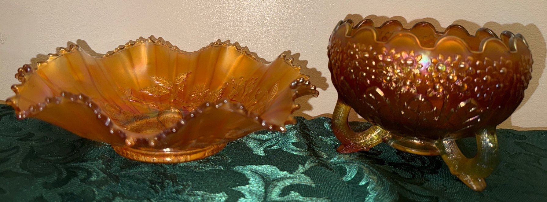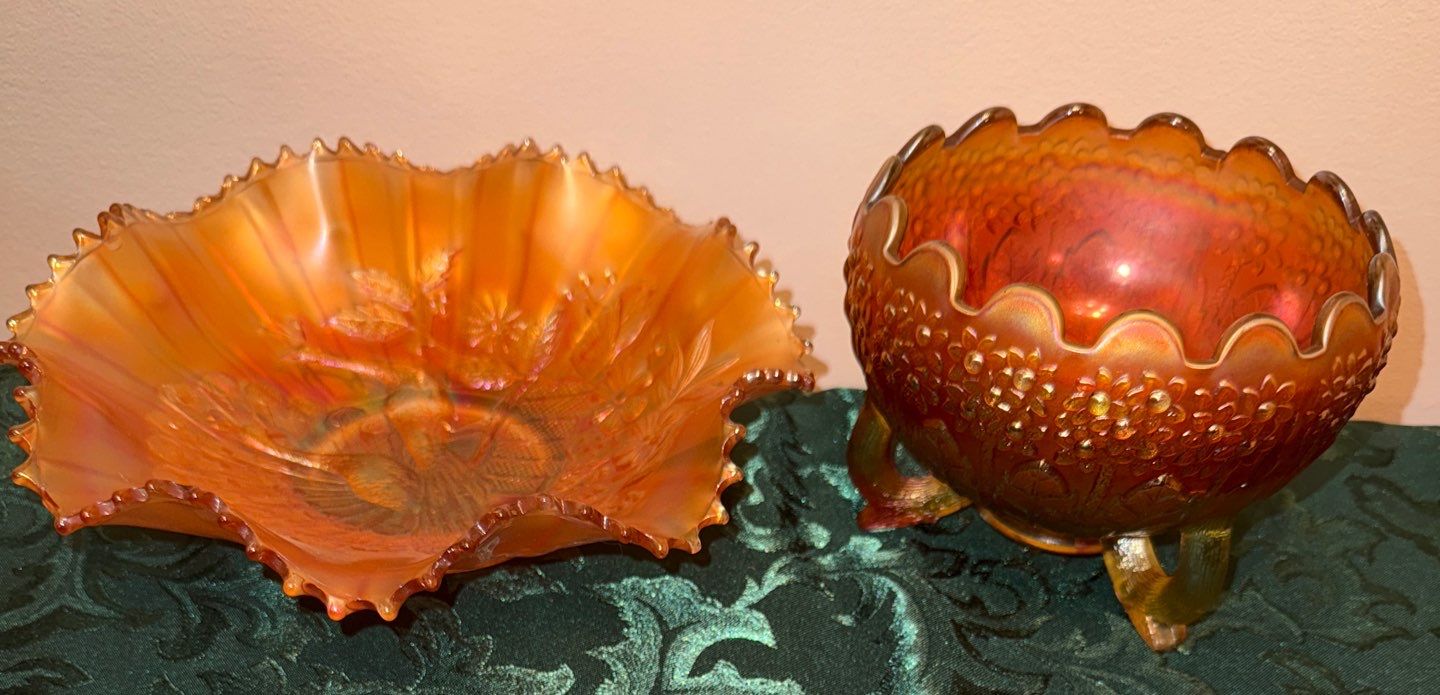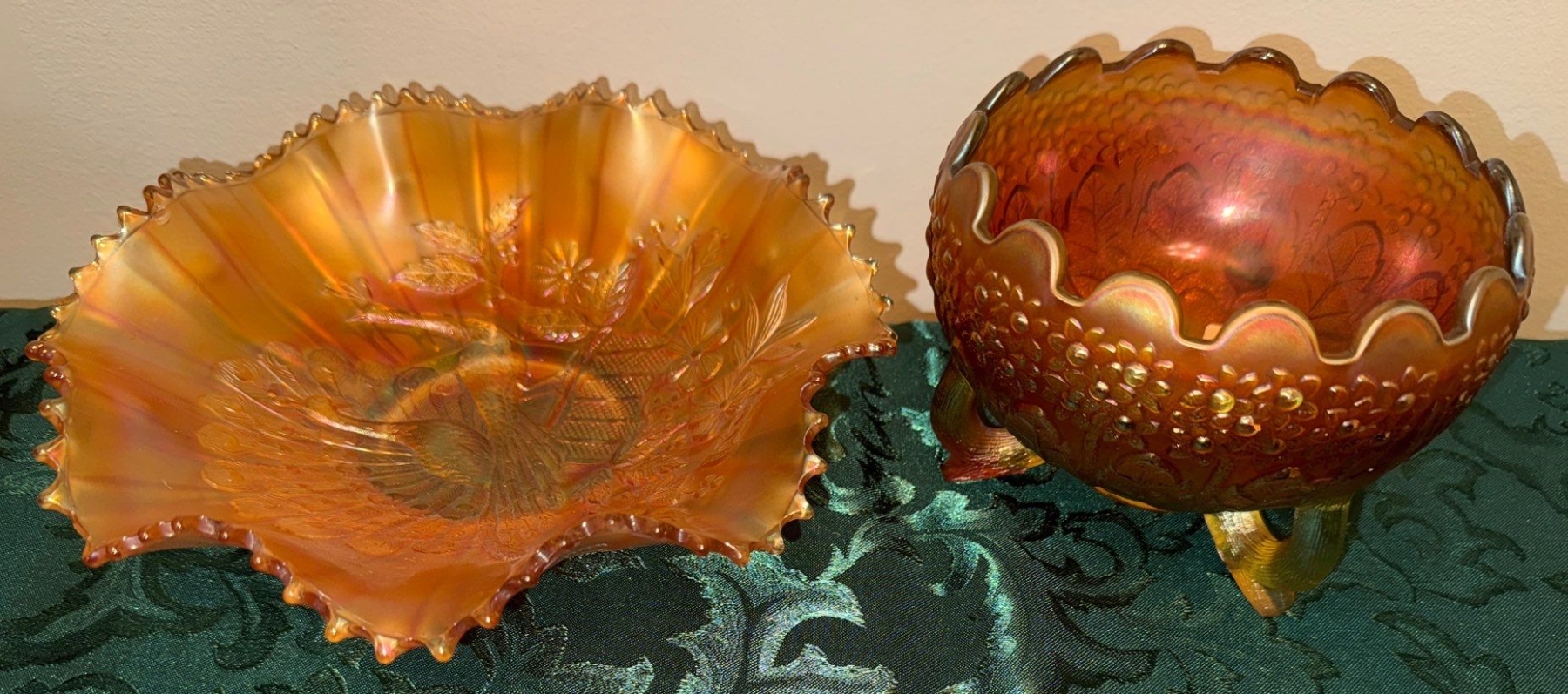 Marigold Carnival Glass By Northwood-Peacocks on The Fence & Powder Blue Rosebowl (Cracked)