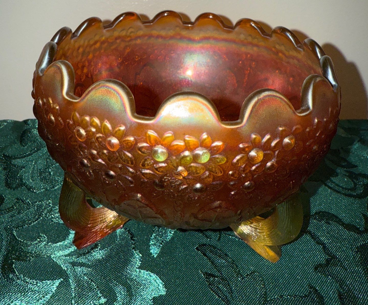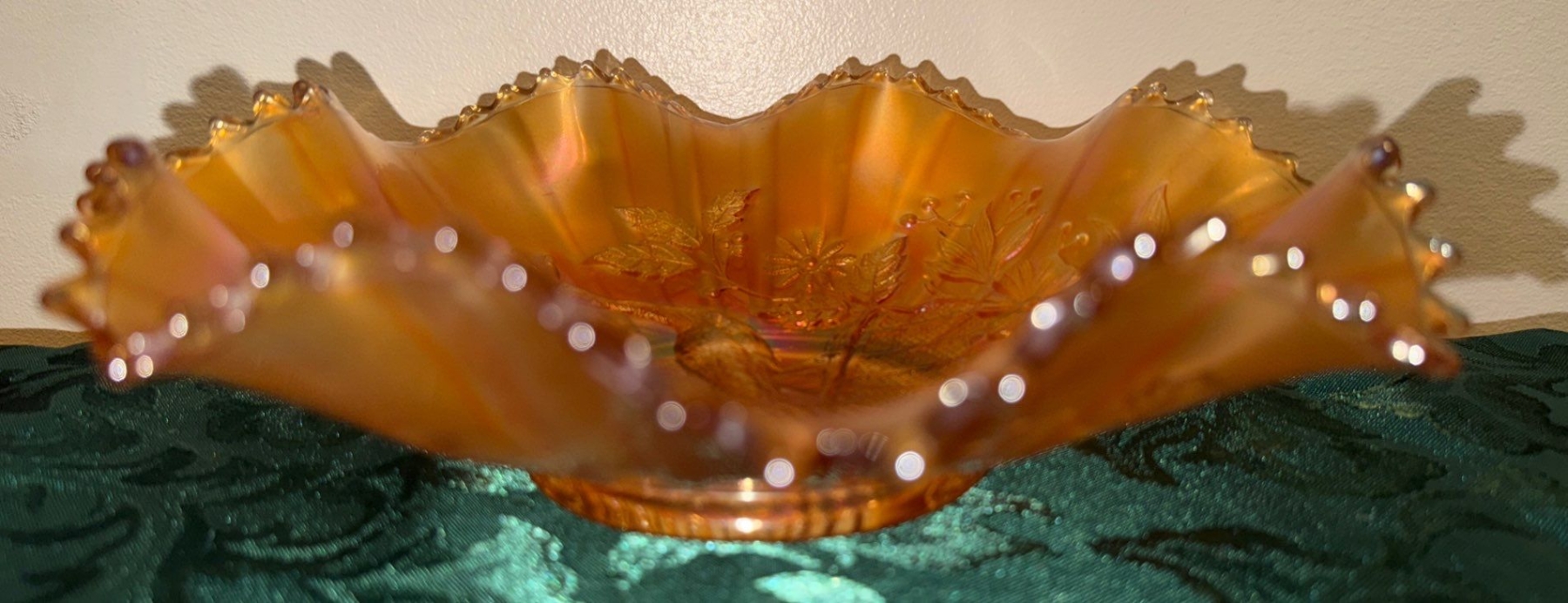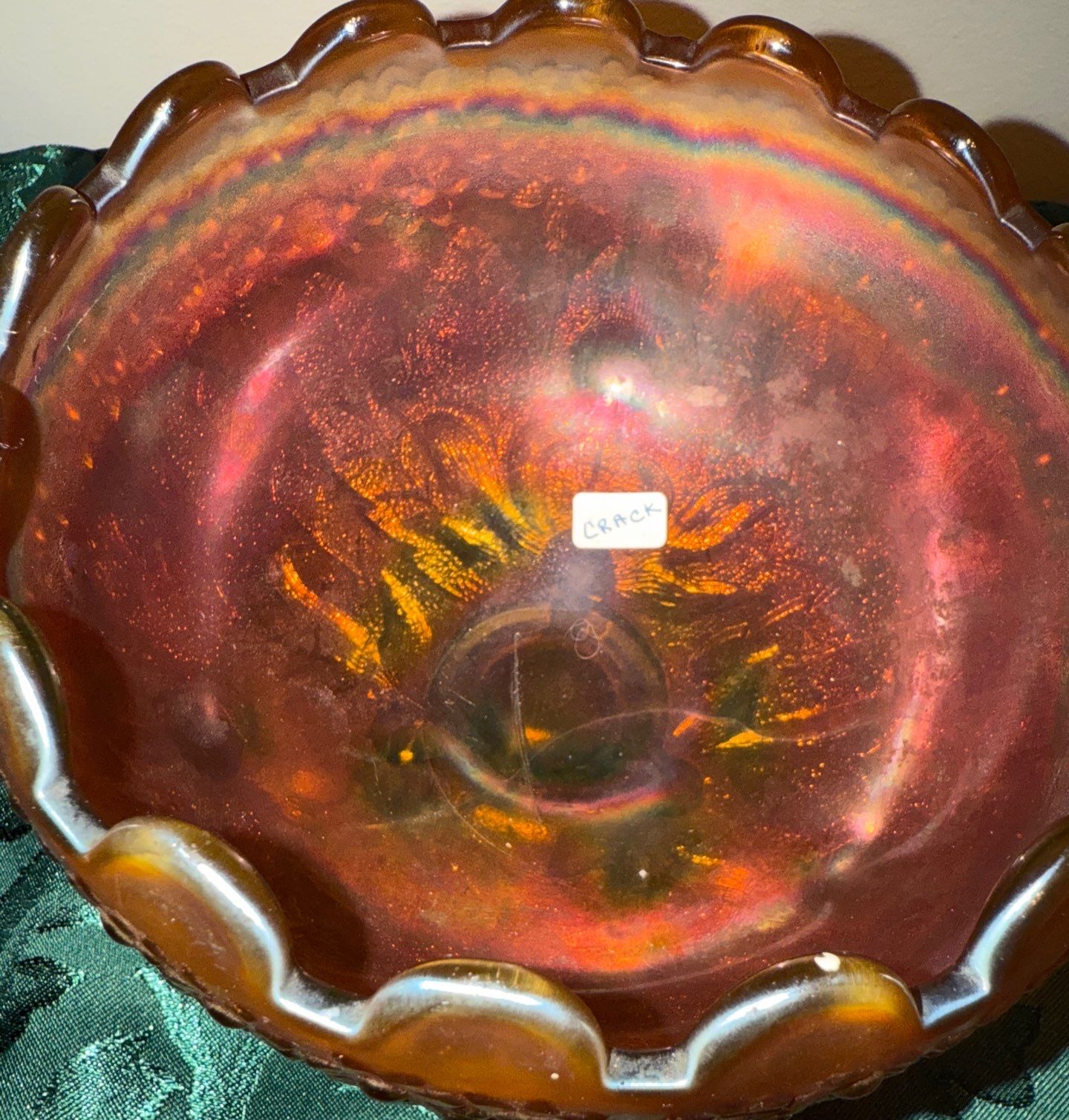 Marigold Carnival Glass By Northwood-Peacocks on The Fence & Powder Blue Rosebowl (Cracked)