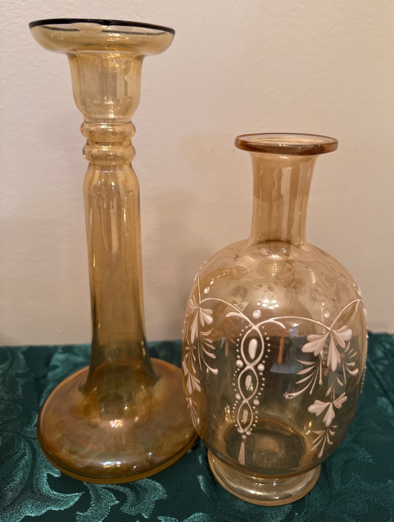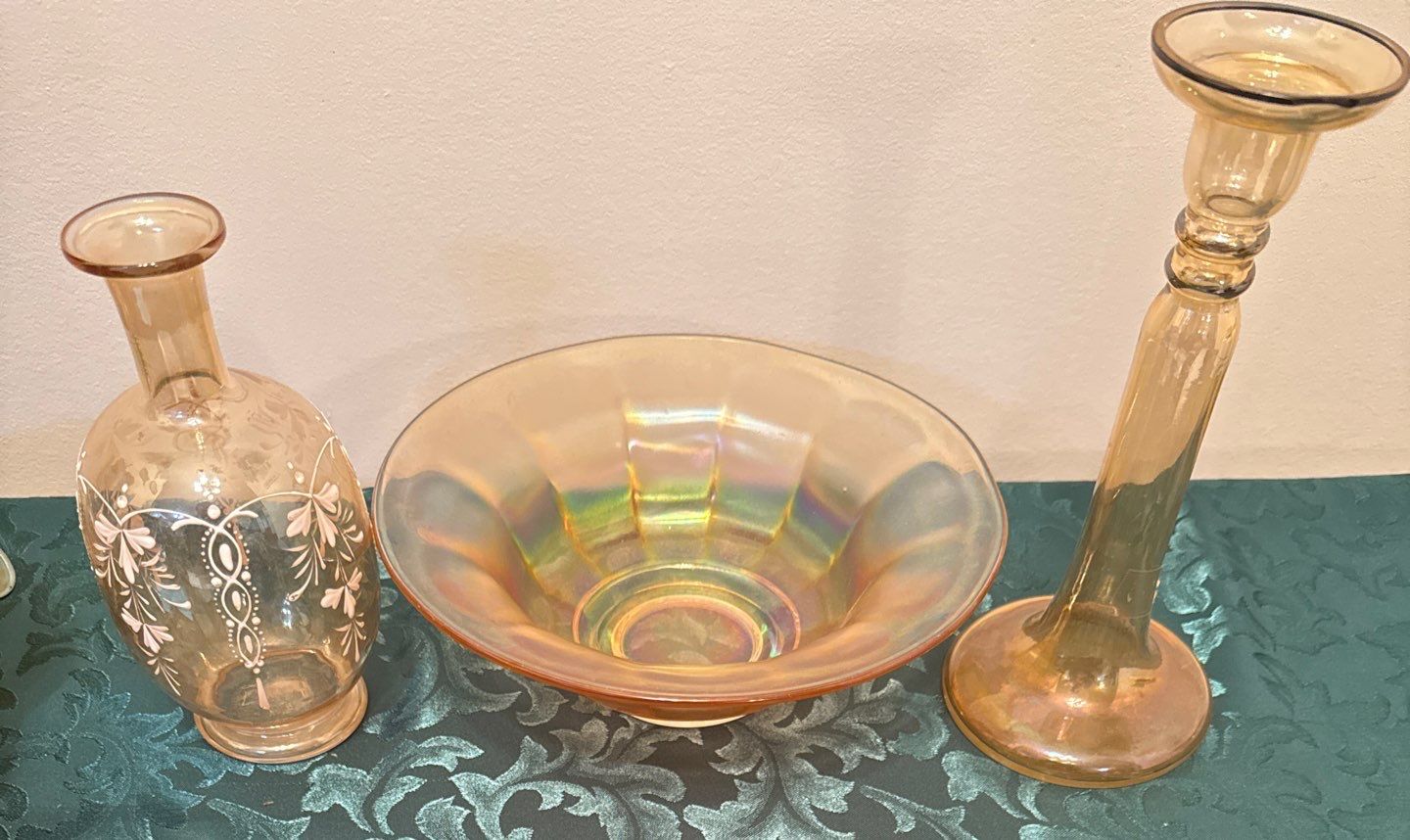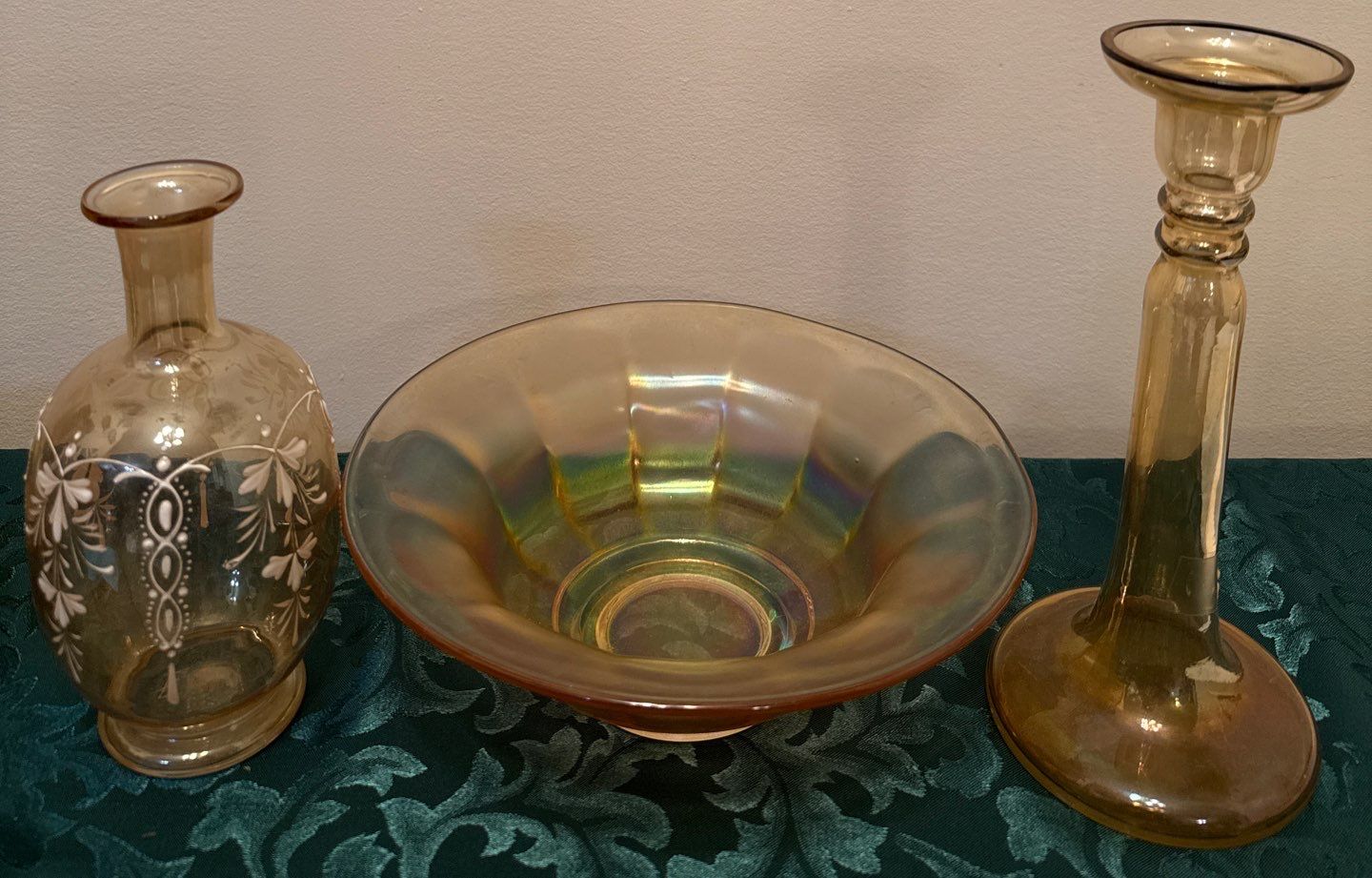 Marigold Carnival Glass Halloween Candle Stick & Wide Panel Clambroth Bowl-Imperial Co