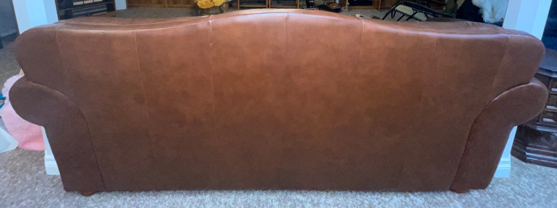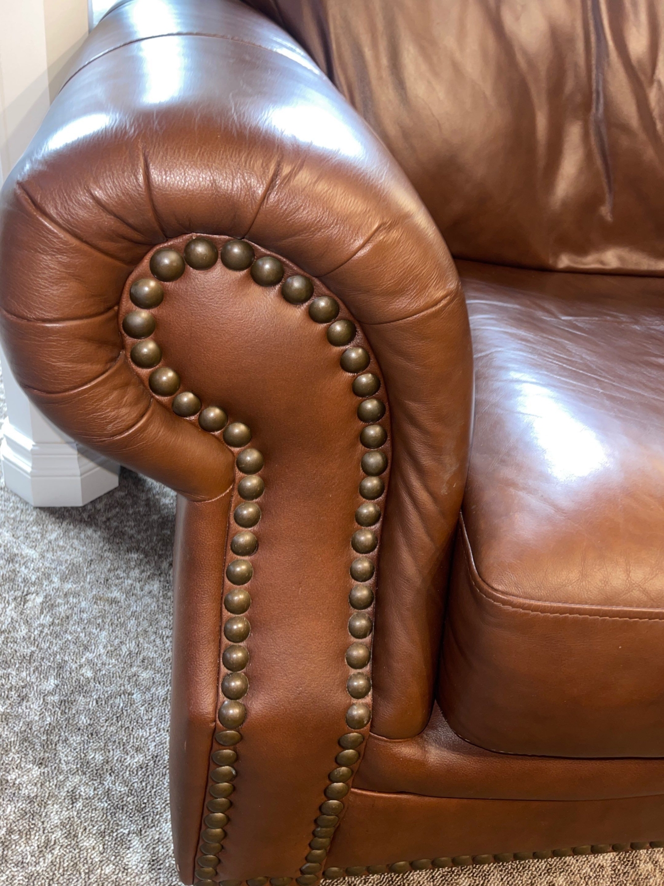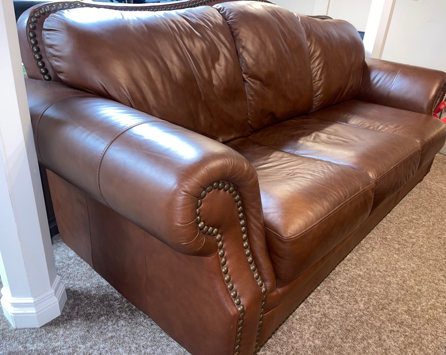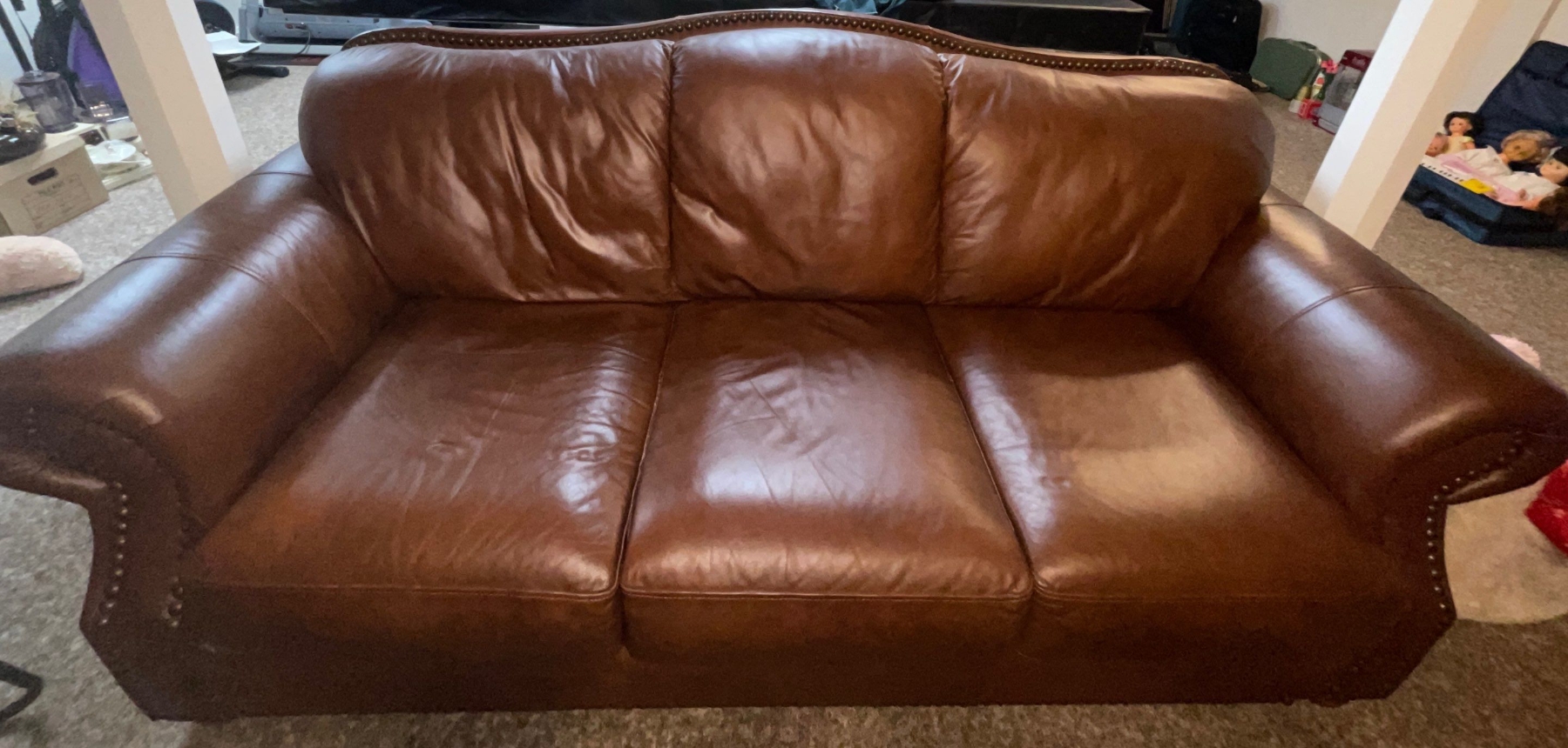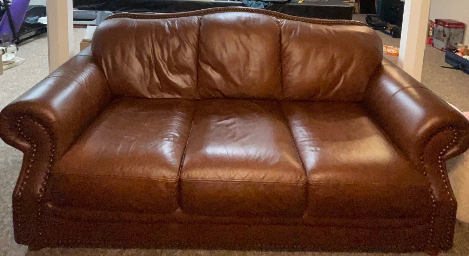 Maroon Studded Three Cushioned Leather Sofa/Couch Comfy & Distressed 62"w x38"d x 45"tall