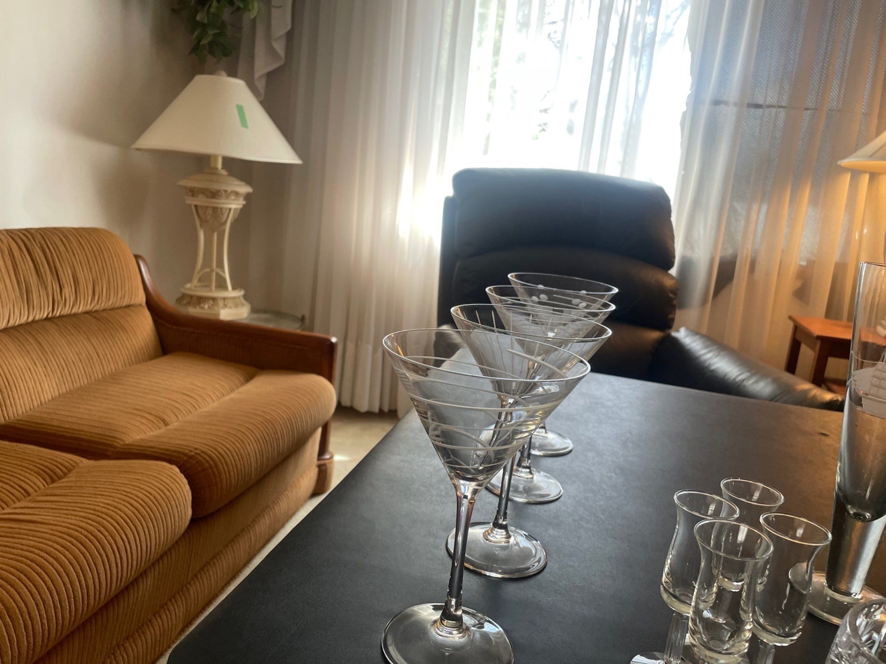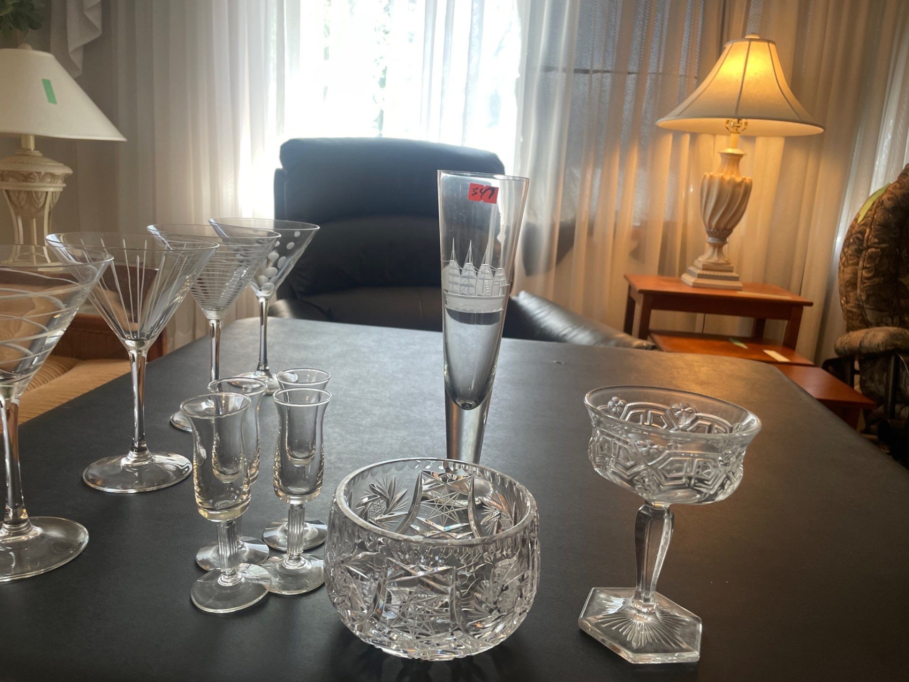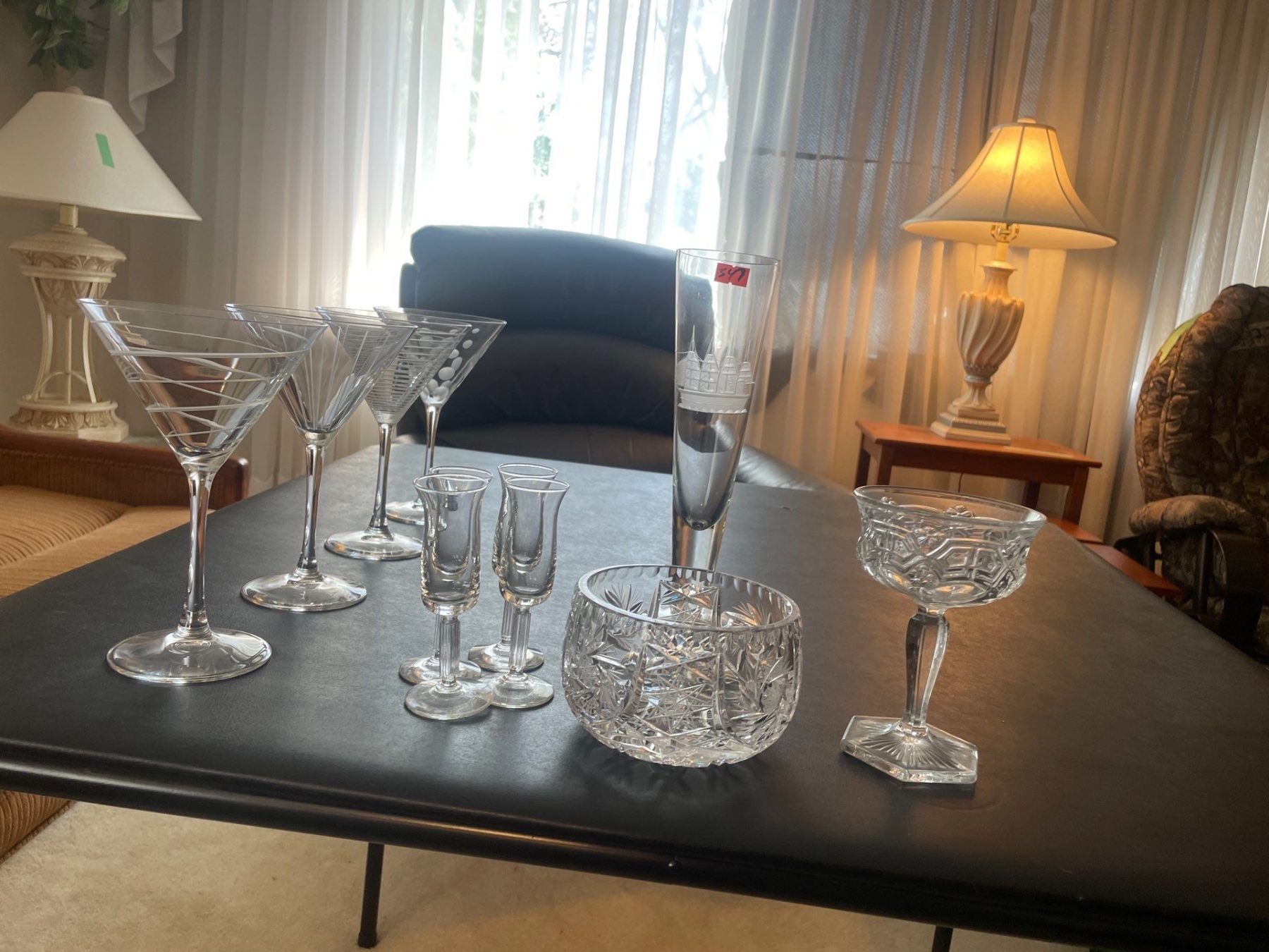 Martini Glasses (4), Beer Glass (1), Liquor Glasses ($), Crystal Champagne Glass (1), Crystal Candy Dish (1).