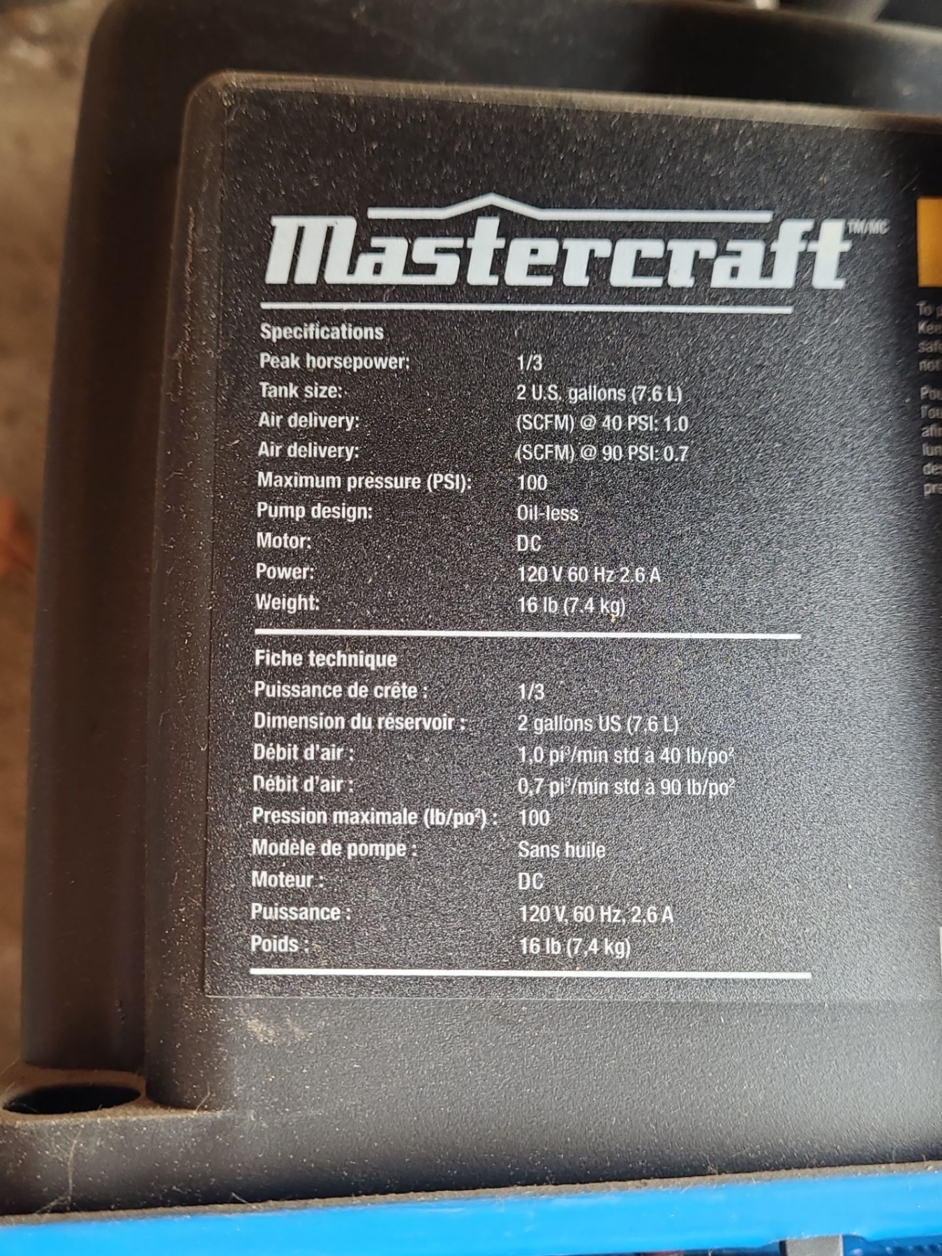 Mastercraft Air Compressor Model 58-7000-2