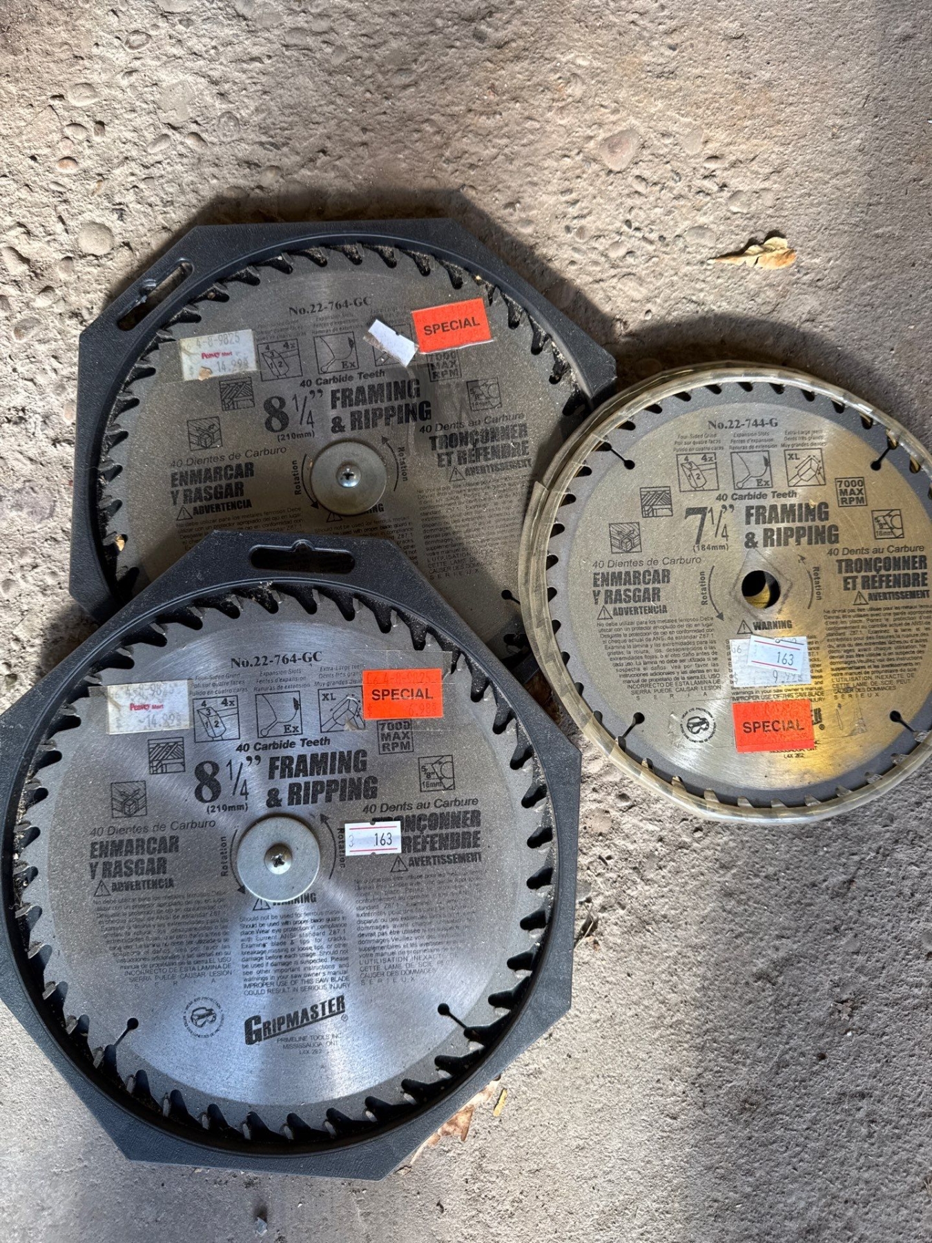 Mastercraft saw blade clock and 7 1/4 frame and ripping saw blades and two packs of 8 1/4 framing and ripping saw blades