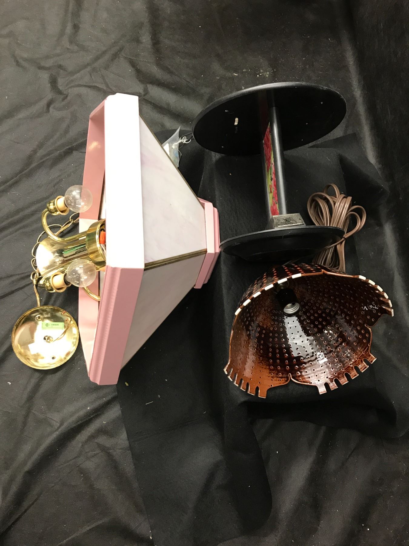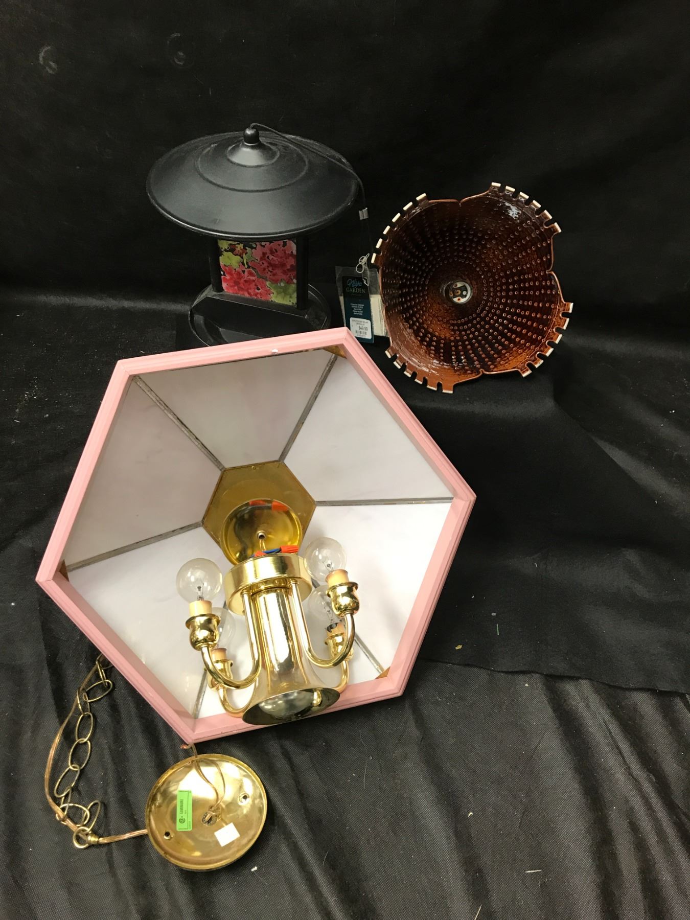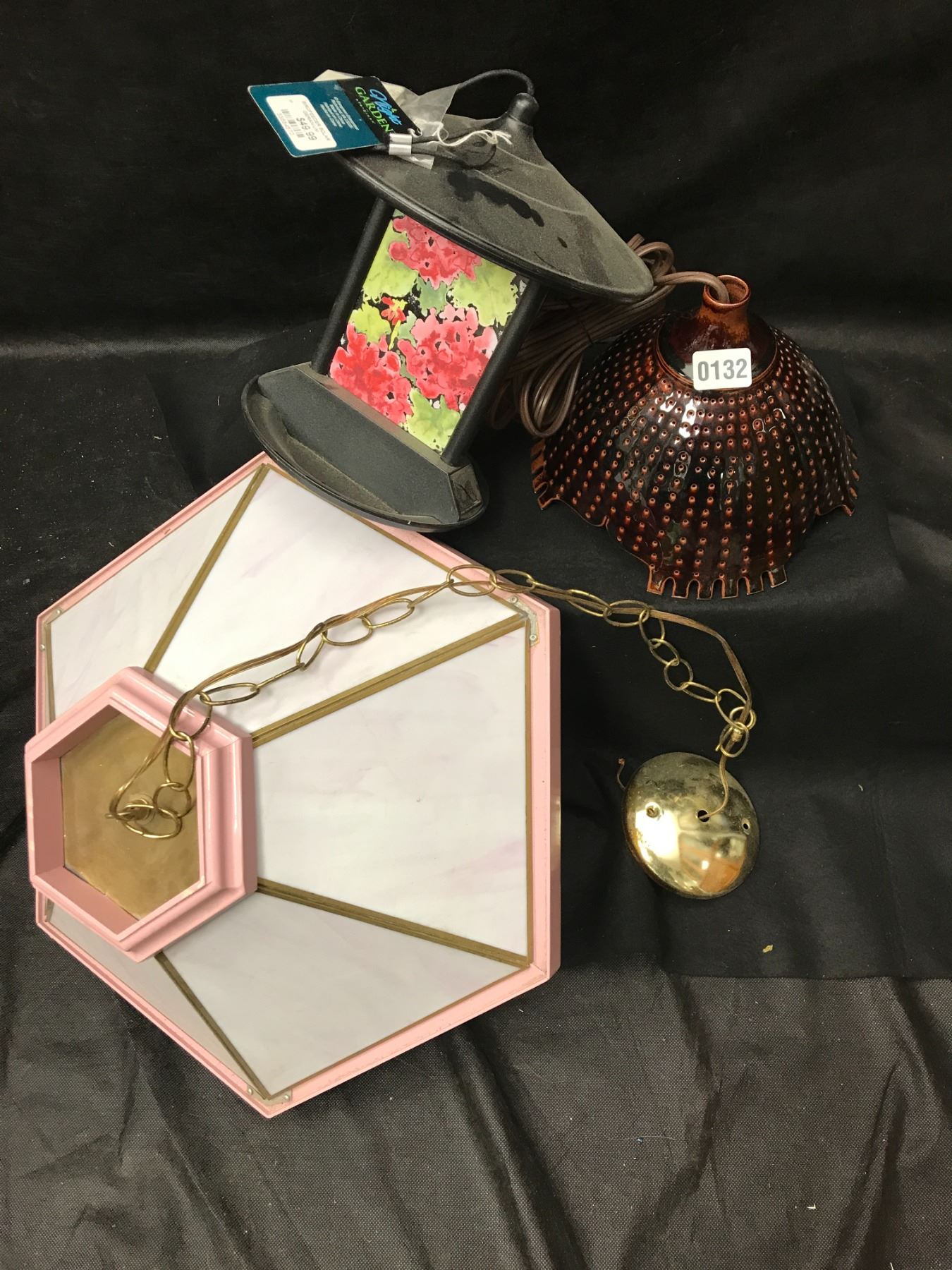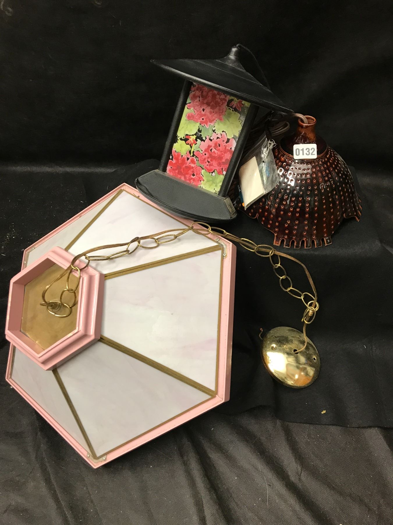 Mauve & Brass Swag Light, Porcelain Hanging Light & Colourful Bird Feeder