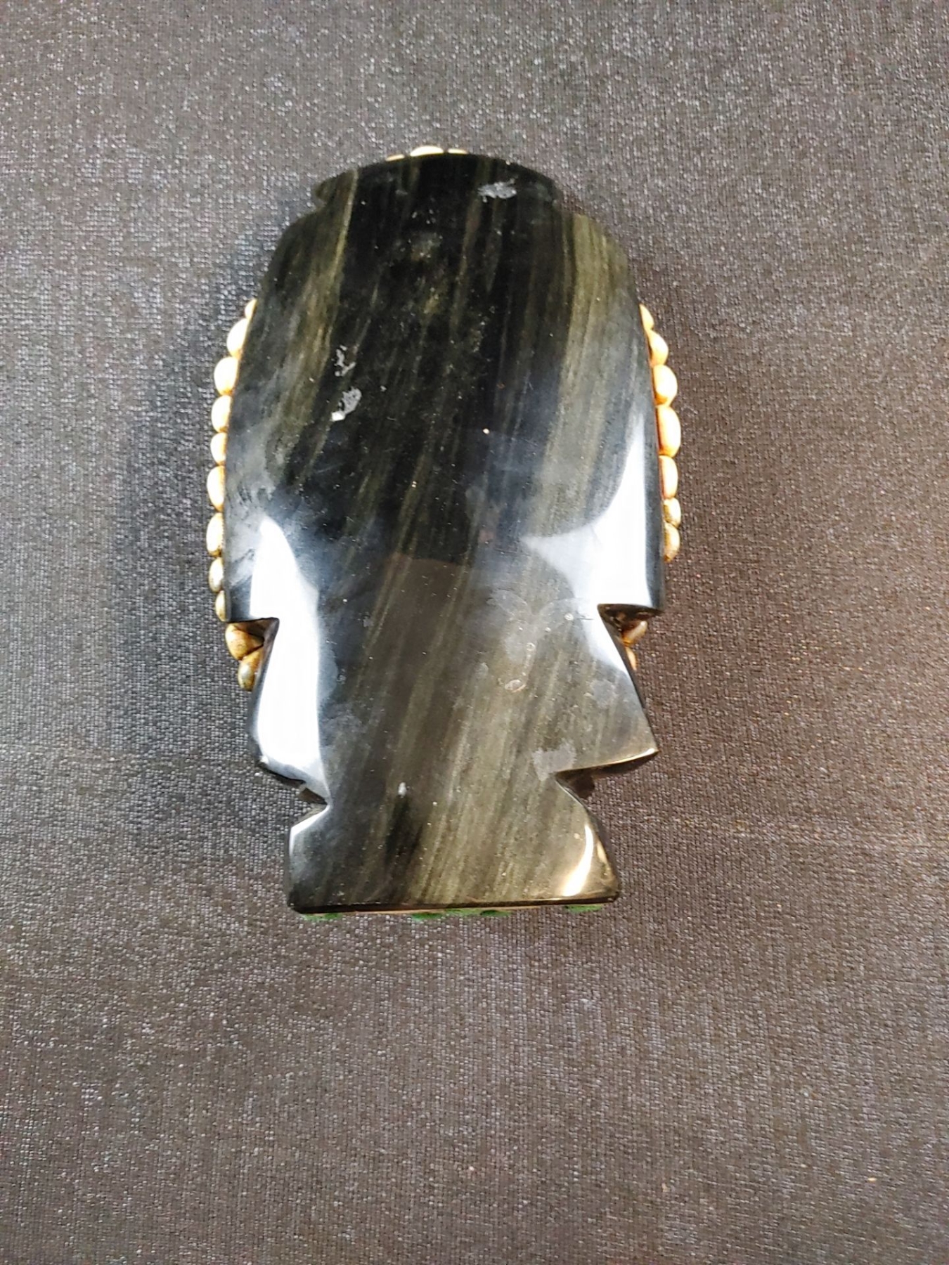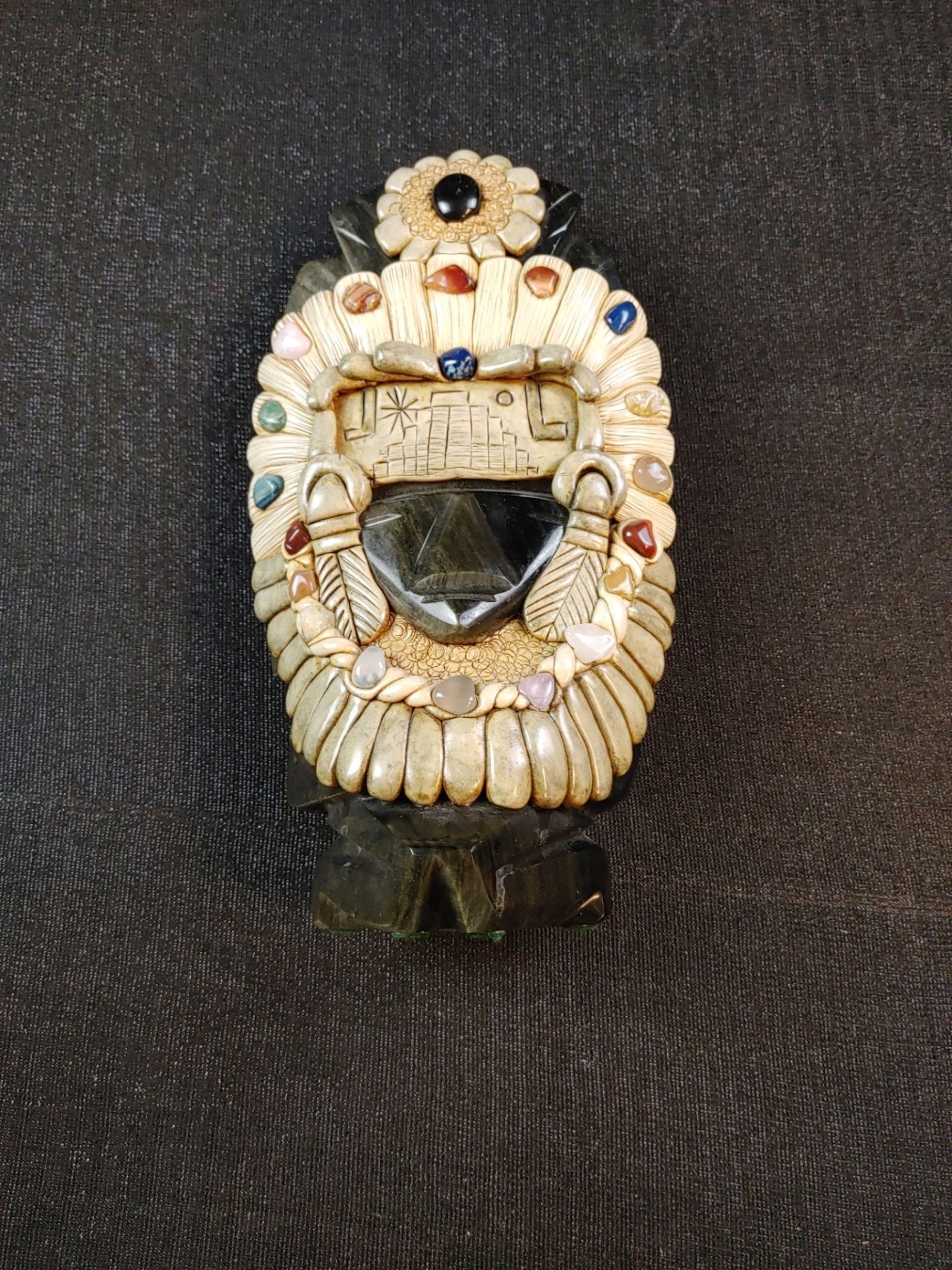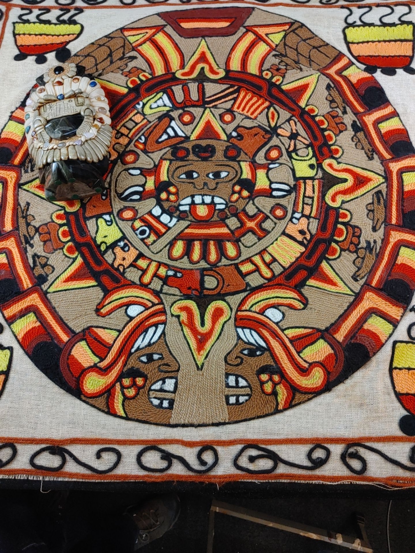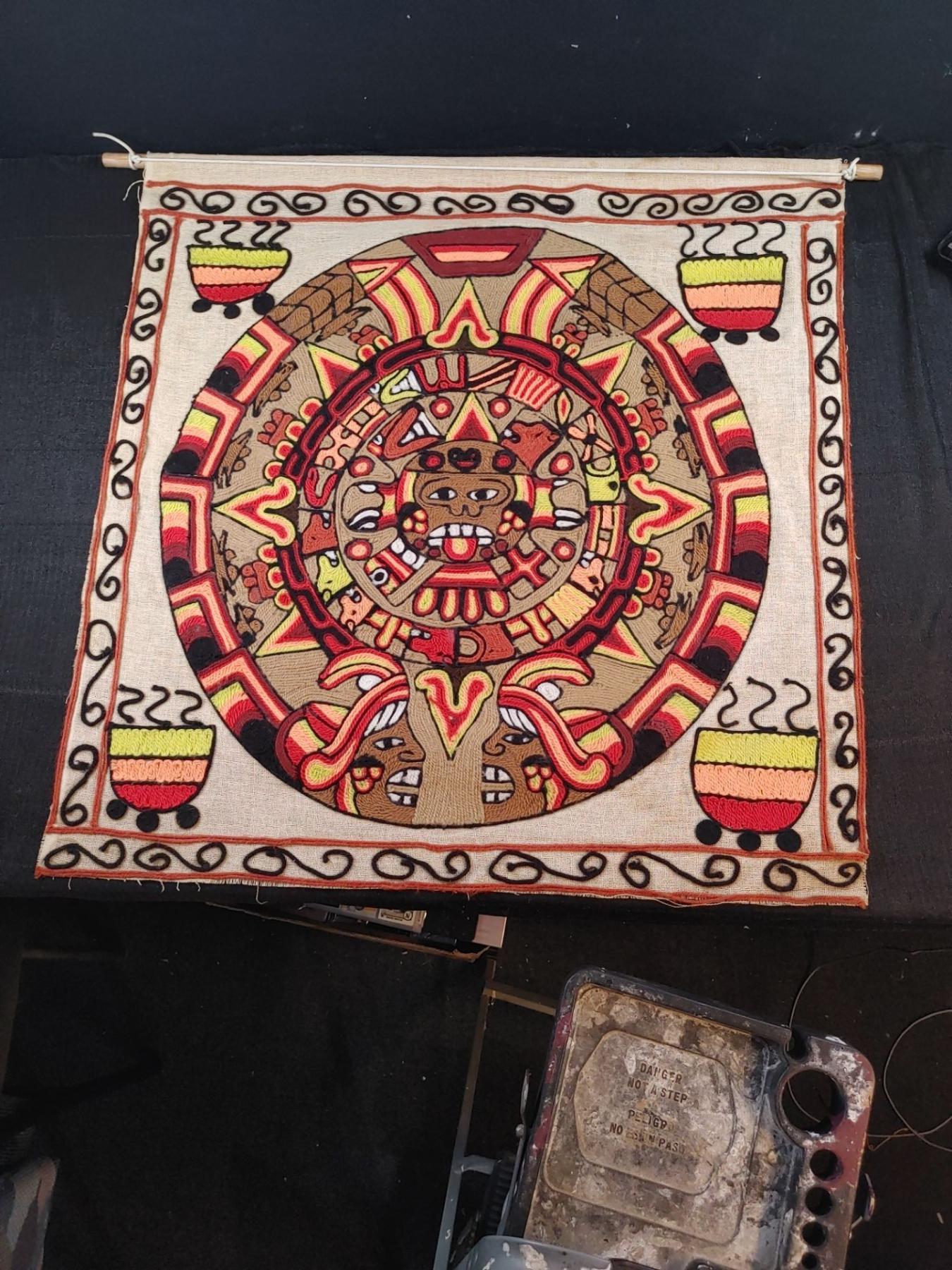 Mayan Calendar Wall Hanging Wool 35 x 33w & Gem Stone & Shell & Shaman Statue 10.5H
