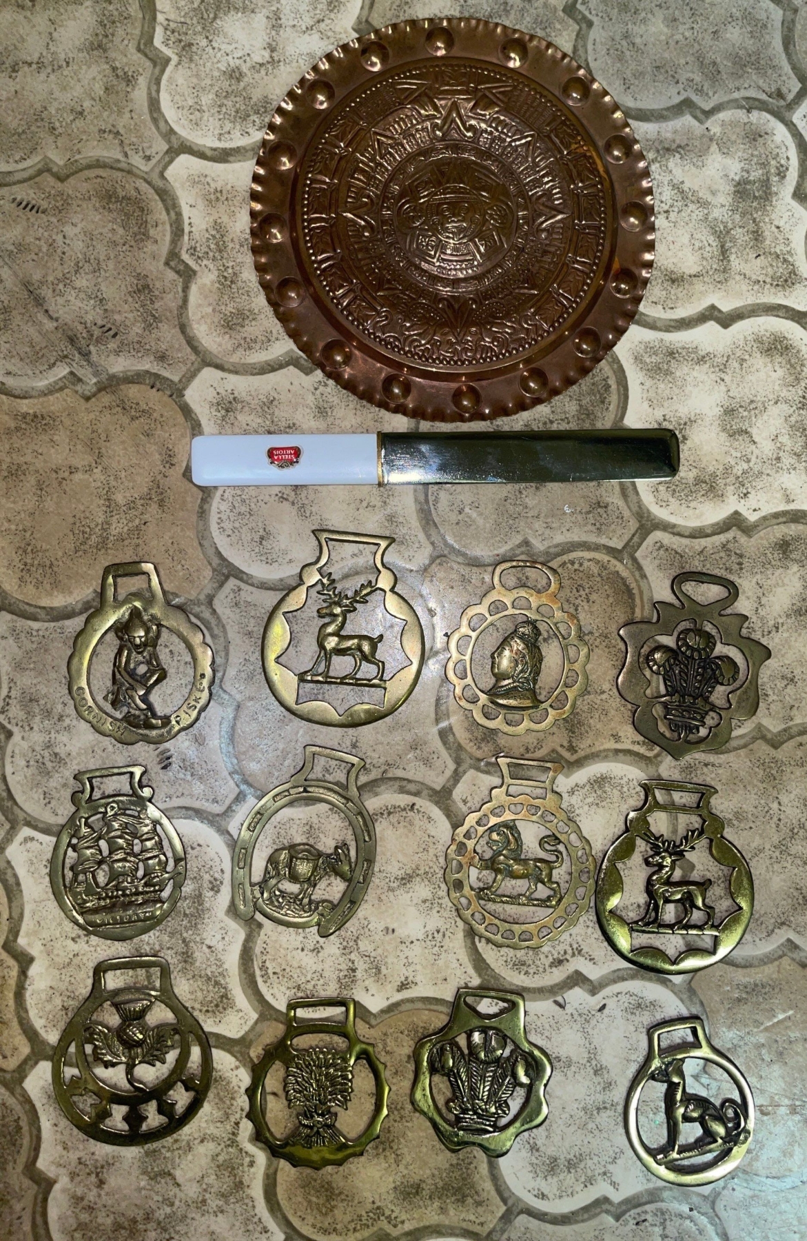 Mayan Calender Bronze Disk w/ A Dozen Vintage Horse Brasses