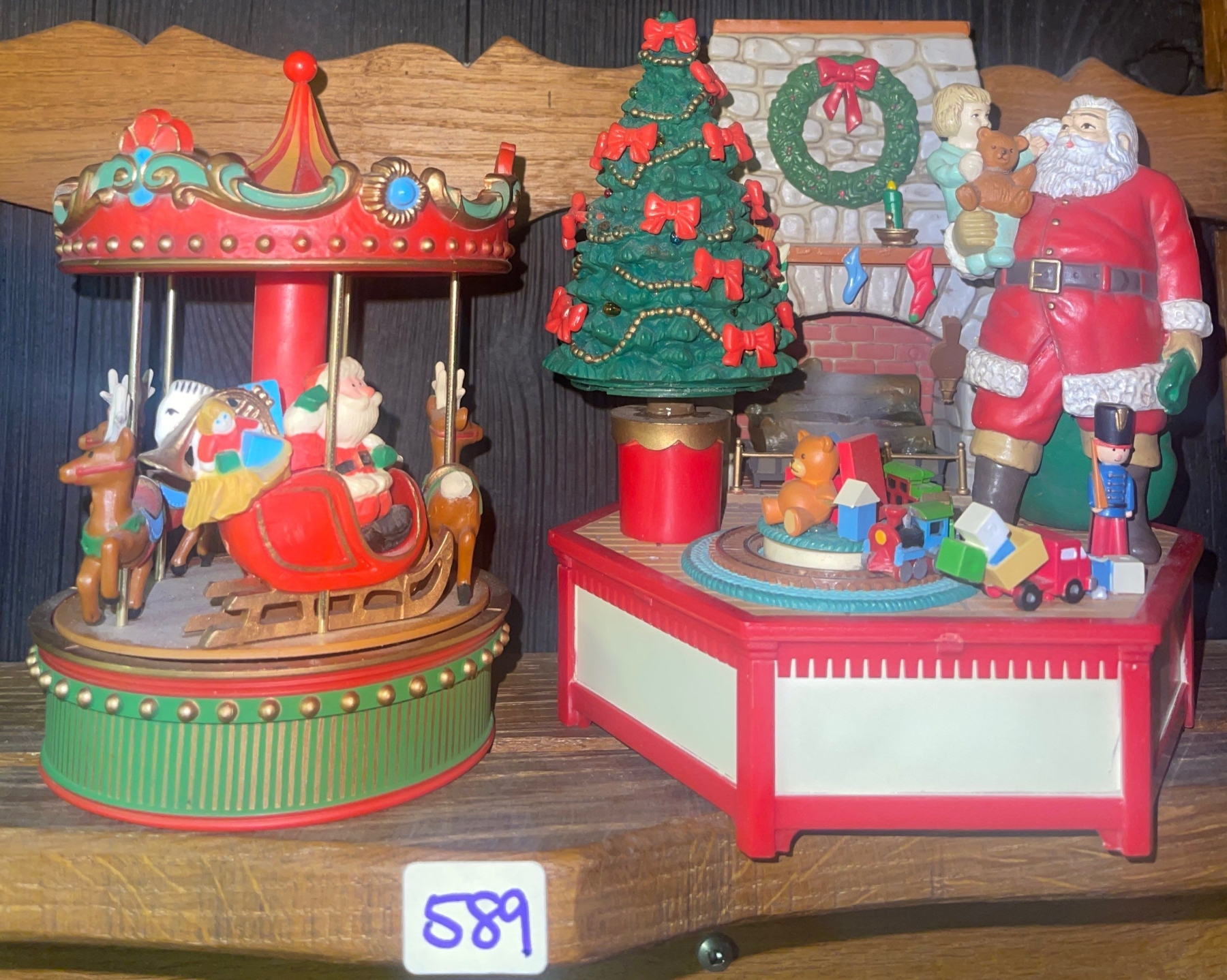 Mechanical Music Makers Christmas Rotating Carosel w/ Santa Testing Train Set By The Fireplace