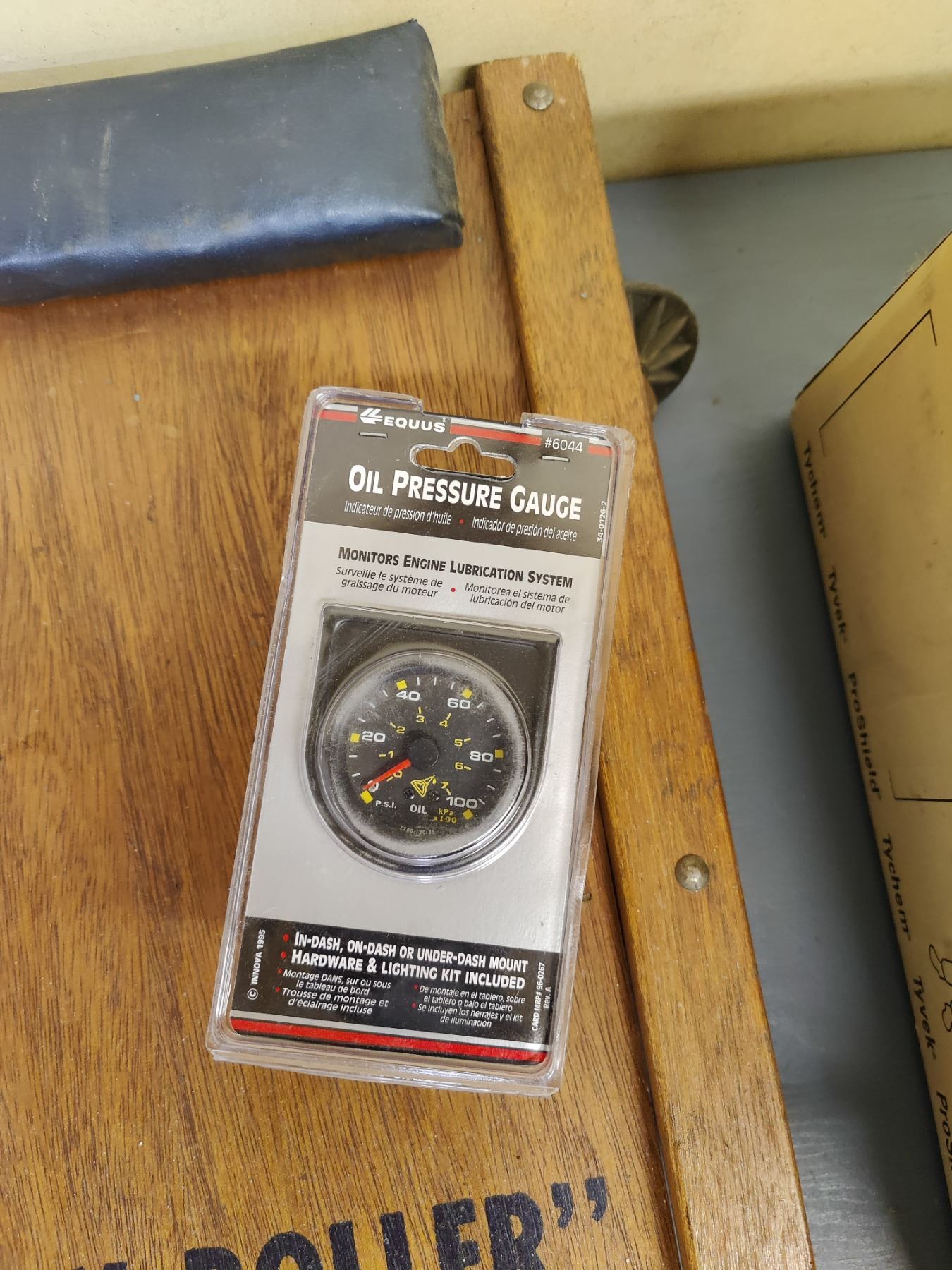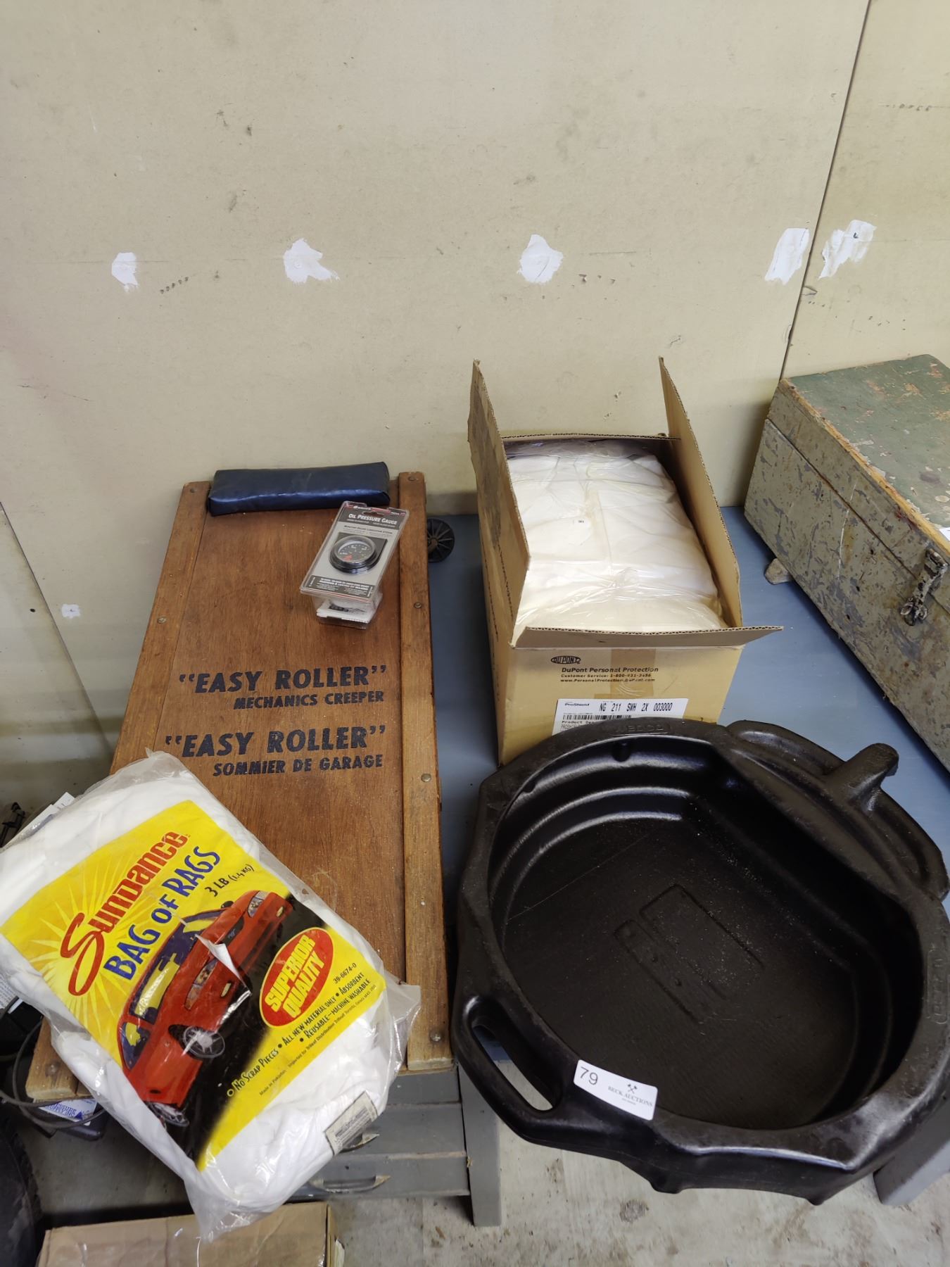 Mechanics creeper, oil pressure gauge, oil pan, labcoat, a bag of rags.