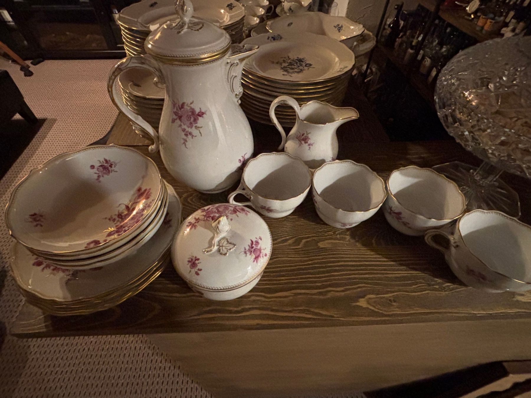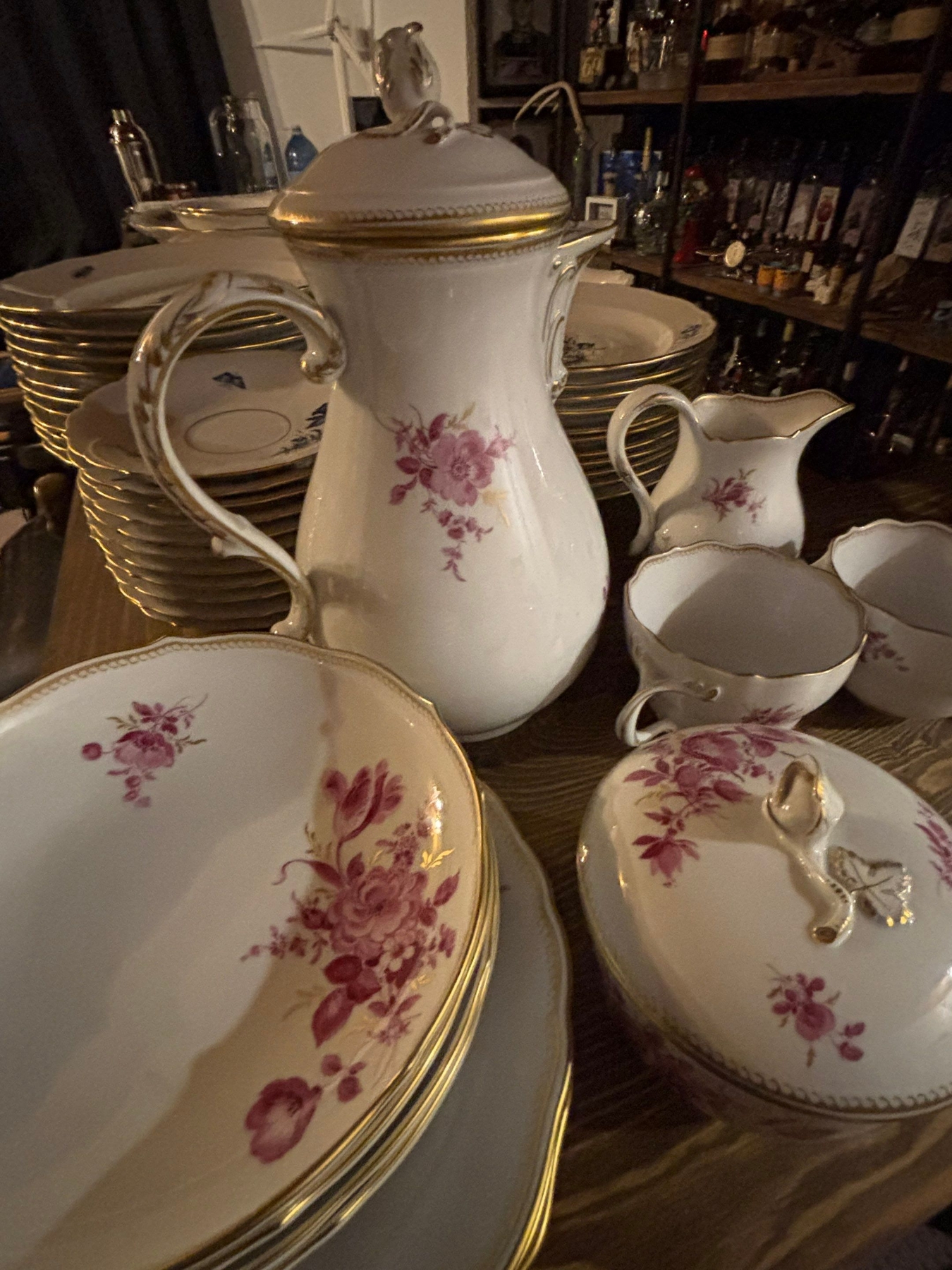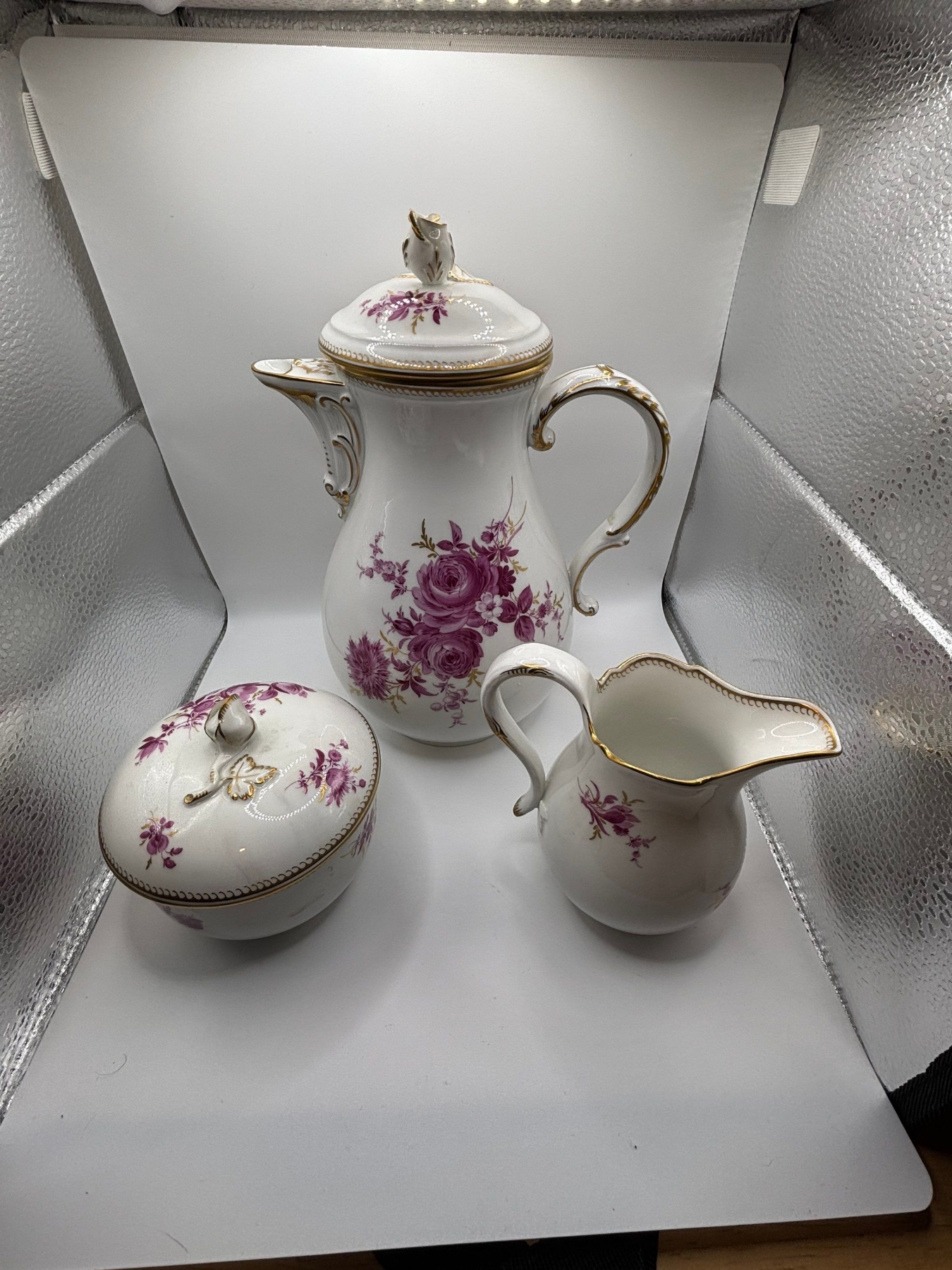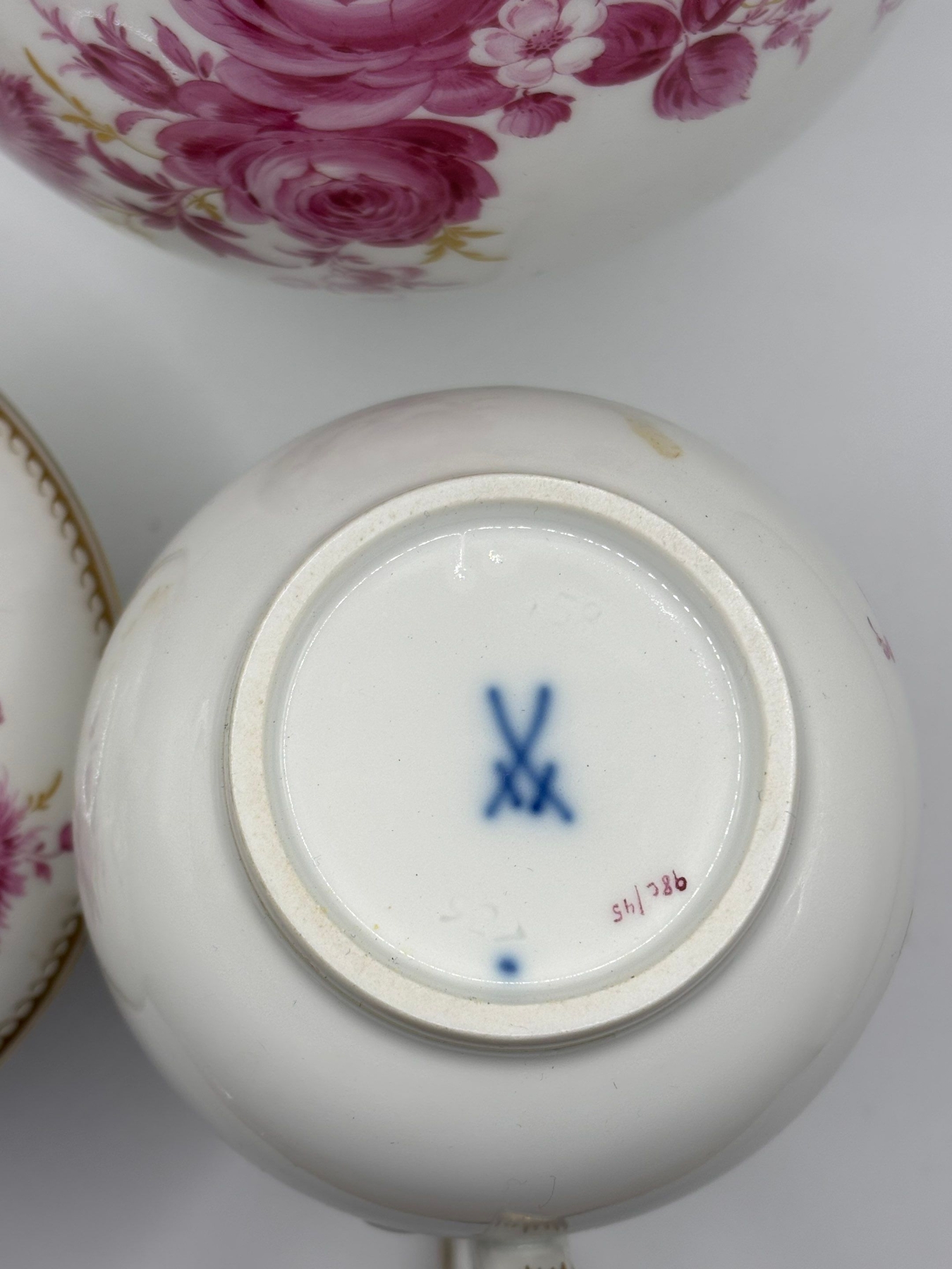 Meissen porcelain Gold pink flower Bouquet Tea cups & saucers cake plates teapot with sugar & cream bowls