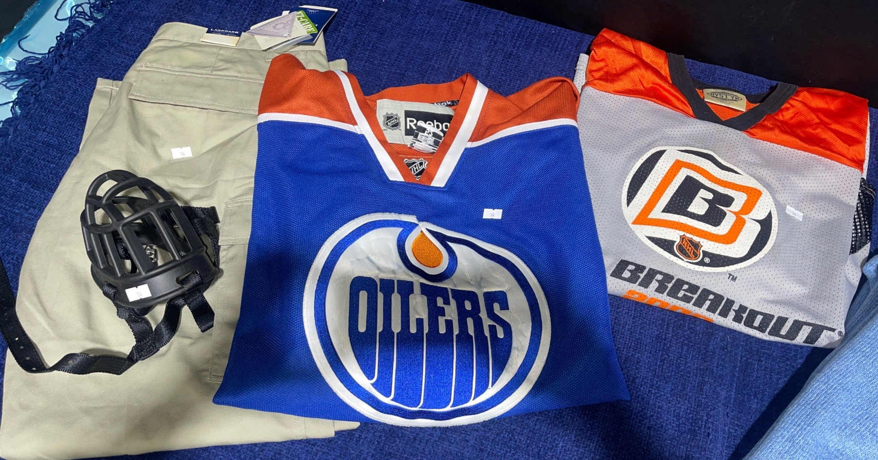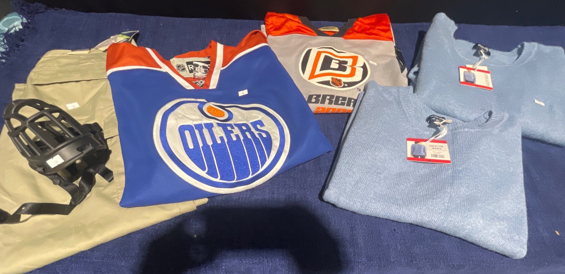 Men's Clothing Bundle  Oilers Jersey, Jock Cage, Sweaters & More