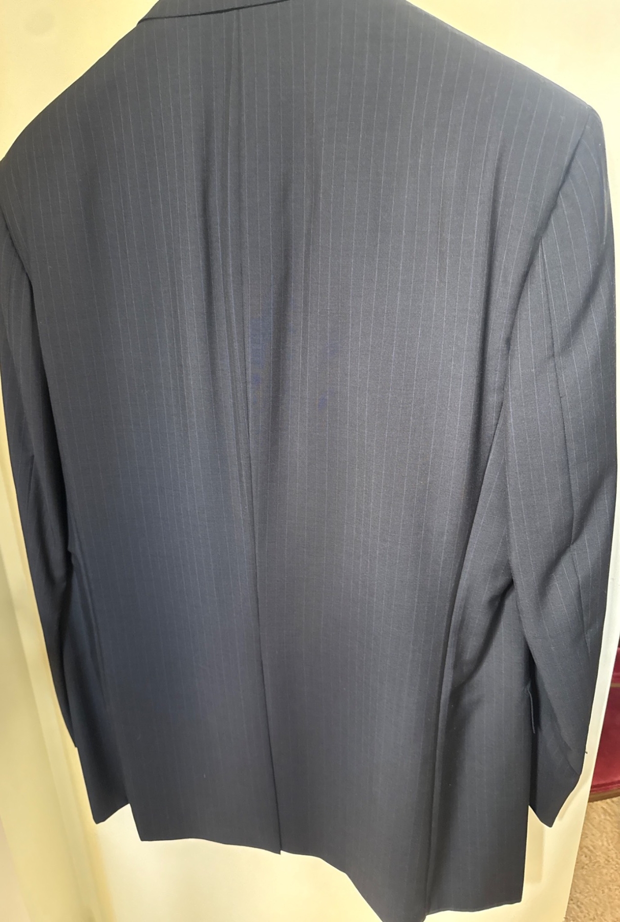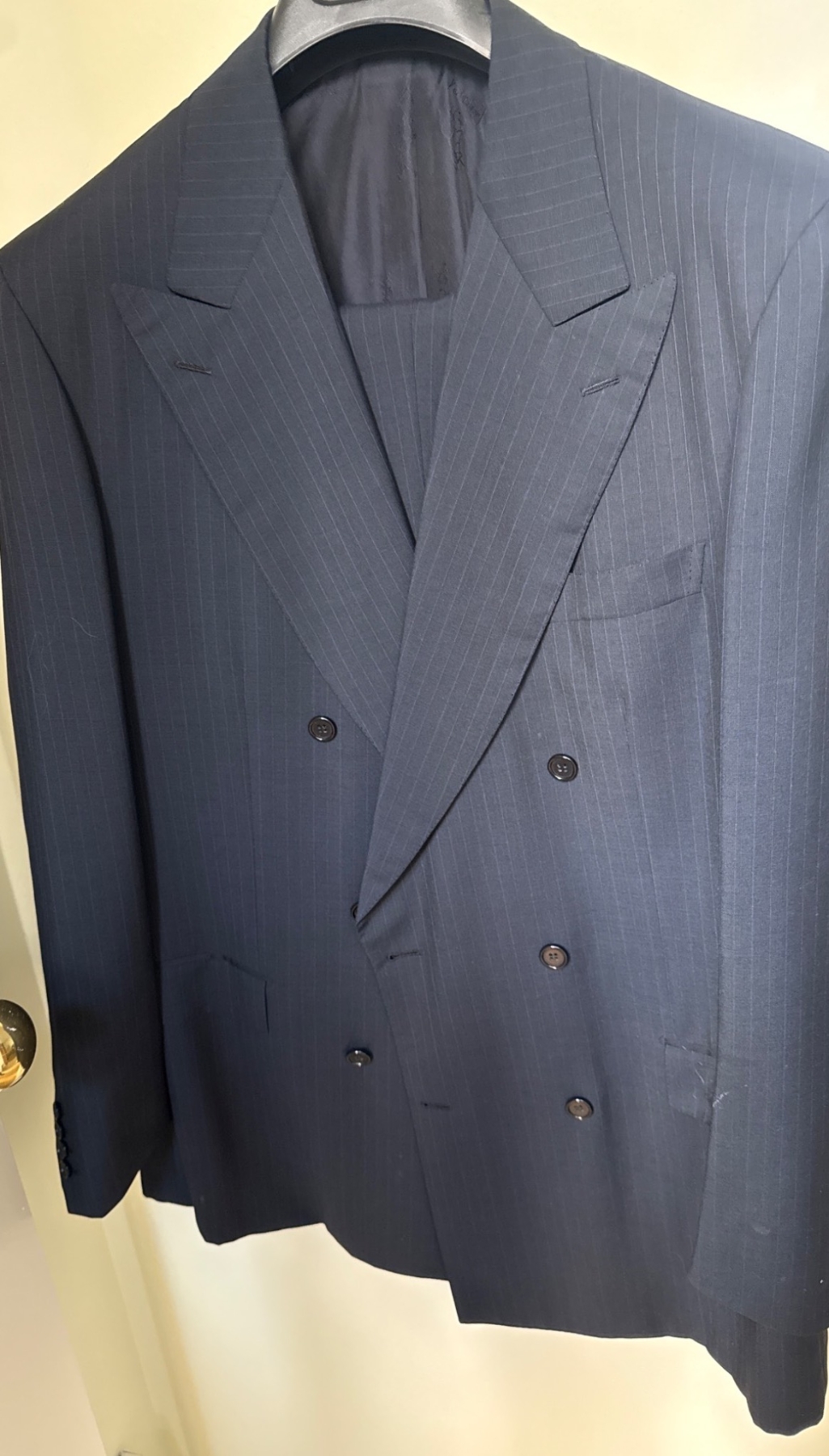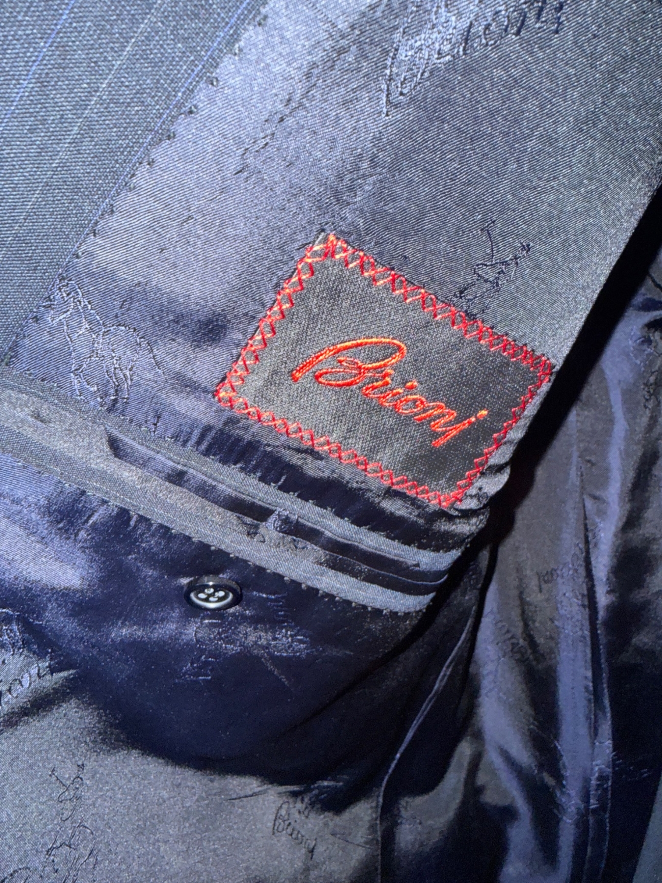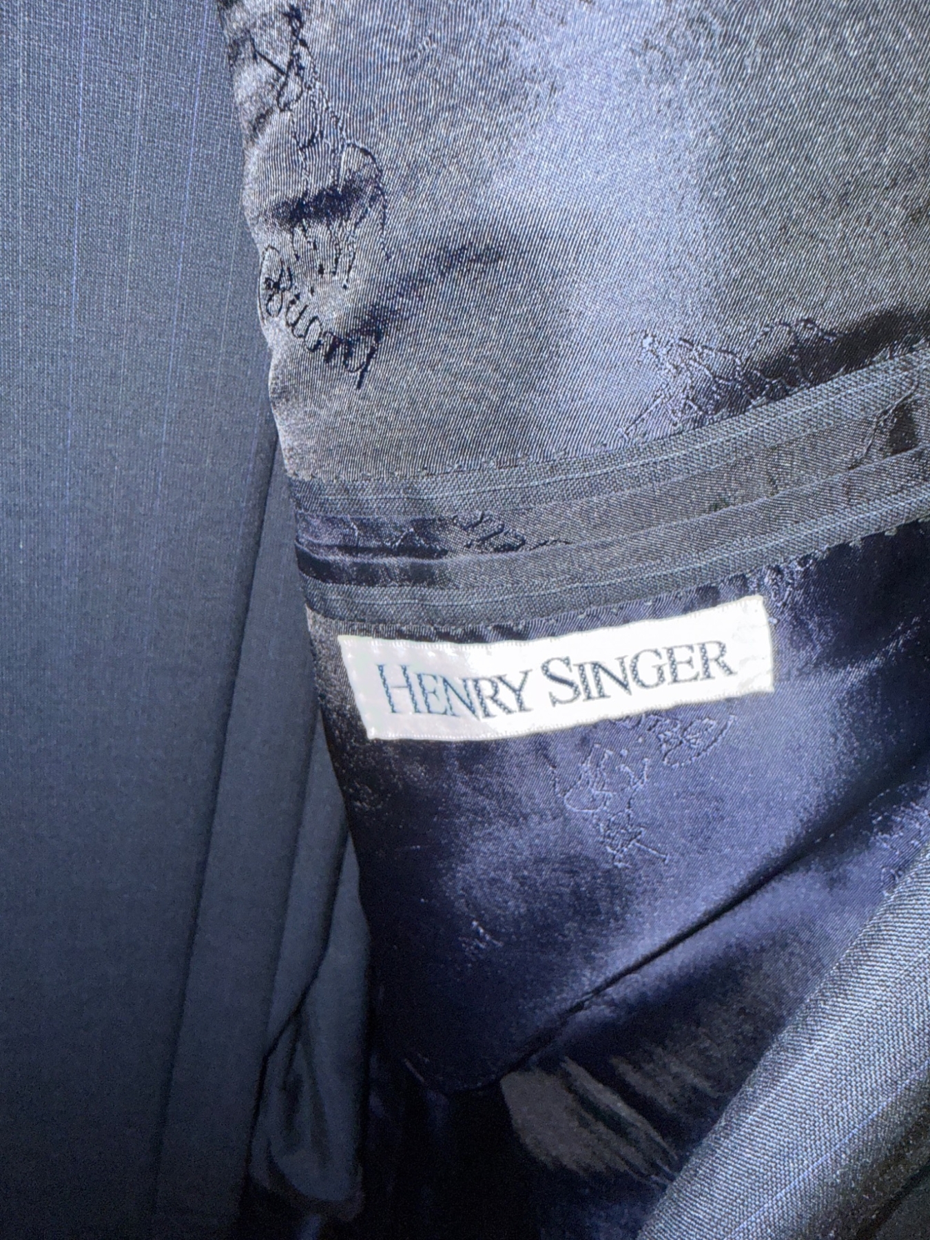 Men’s tailored suit, size 42 tall, crafted in Italy with a stylish pinstripe pattern. Features a double-breasted jacket design with sharp lapels and a silky, patterned navy lining. Interior labels include 'Brioni' and 'Henry Singer,' signifying premium quality. A perfect addition to a formal wardrobe, combining sophistication with timeless craftsmanship.
