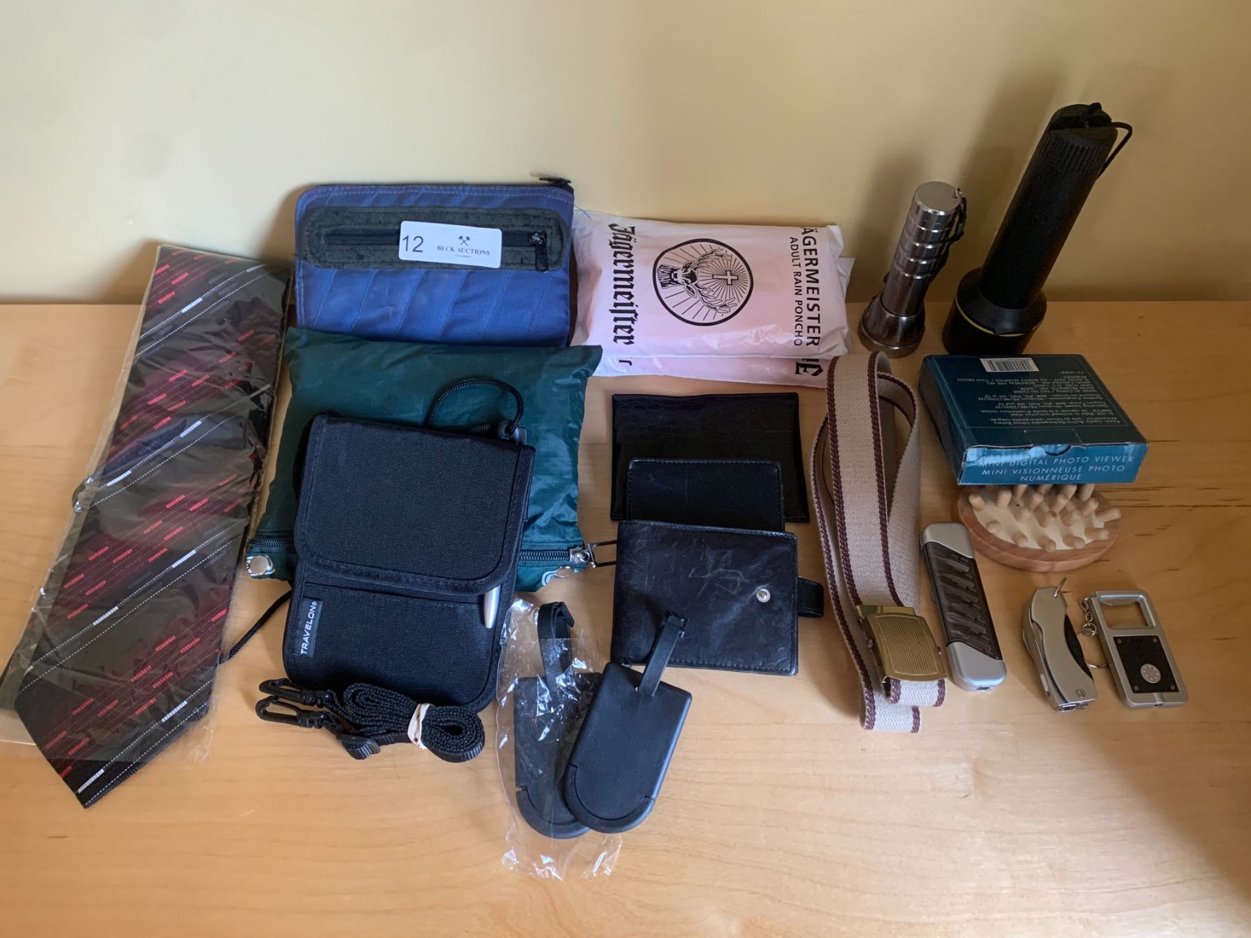 Men's Travel Bags and Accessories. Includes 2 flashlights (untested), mini digital photo view (new in box), leather wallet, ponchos.