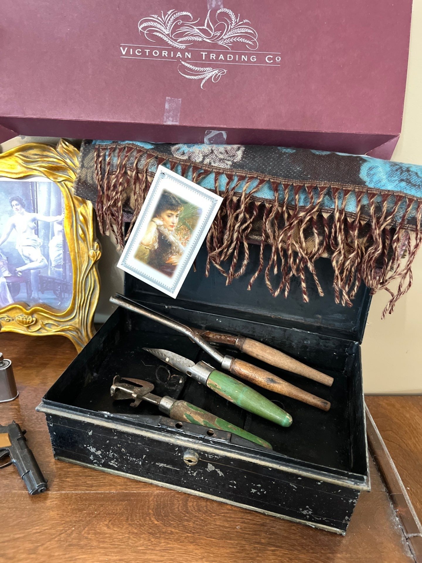 Men’s grooming, kit victorian, trading Company, scarf, vintage tin case and a Peepshow picture and t