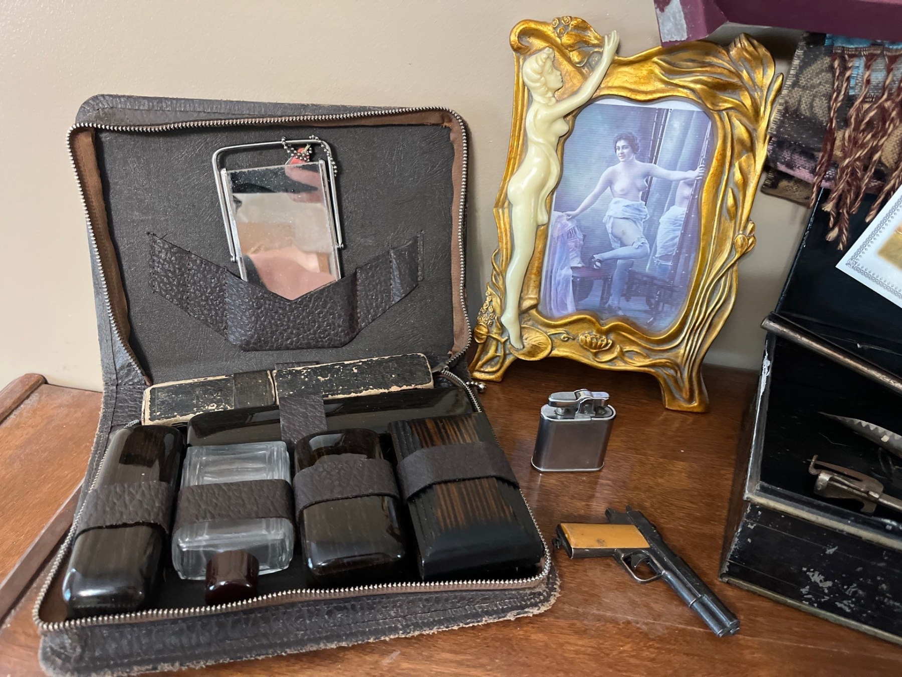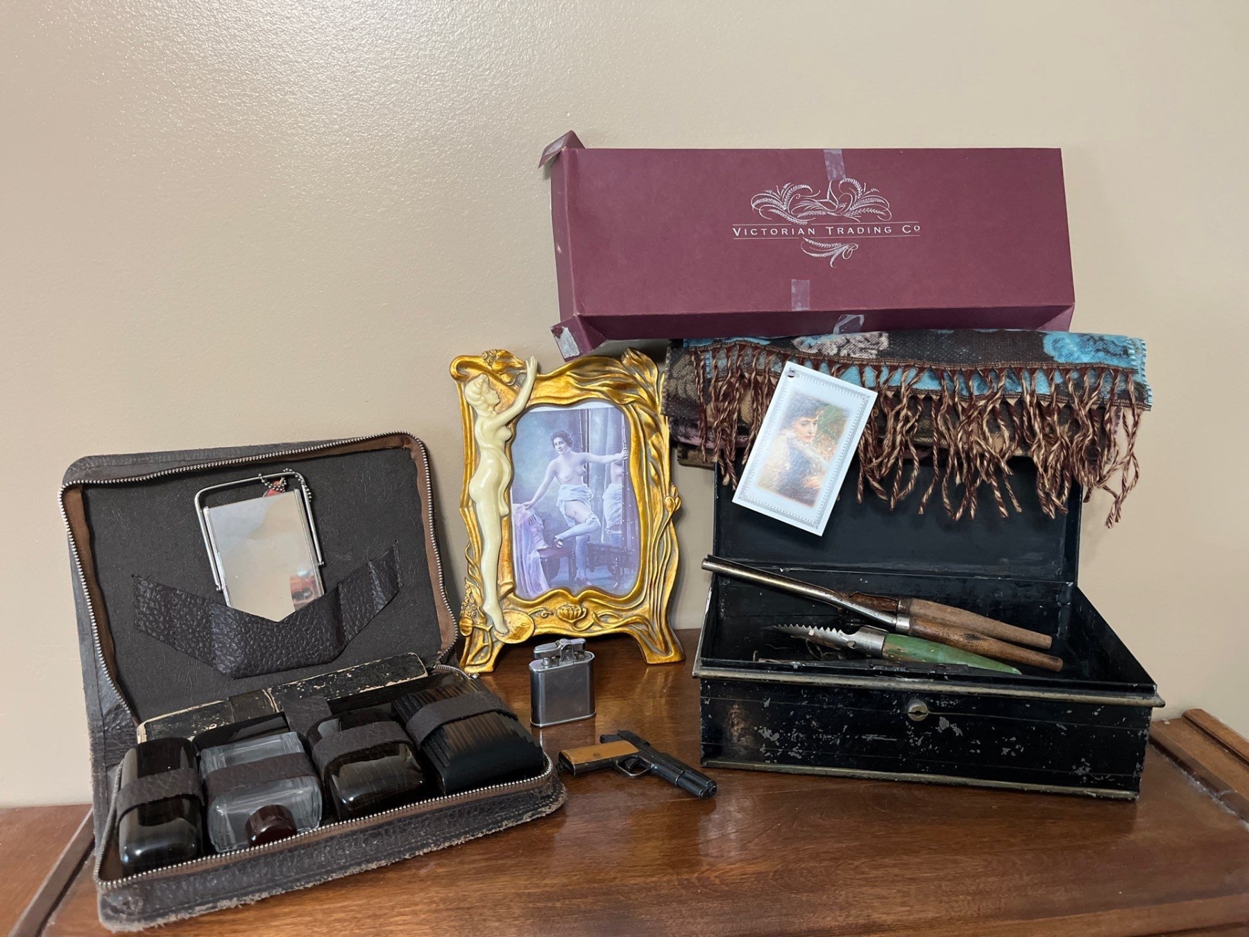 Men’s grooming, kit victorian, trading Company, scarf, vintage tin case and a Peepshow picture and two vintage lighters