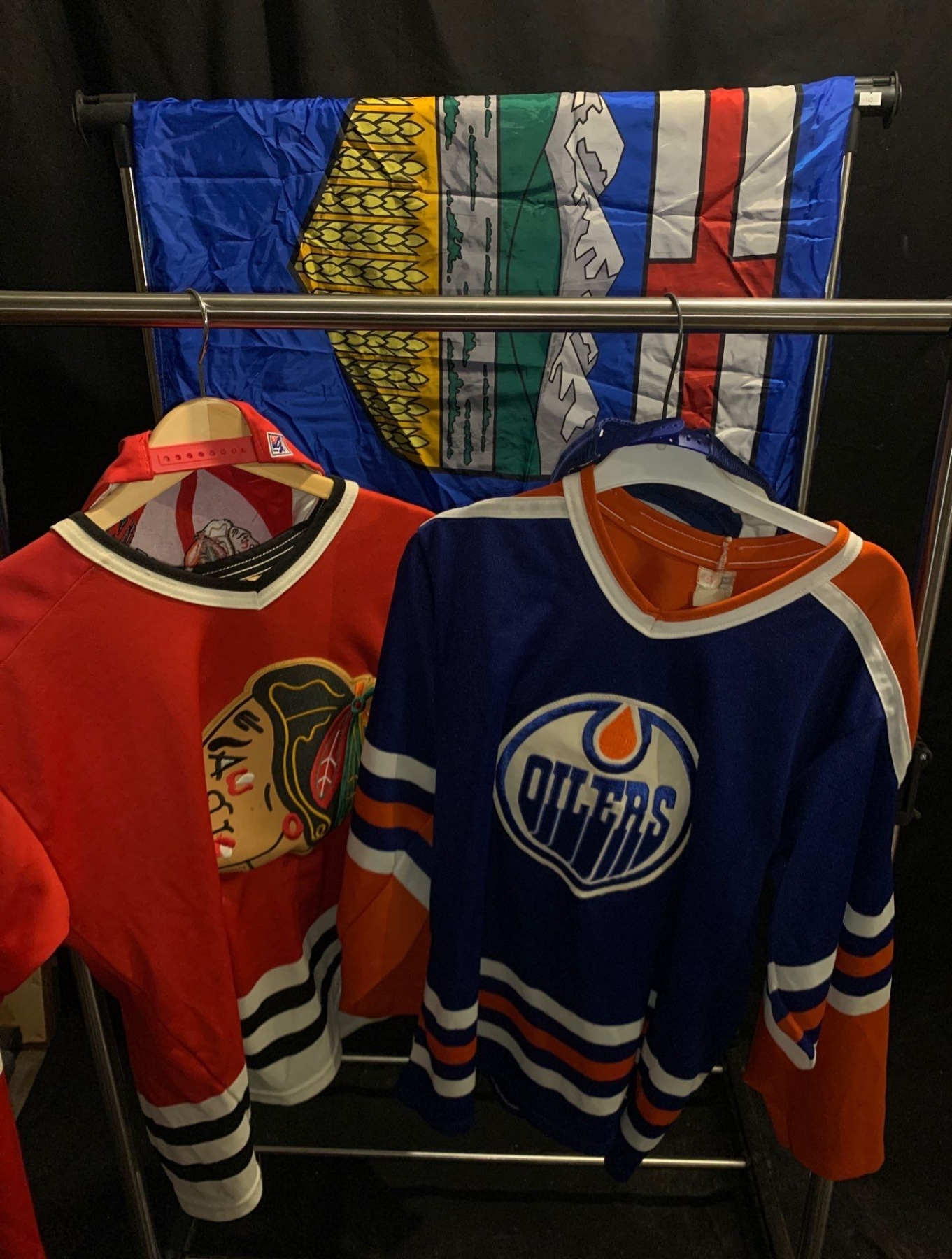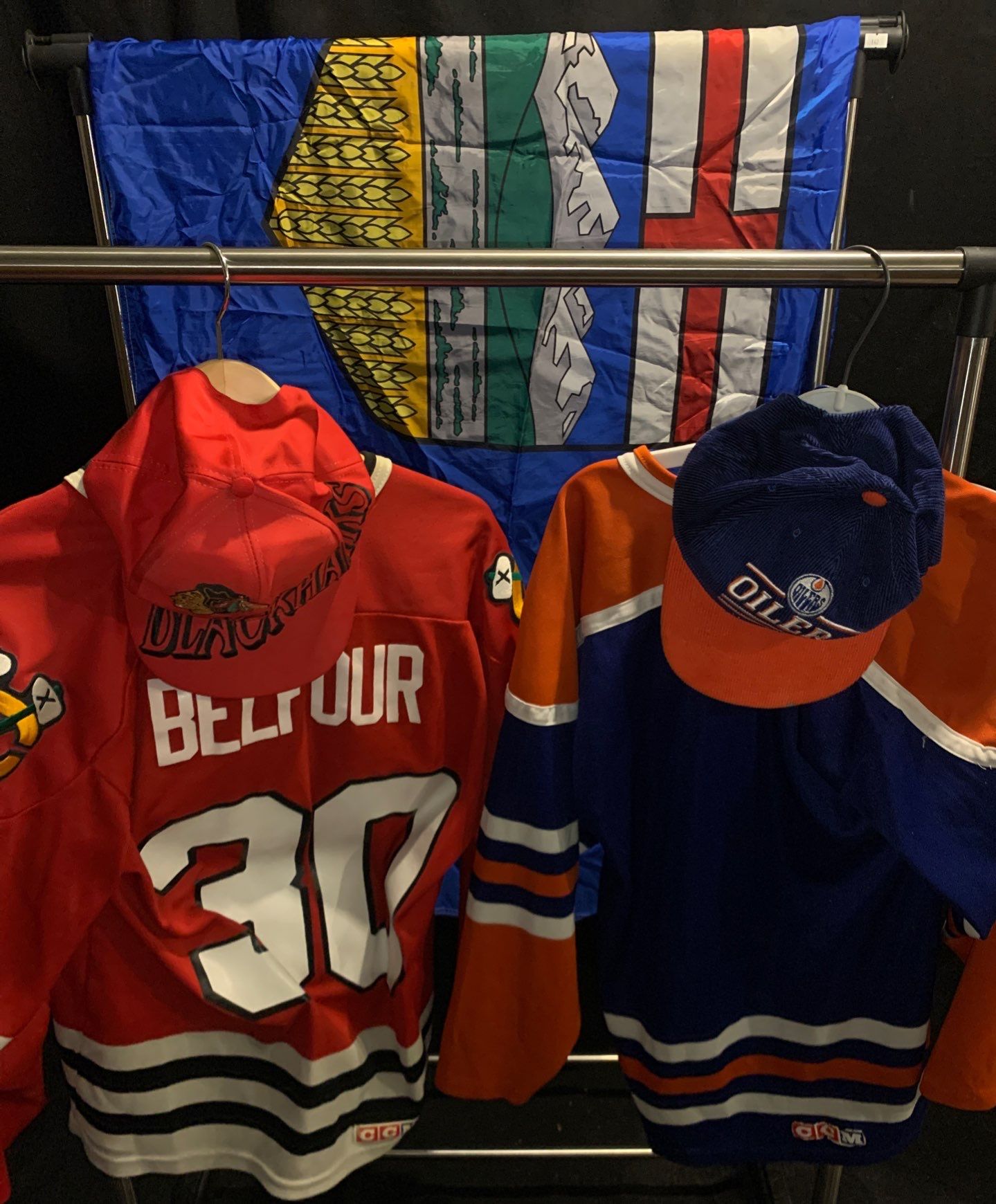 Mens Hockey Merch (S/M); Blackhawks + Oilers Jersey/Cap Combo, Plus Alberta Flag