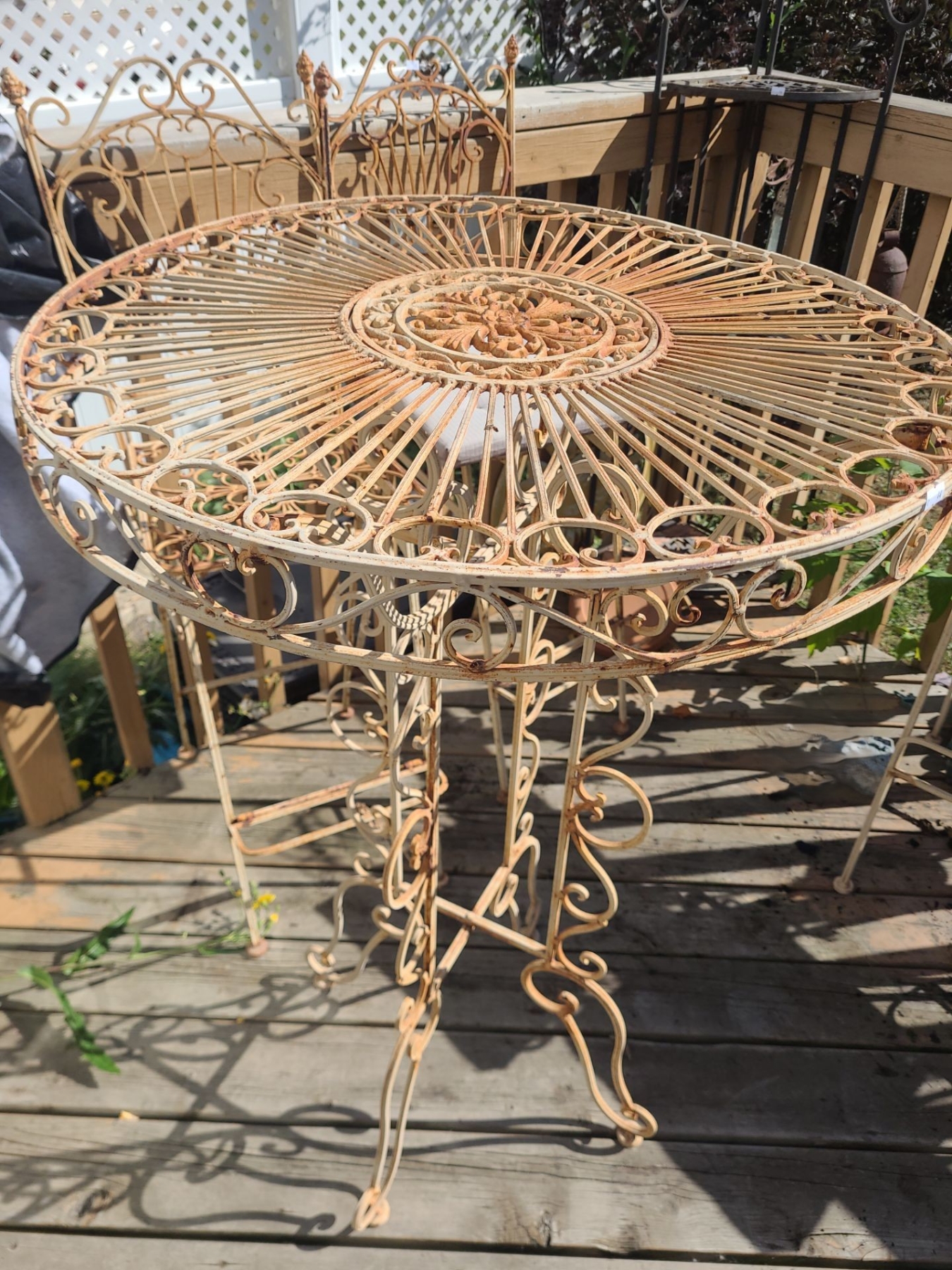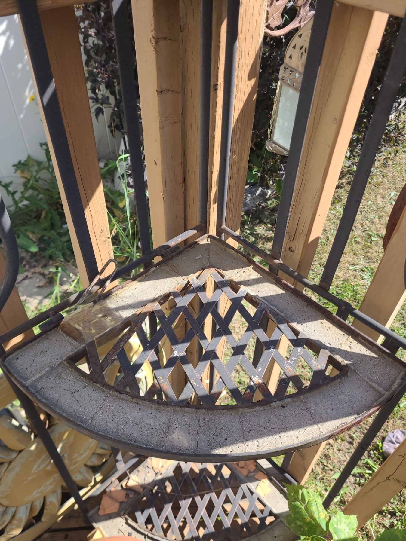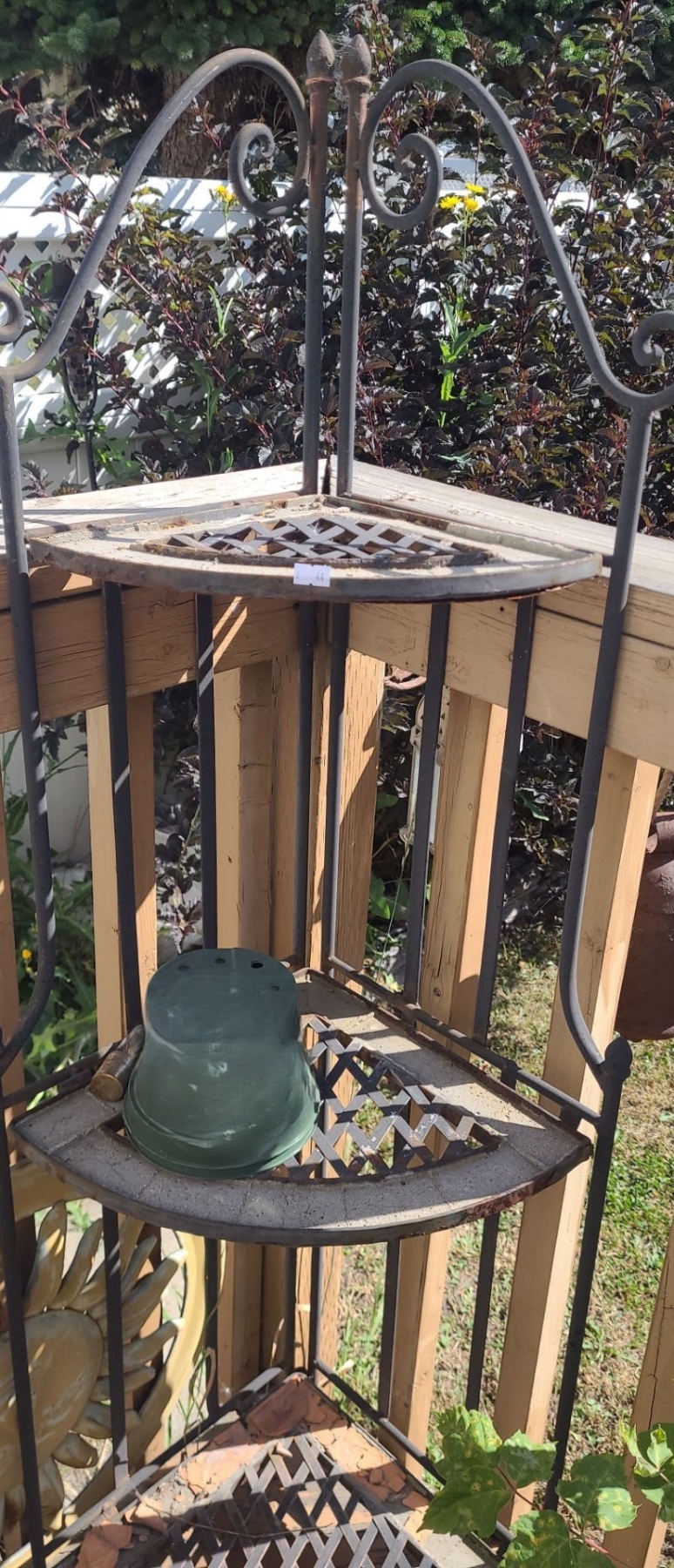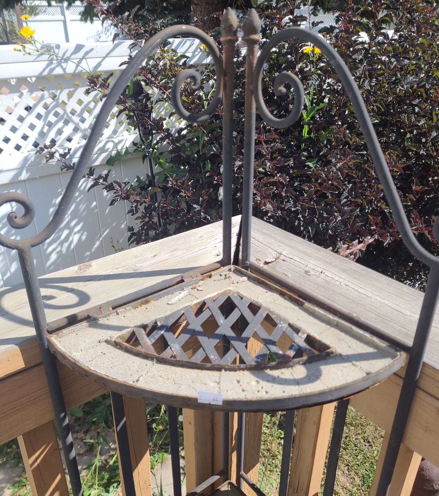 Metal Garden Set: Table 28" Top, 43 T, Four Chairs 19 W, 19 D, 46 T, Corner Shelf 20 W, 14 D, 55 T
