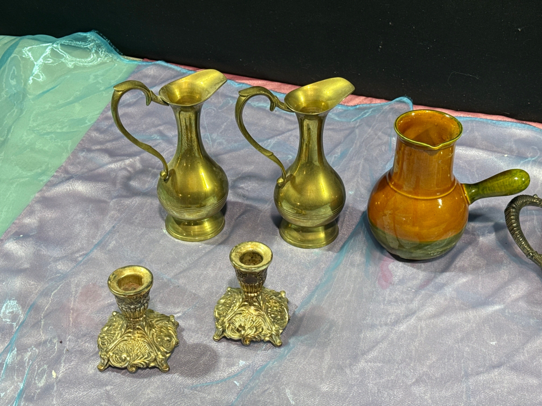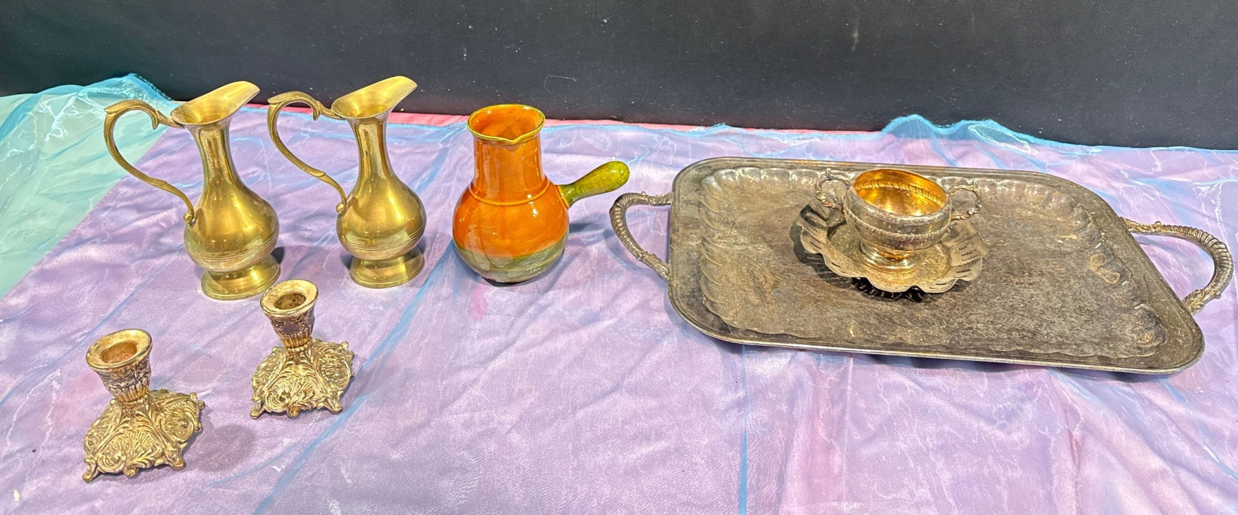 Metal Pitchers, Candlestick Holders, Tray, and Dishes