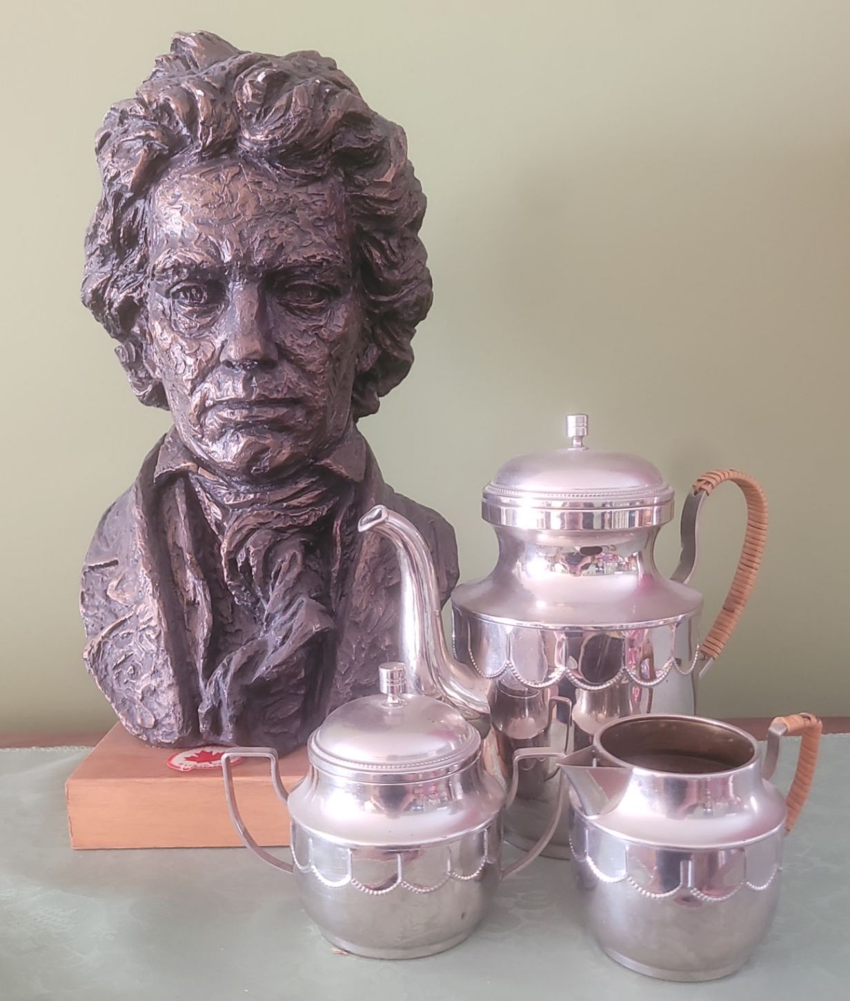 Metal Tea Set (Teapot, Cream, Sugar) & Beethoven Made in Canada Ceramic Sculpture (Some Chipping)