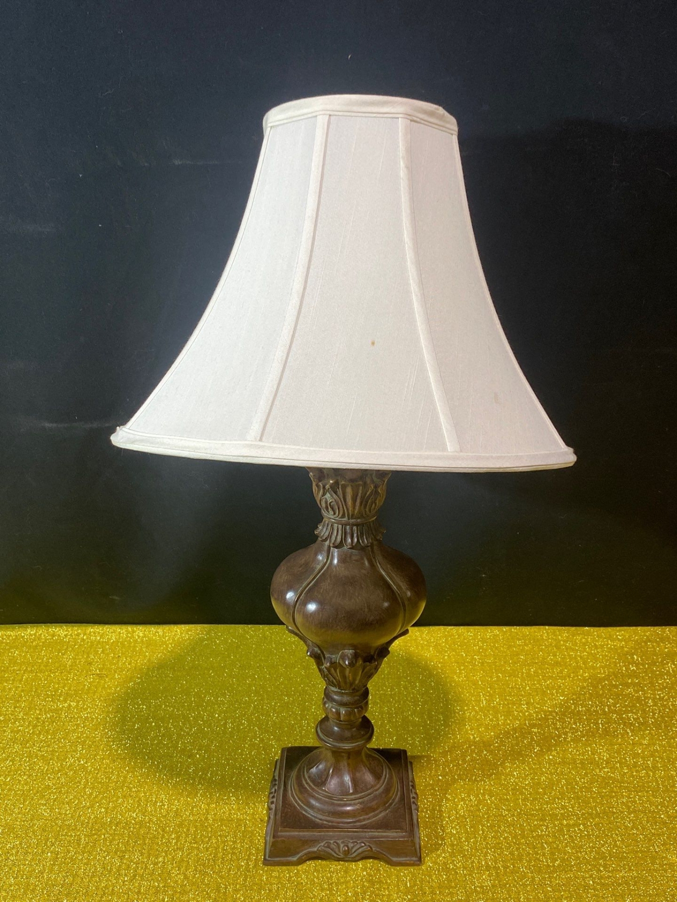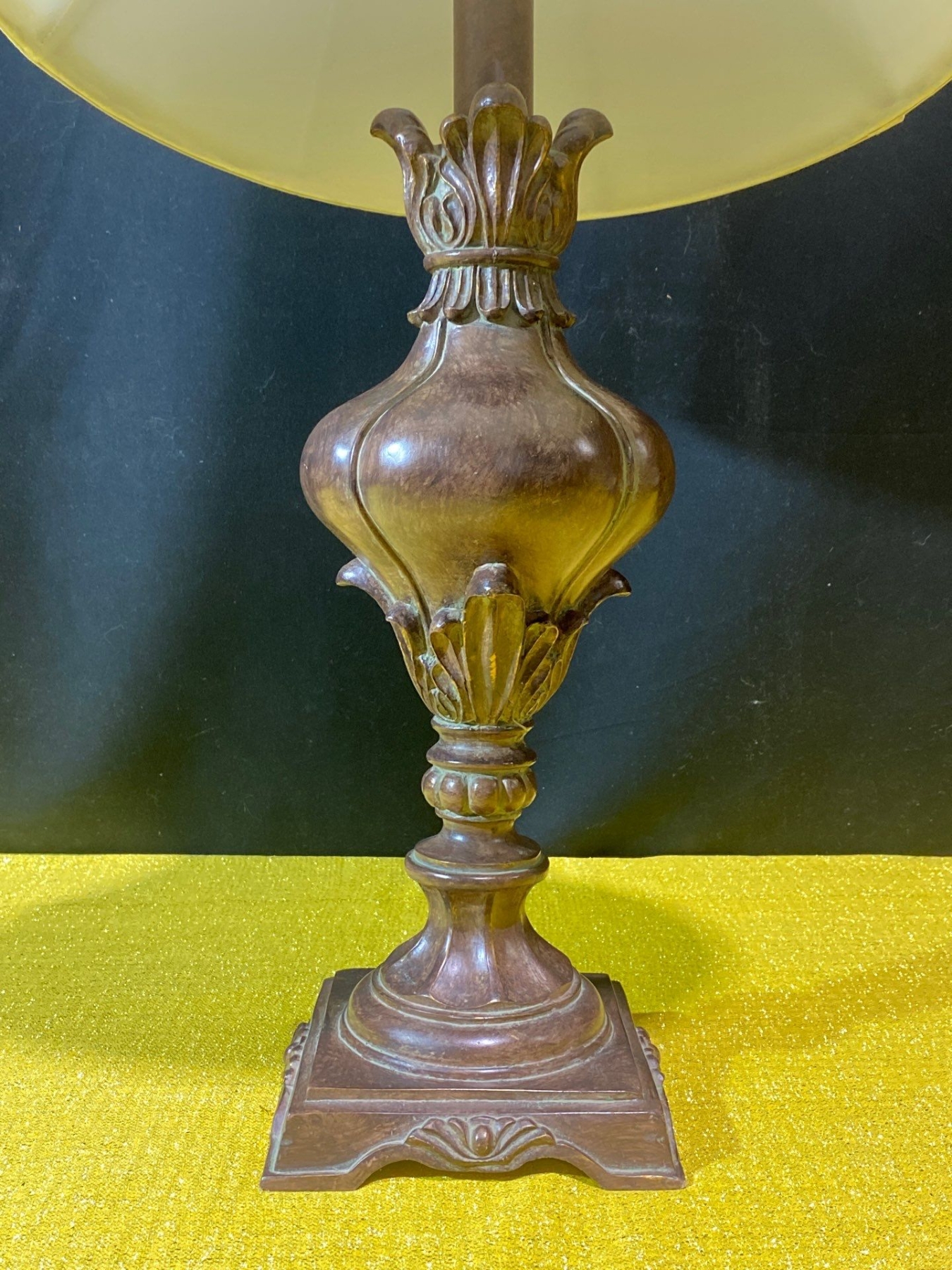 An elegant mid-20th century table lamp in the Hollywood Regency style, featuring intricate carved details and a sophisticated silhouette. Its stylish design, rich finish, and vintage charm make it a perfect accent for classic or eclectic interiors, adding both light and timeless glamour to any room.