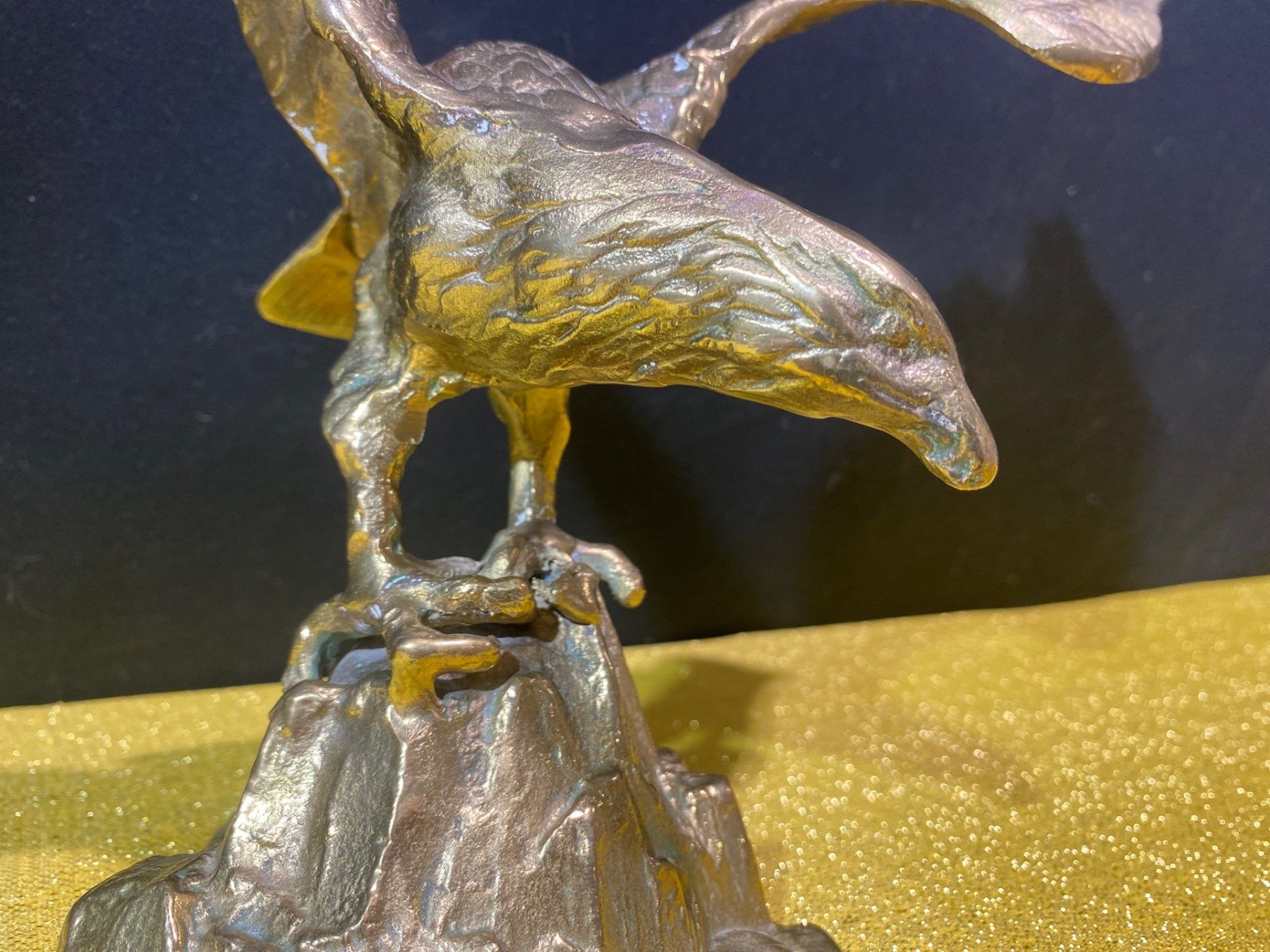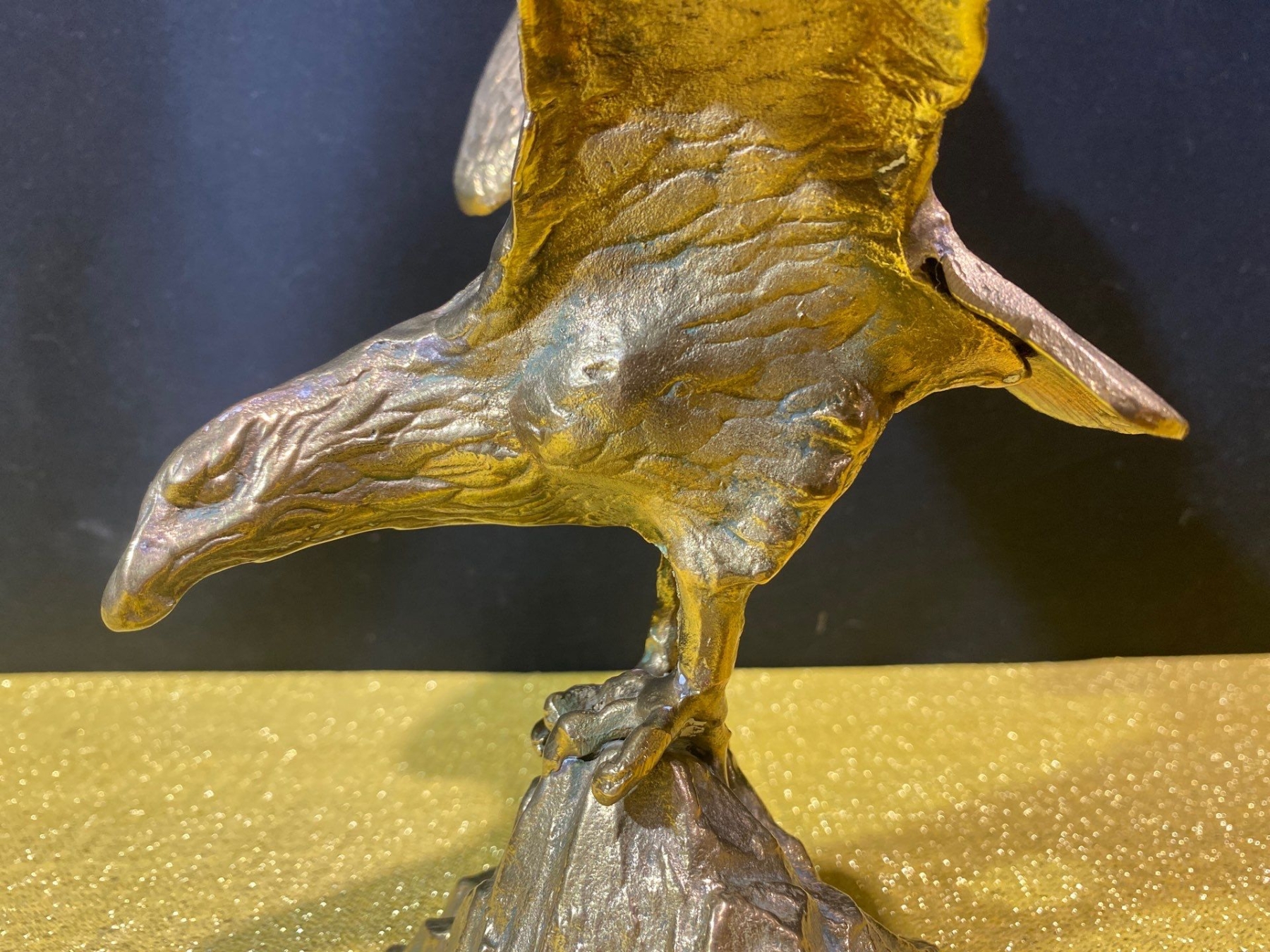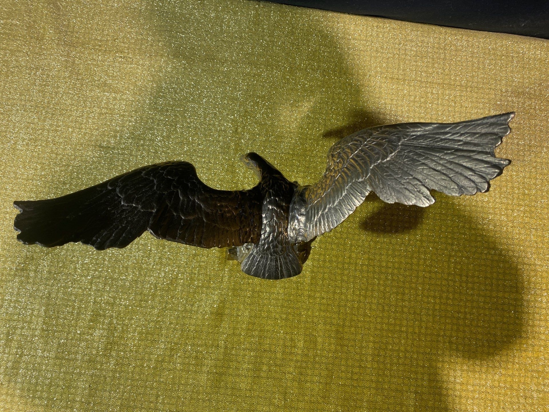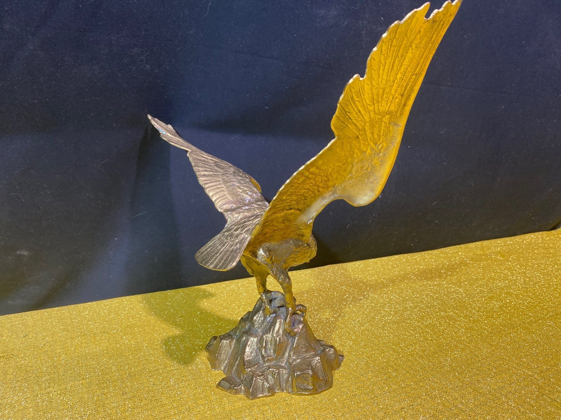 A striking mid-century bronze sculpture of an eagle in poised flight, showcasing bold lines and detailed craftsmanship. Its dynamic form and rich patina make it a standout decorative piece, perfect for collectors of vintage art or lovers of iconic animal motifs.