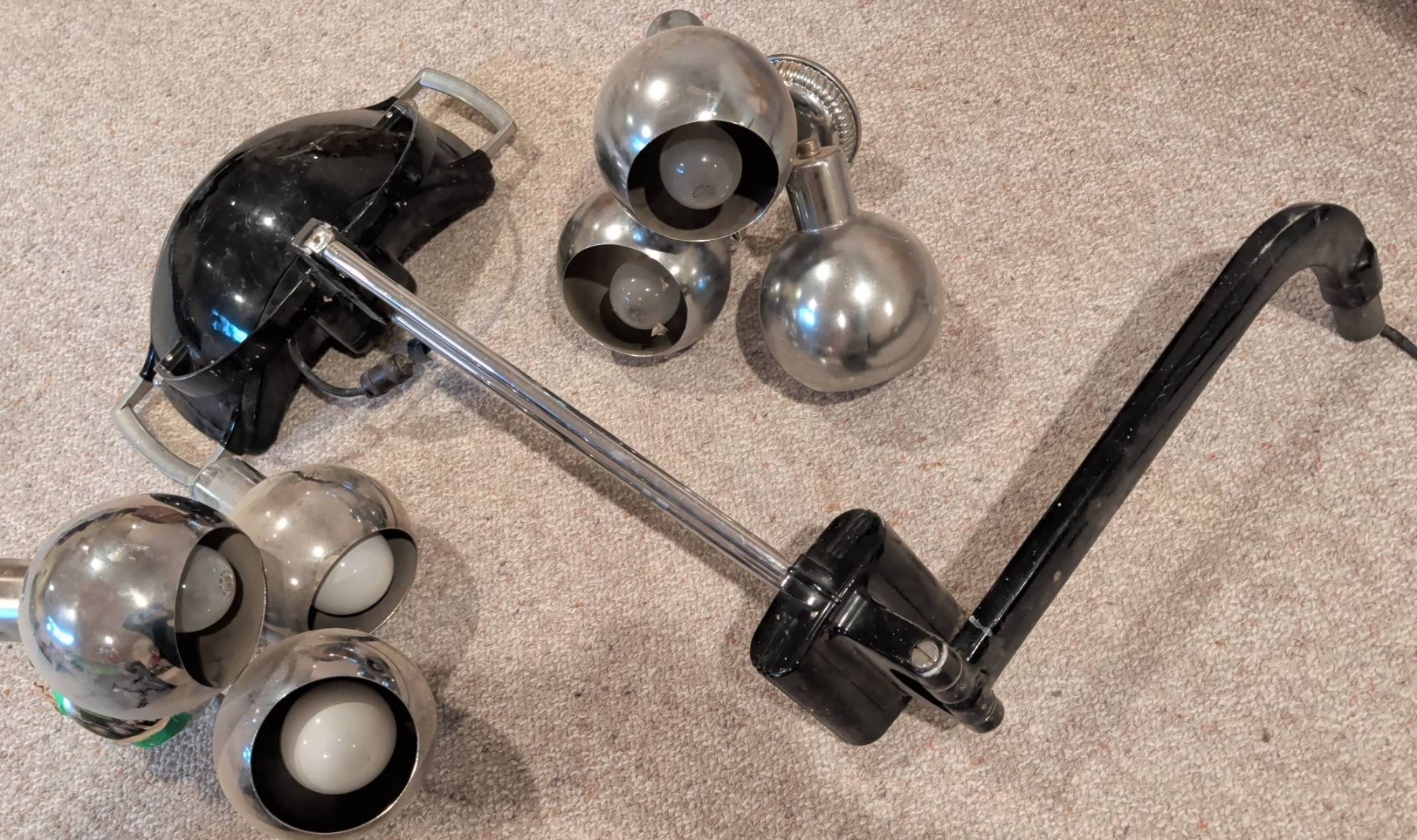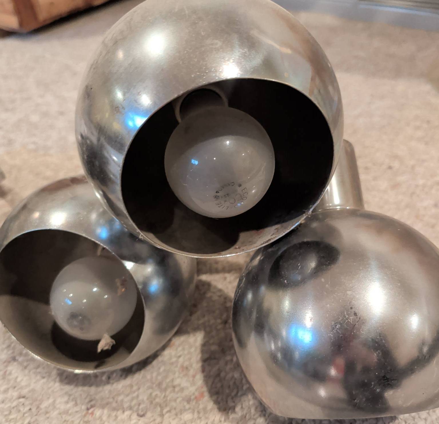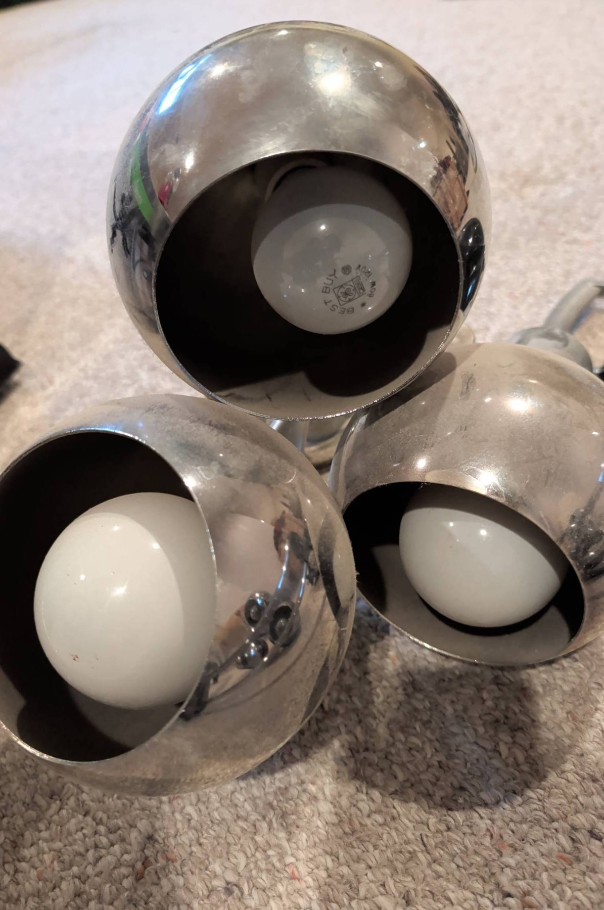 A unique lot featuring mid-century modern chrome ball track lights and a Castle-branded spotlight. The track lights consist of polished chrome metal with adjustable globes, each housing a single bulb for directional lighting. Accompanied by a Castle spotlight, constructed with a metal frame and angled glass panels, offering vintage industrial appeal. Perfect for restoration or as a retro lighting addition. Dimensions and measurements not specified.