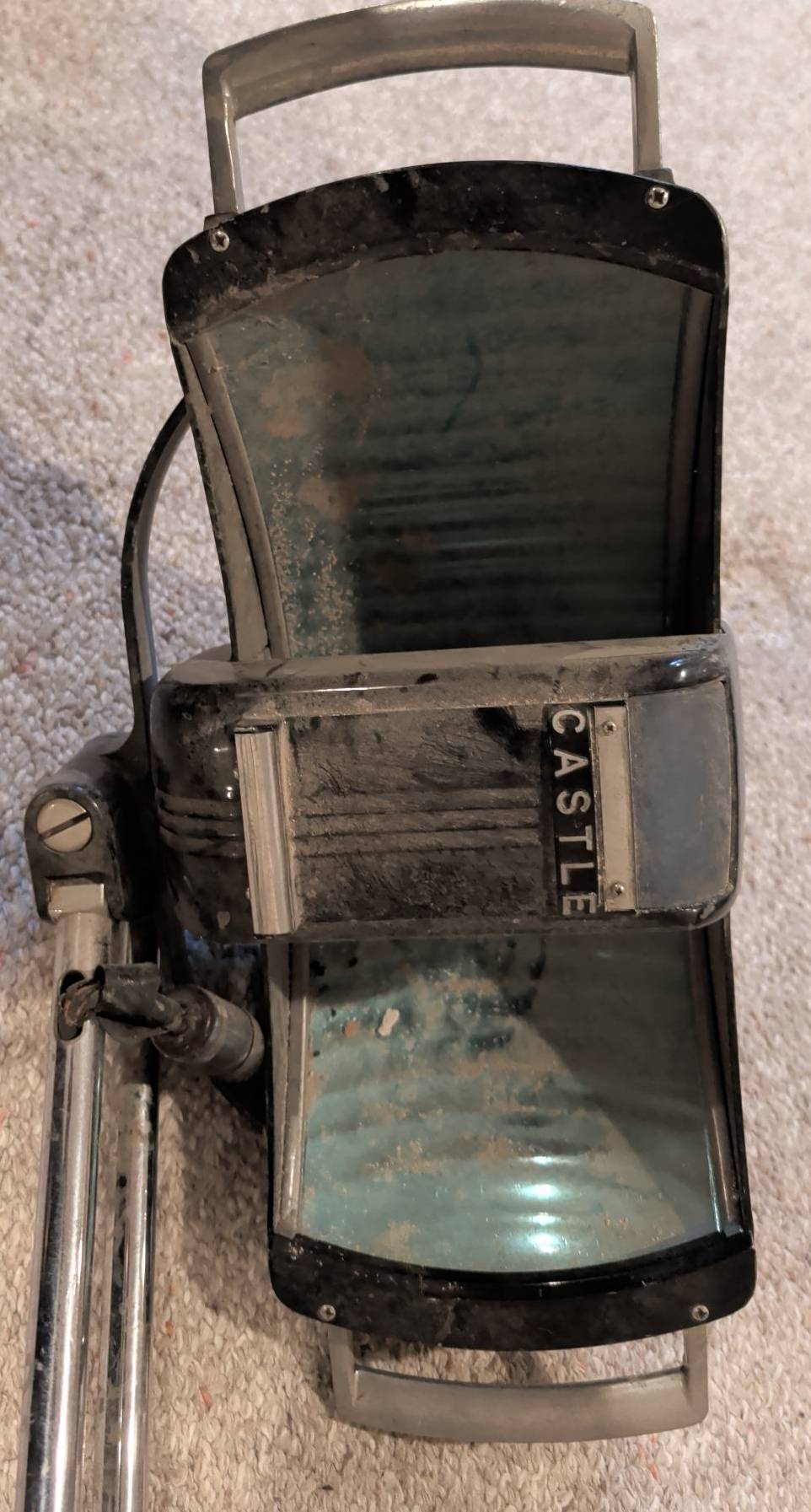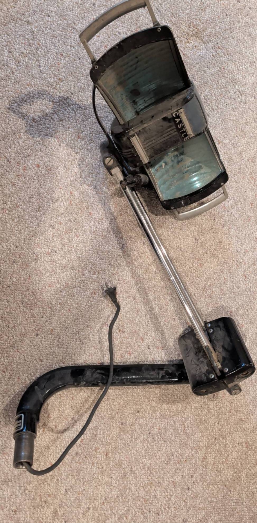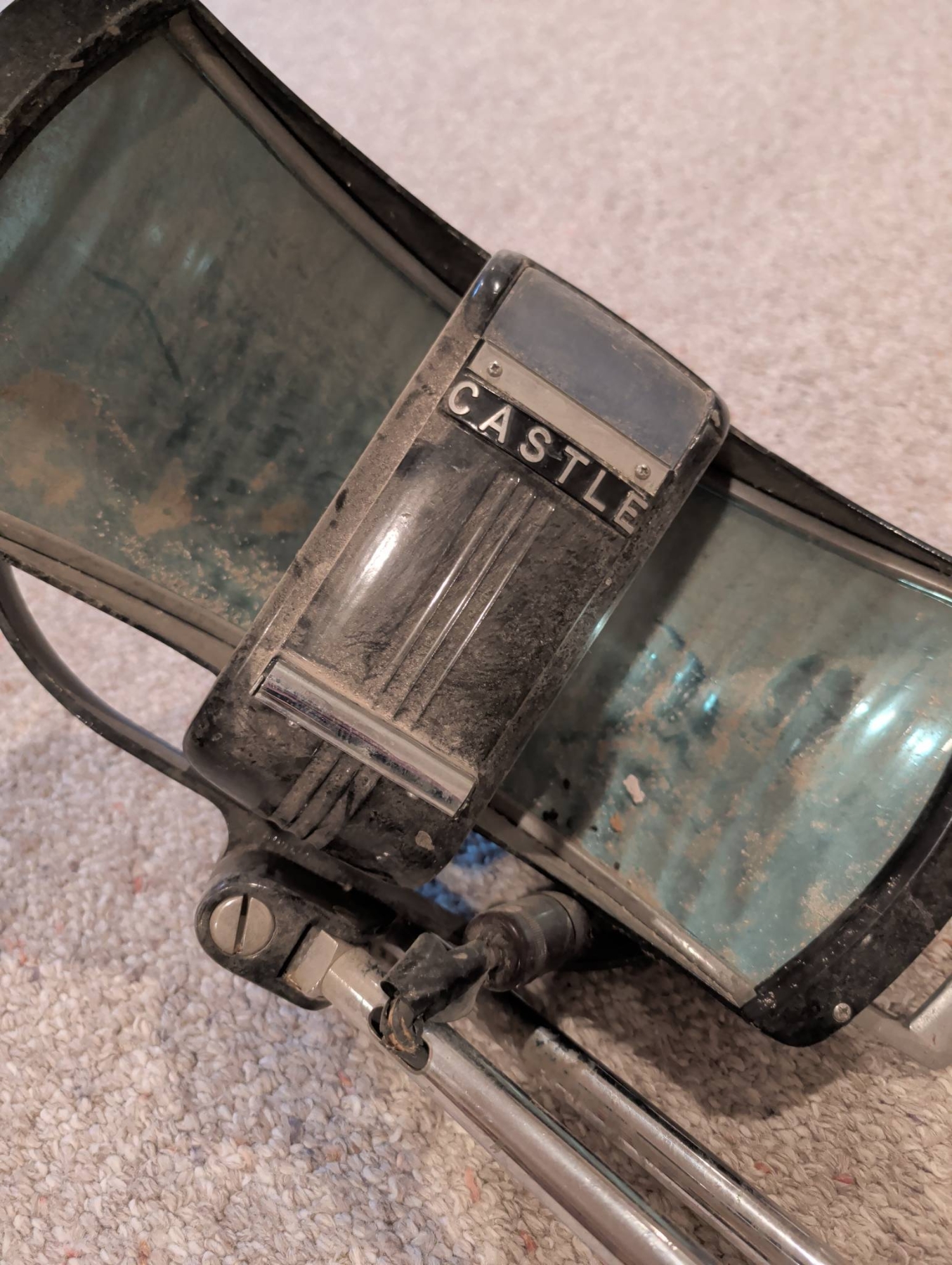 A unique lot featuring mid-century modern chrome ball track lights and a Castle-branded spotlight. The track lights consist of polished chrome metal with adjustable globes, each housing a single bulb for directional lighting. Accompanied by a Castle spotlight, constructed with a metal frame and angled glass panels, offering vintage industrial appeal. Perfect for restoration or as a retro lighting addition. Dimensions and measurements not specified.