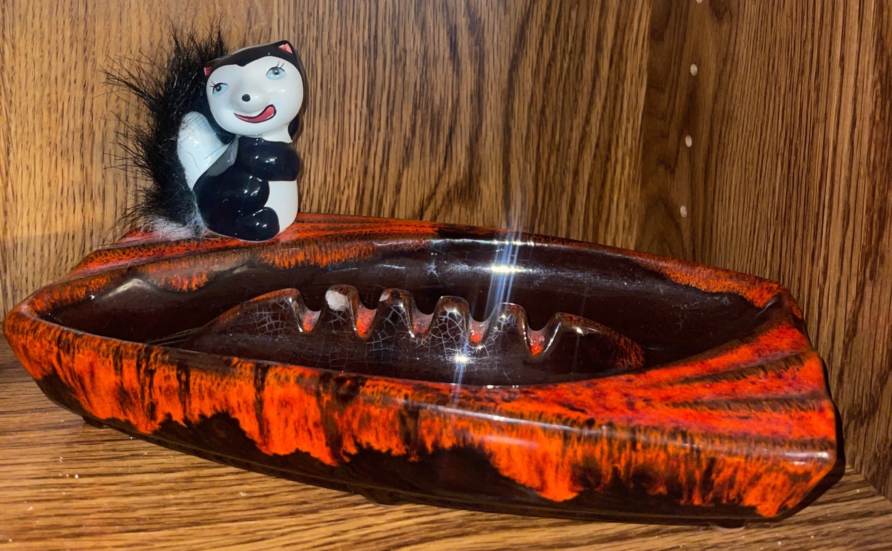 Mid Century Modern Glass Blown Ashtray w/ mini skunk ornament