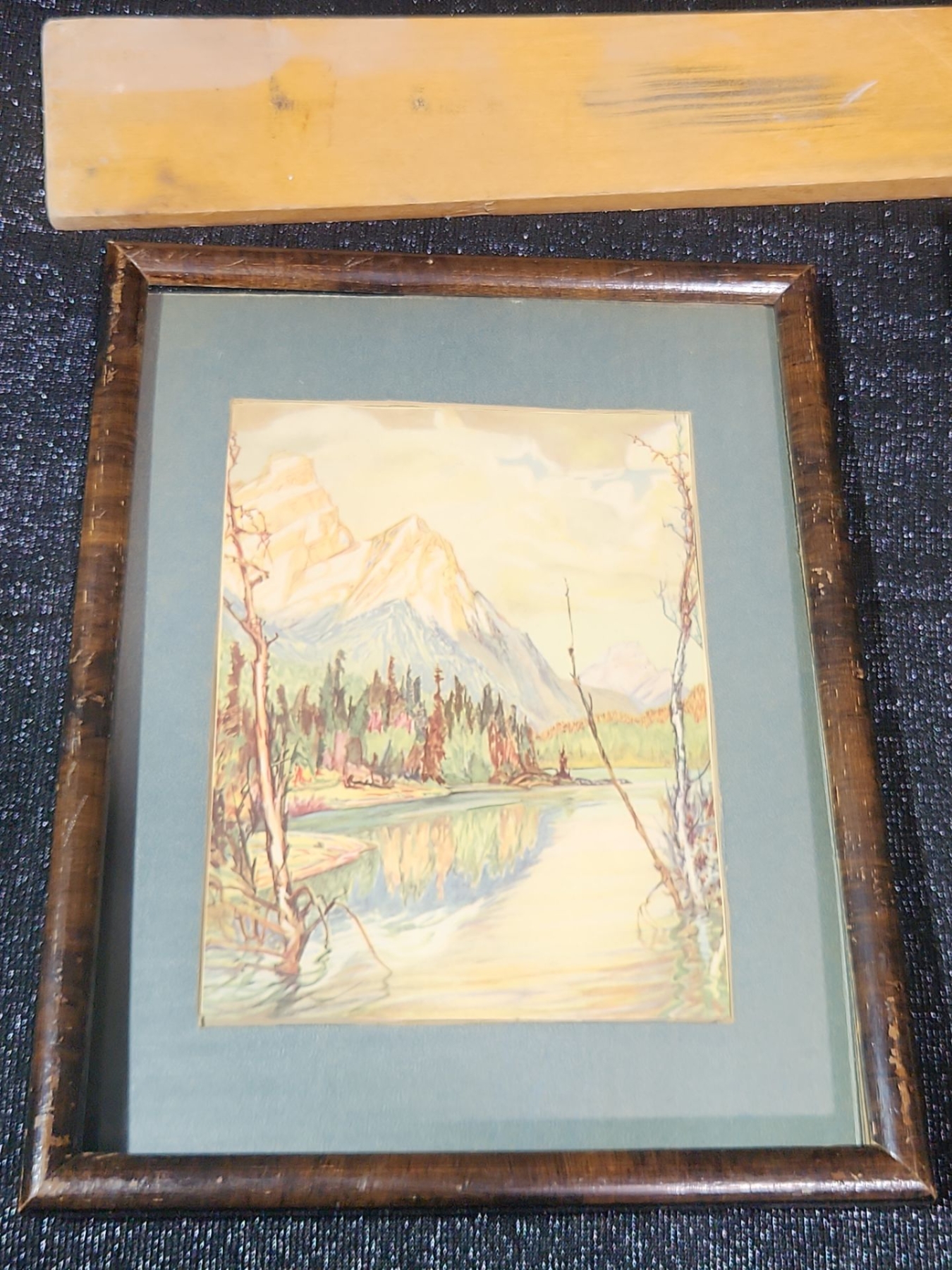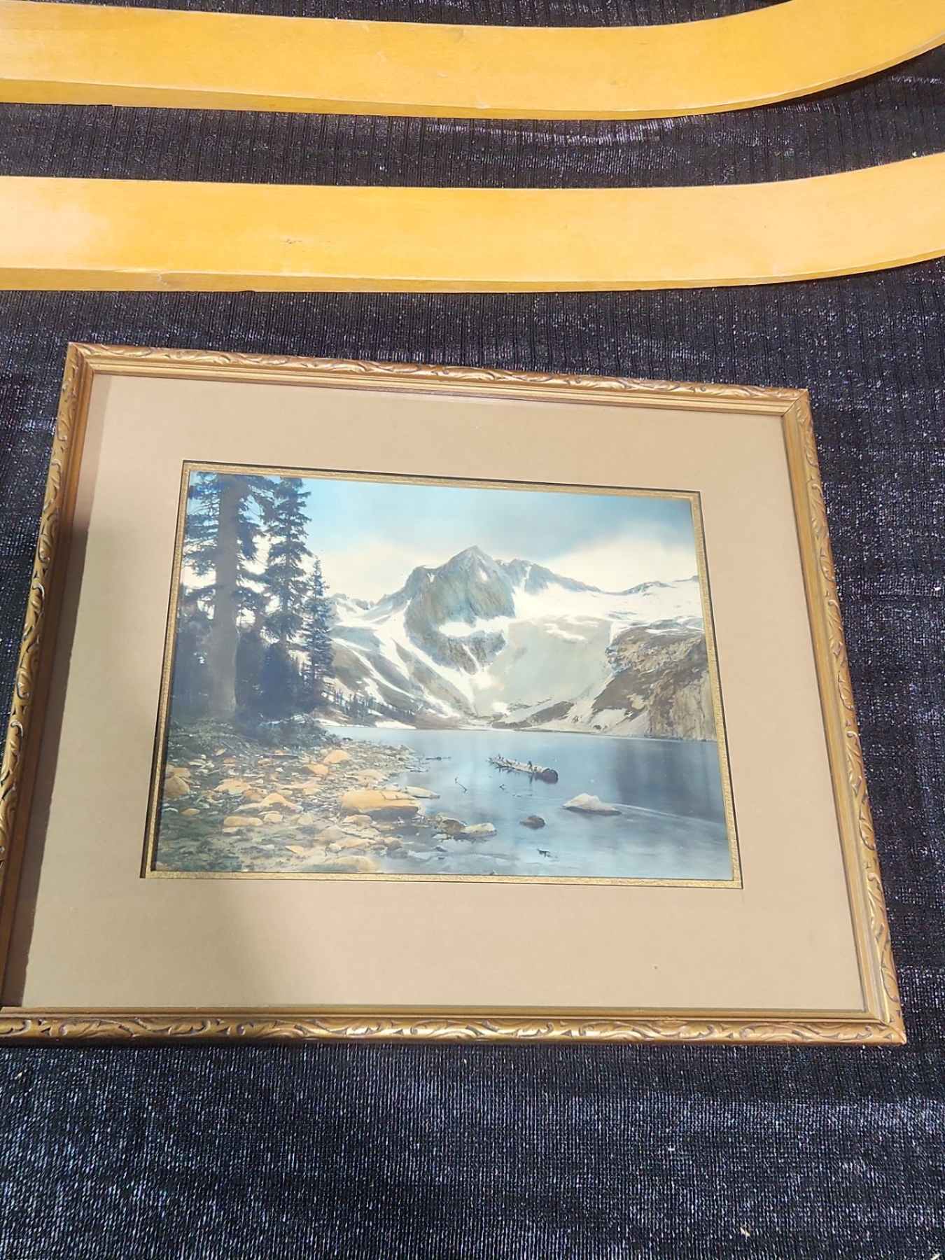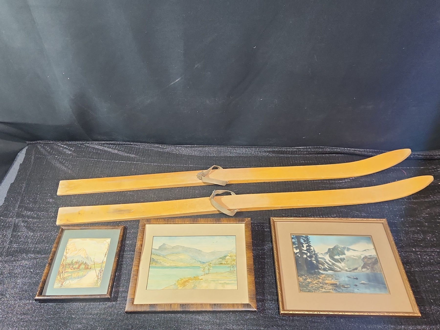 A pair of vintage wooden skis, likely from the mid -20th century. 3 drawings of mountain scenes, all in different mediums and famed in wooden frames. Great pieces for decorating the lodge or cabin