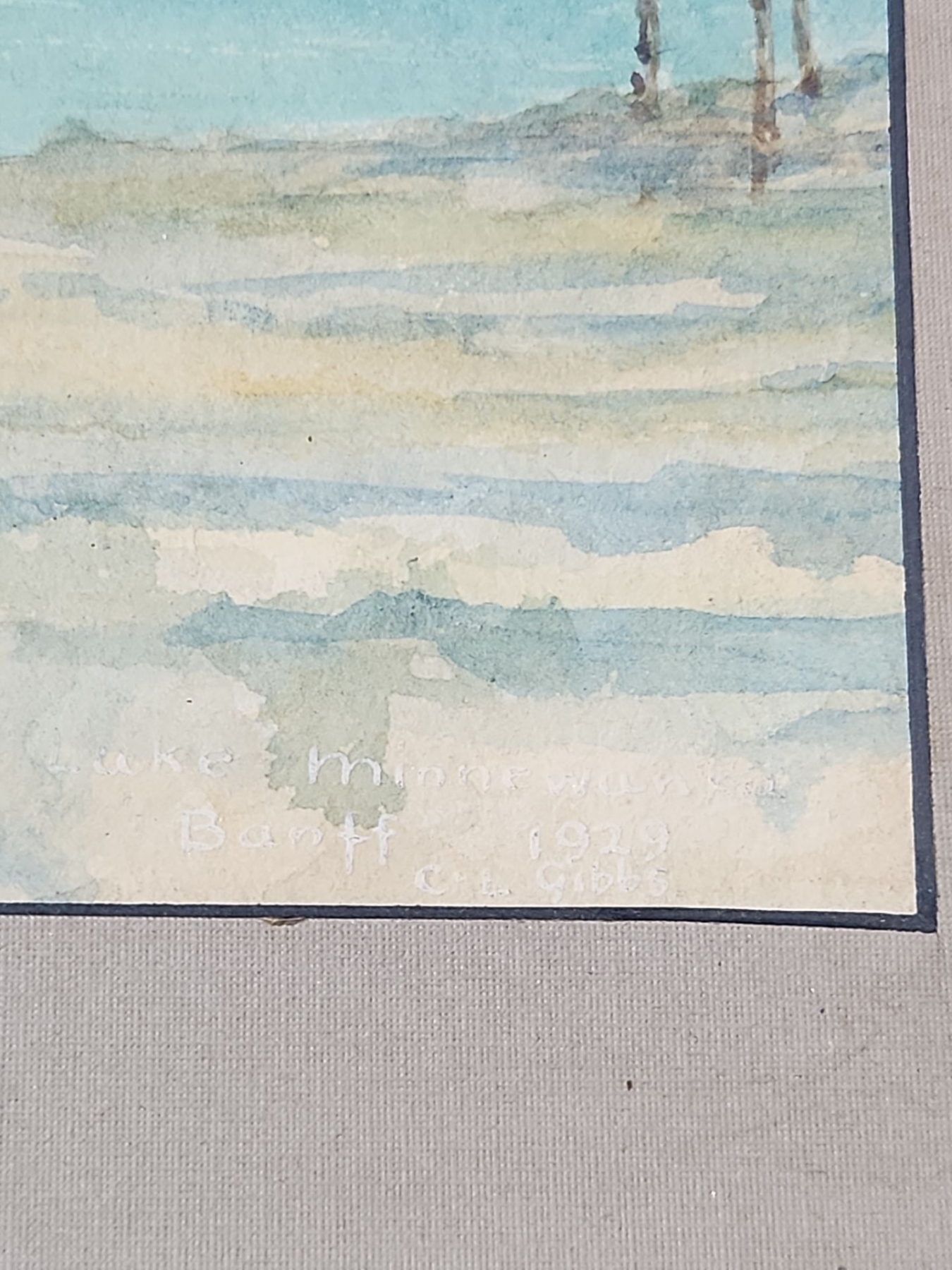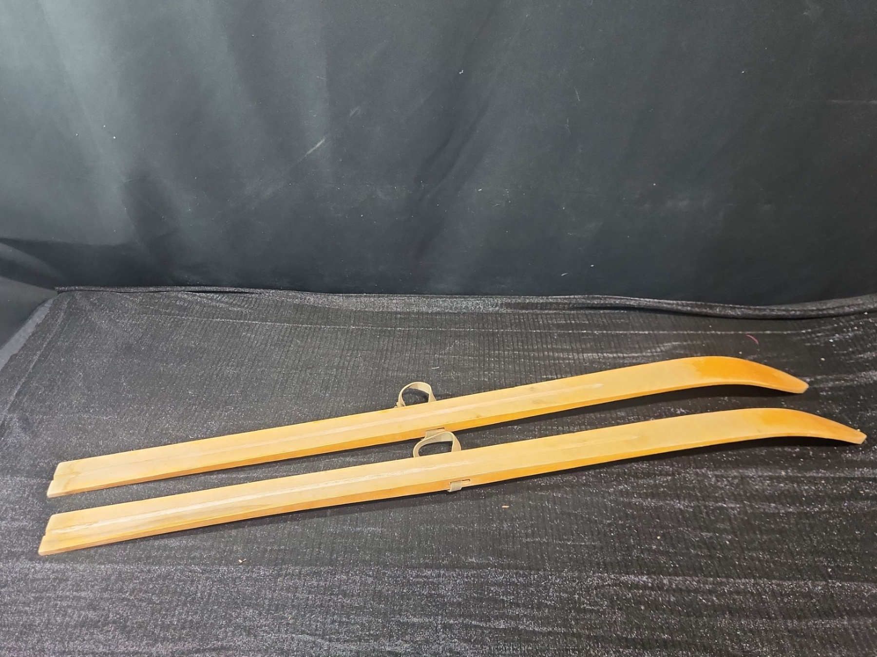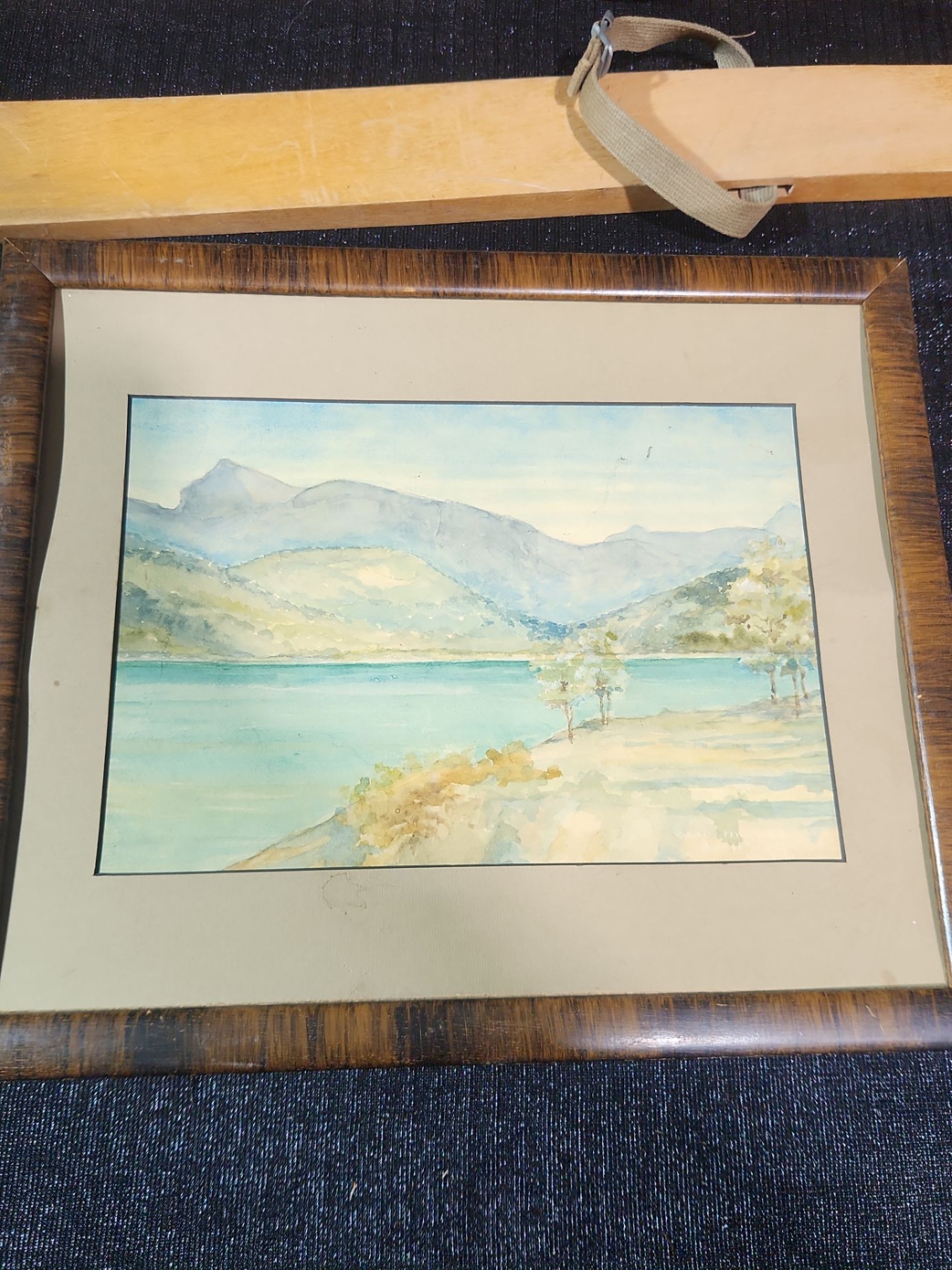 A pair of vintage wooden skis, likely from the mid -20th century. 3 drawings of mountain scenes, all in different mediums and famed in wooden frames. Great pieces for decorating the lodge or cabin