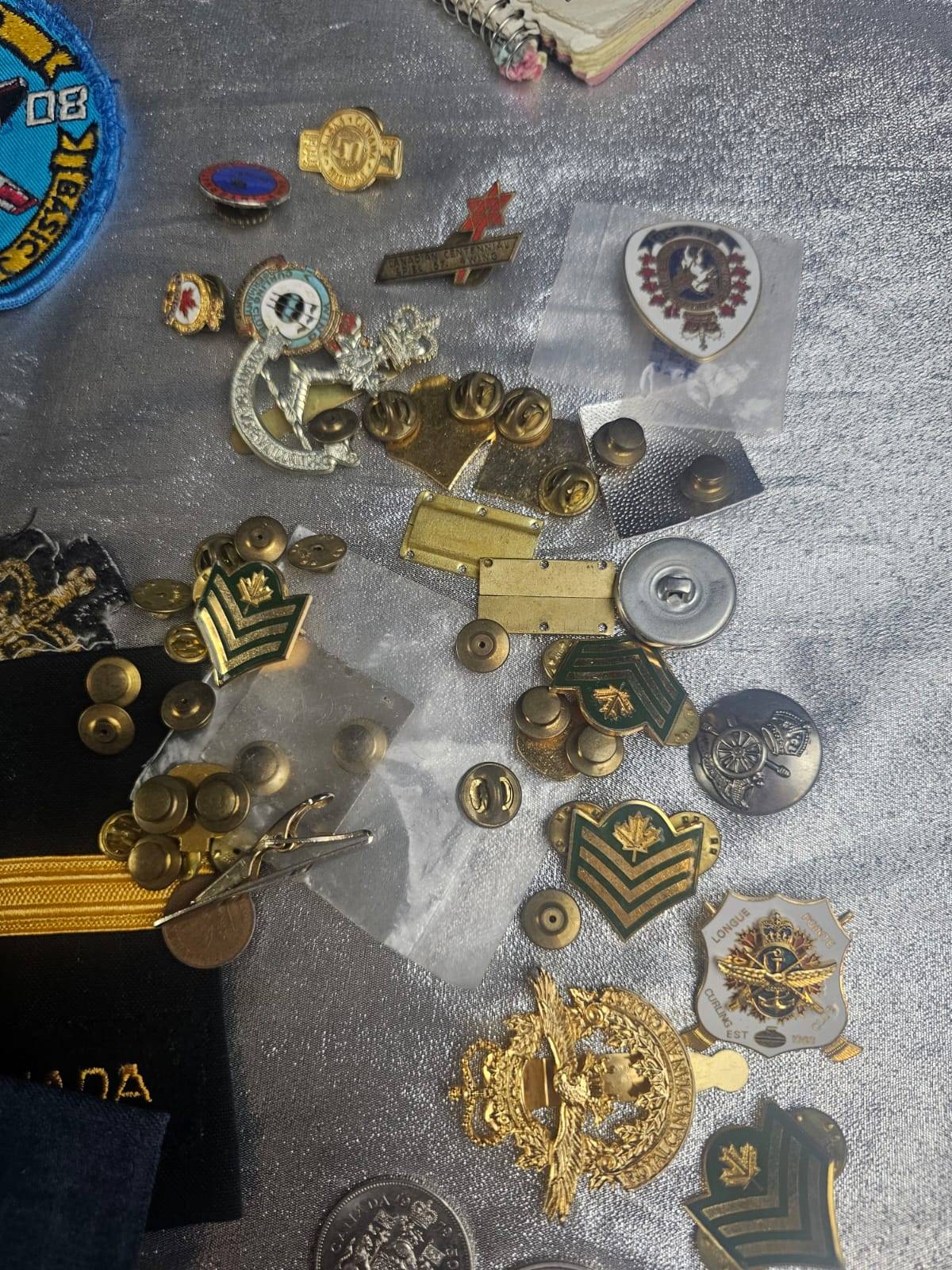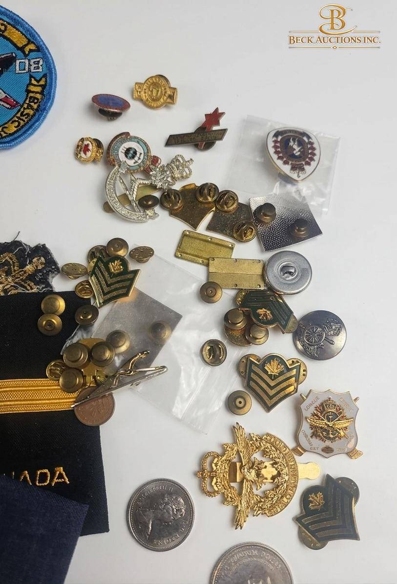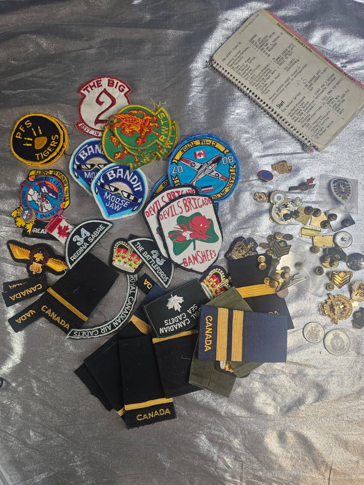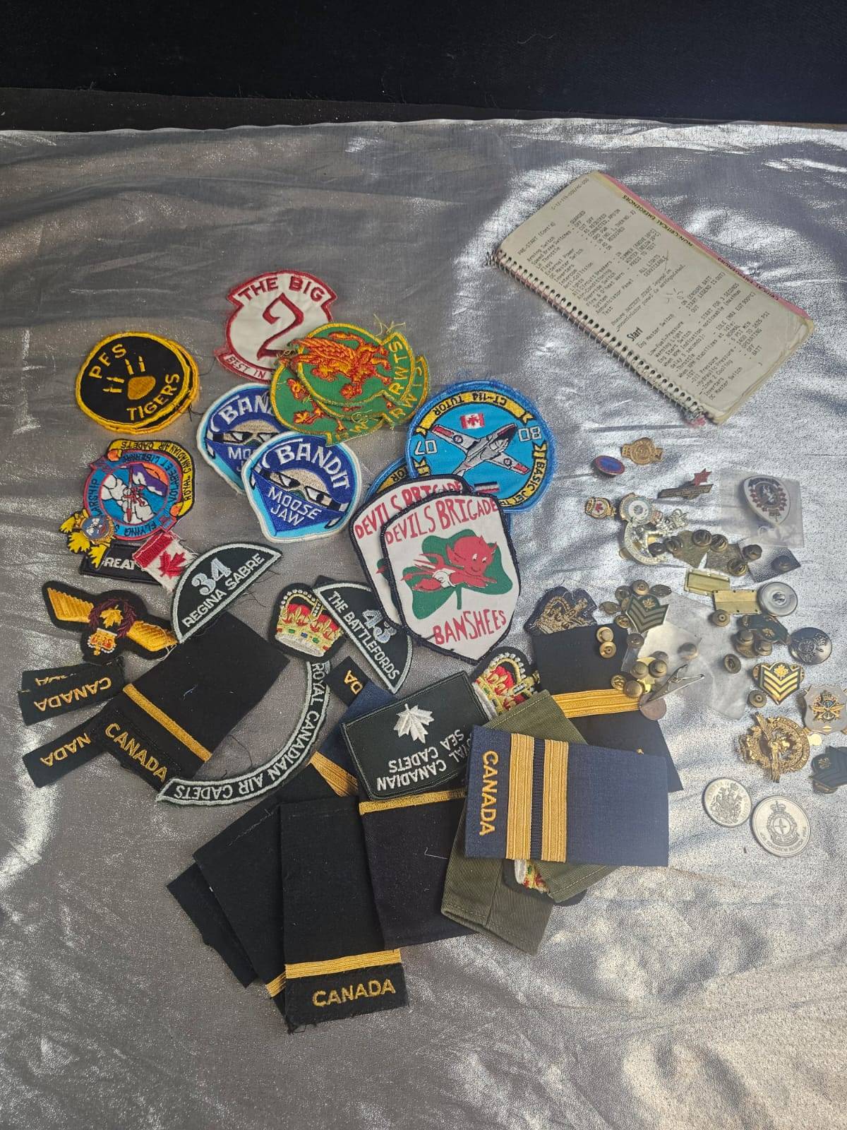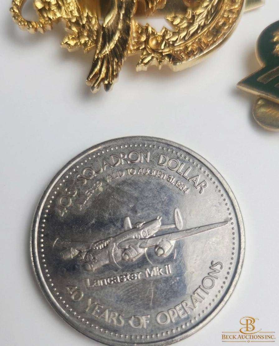 A diverse lot of military-related collectibles featuring an assortment of pins, patches, coins, and insignias. Includes detailed badges, embroidered patches with global and Canada-specific themes, and a commemorative coin marked "Squadron Dollar - 20 Years of Operations." Also features a small notebook with handwritten notes. The pieces vary in size and design, offering a unique addition to any military memorabilia or collector's display.