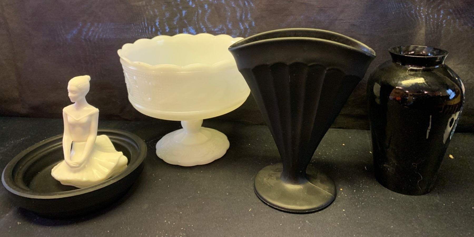 Milk Glass Candy Dish w/ Decorative Matte Black Glassware