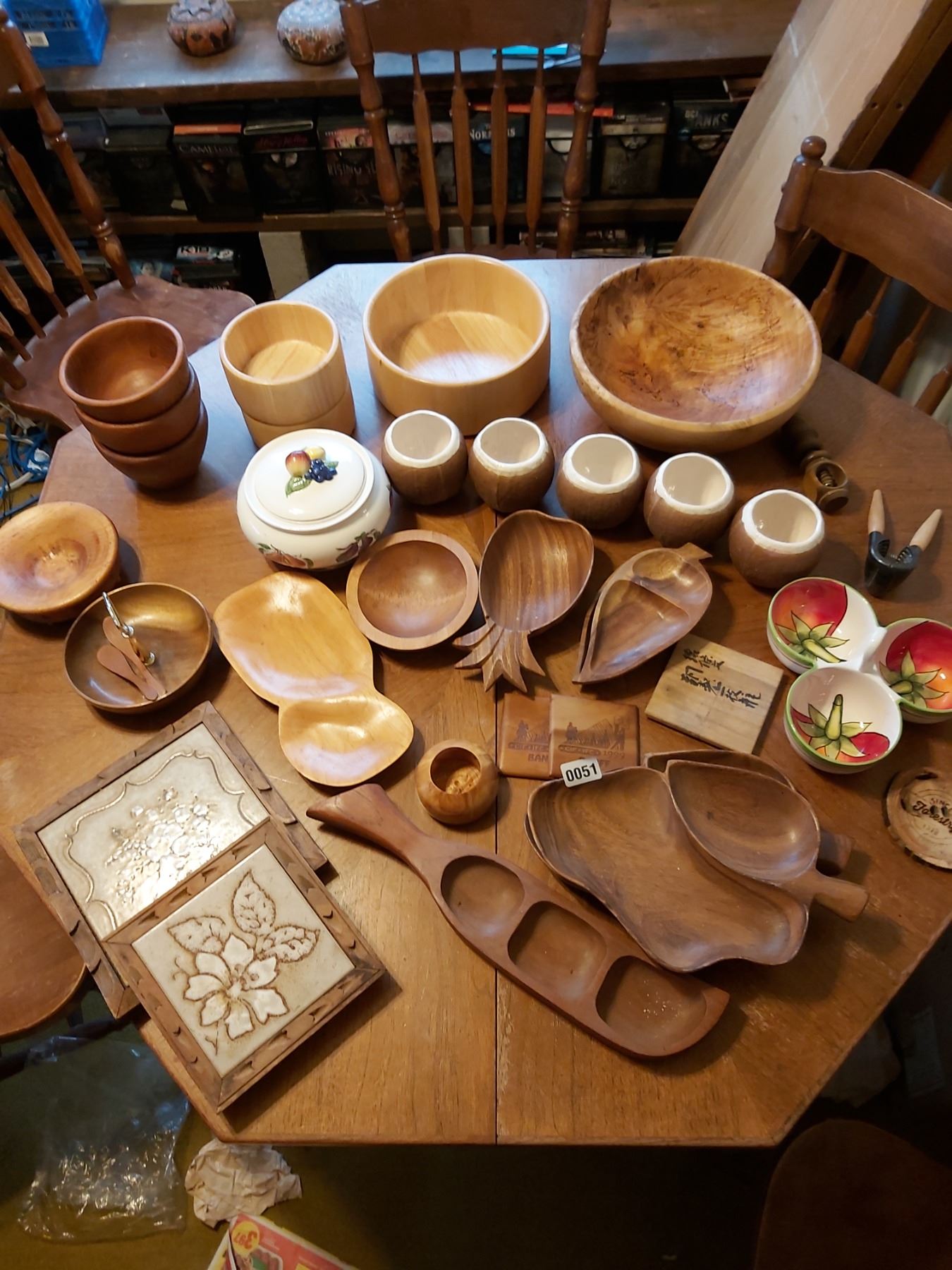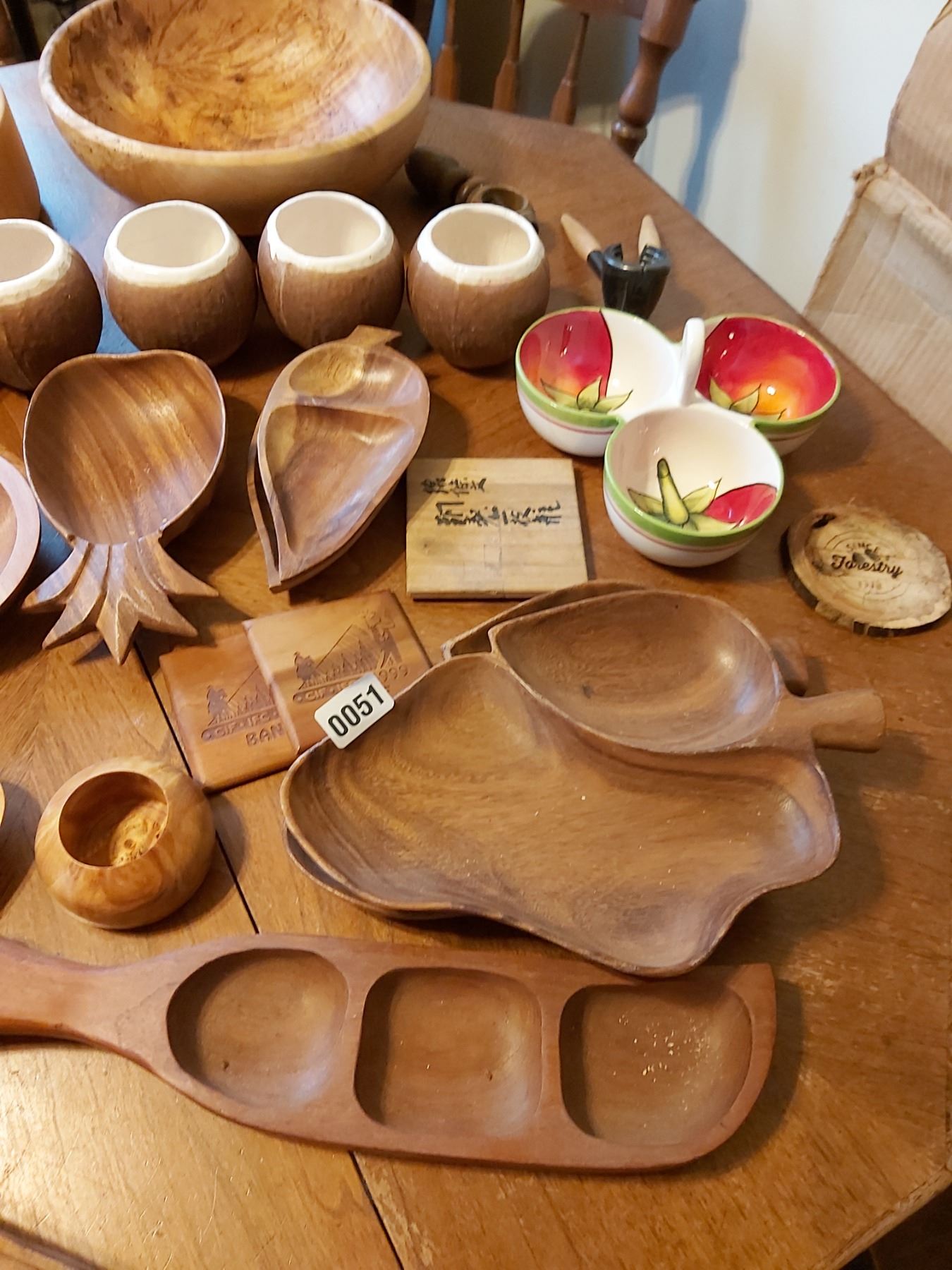 Misc wooden and china serving dishes, 5 coconut glasses, trivets