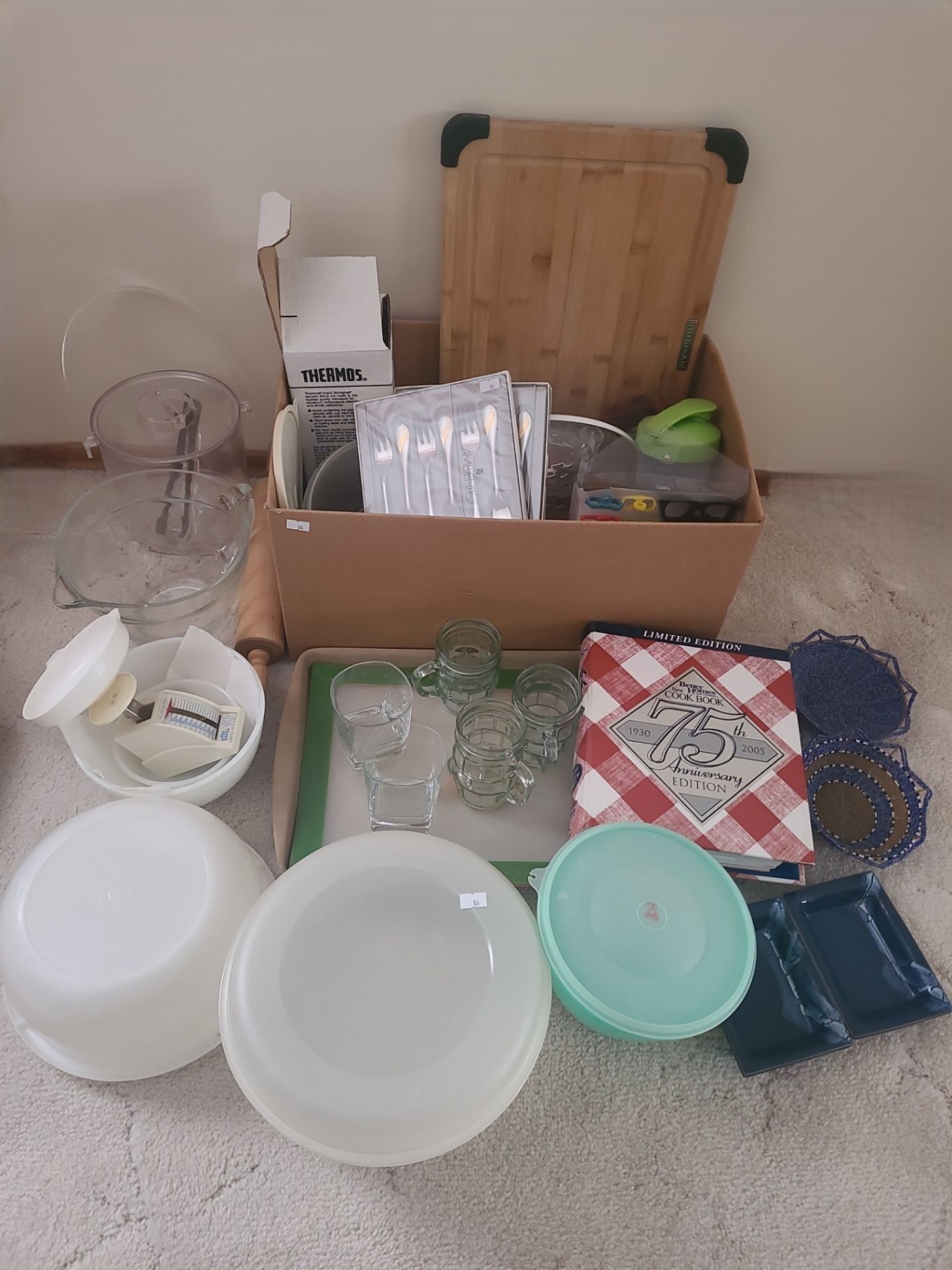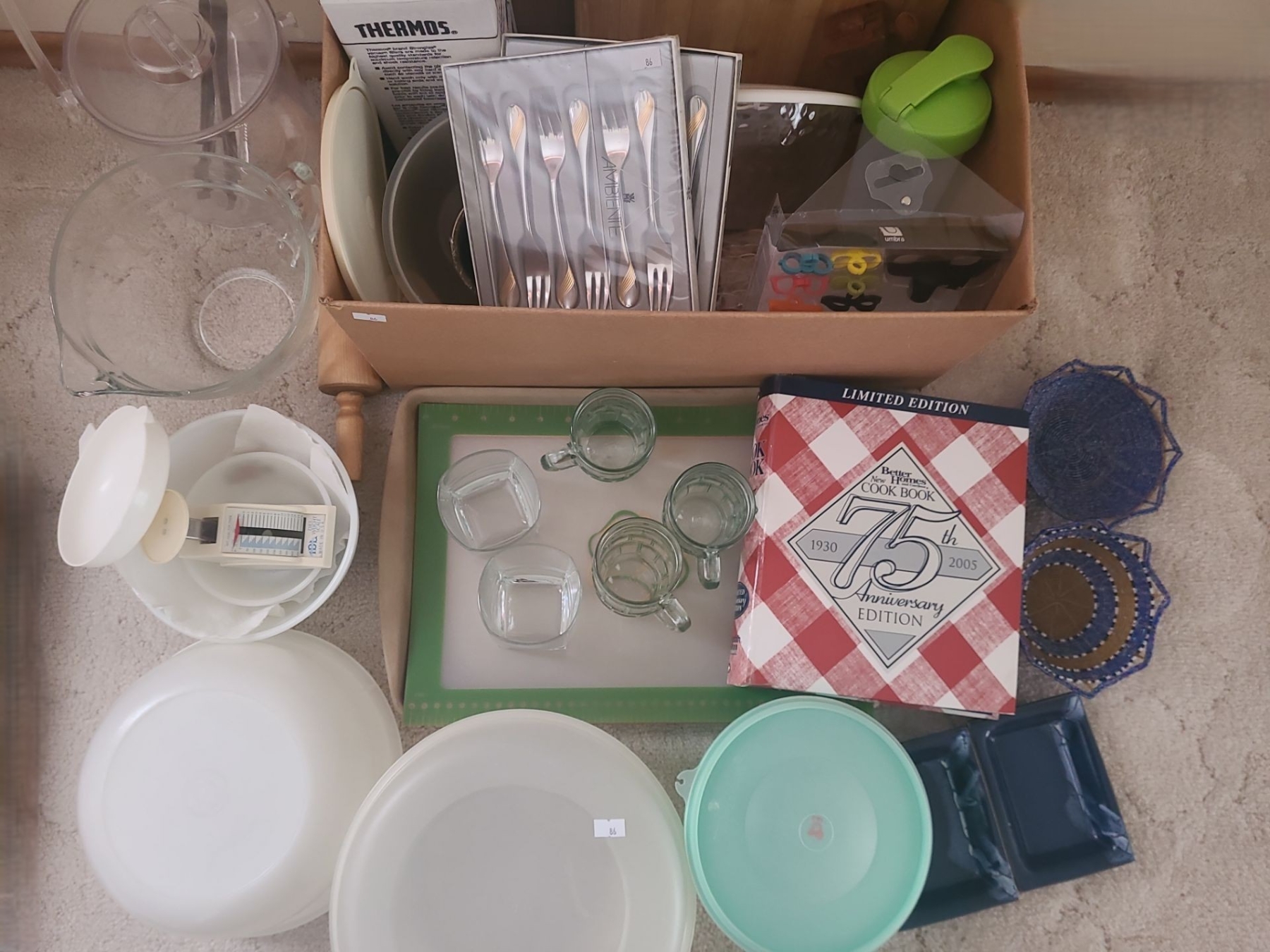 Miscellaneous Kitchen Items Including: Cake Forks, Kitchen Aid Cutting Board, Rolling Pin and More!