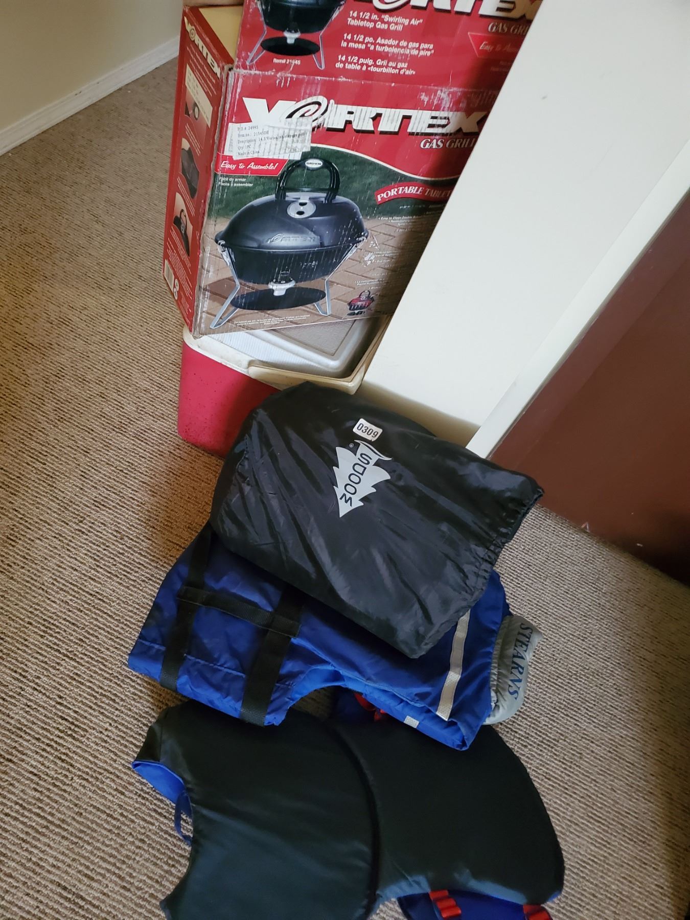 Miscellaneous Outdoor Gear - 2 Life Jackets, Small Cooler, Grill