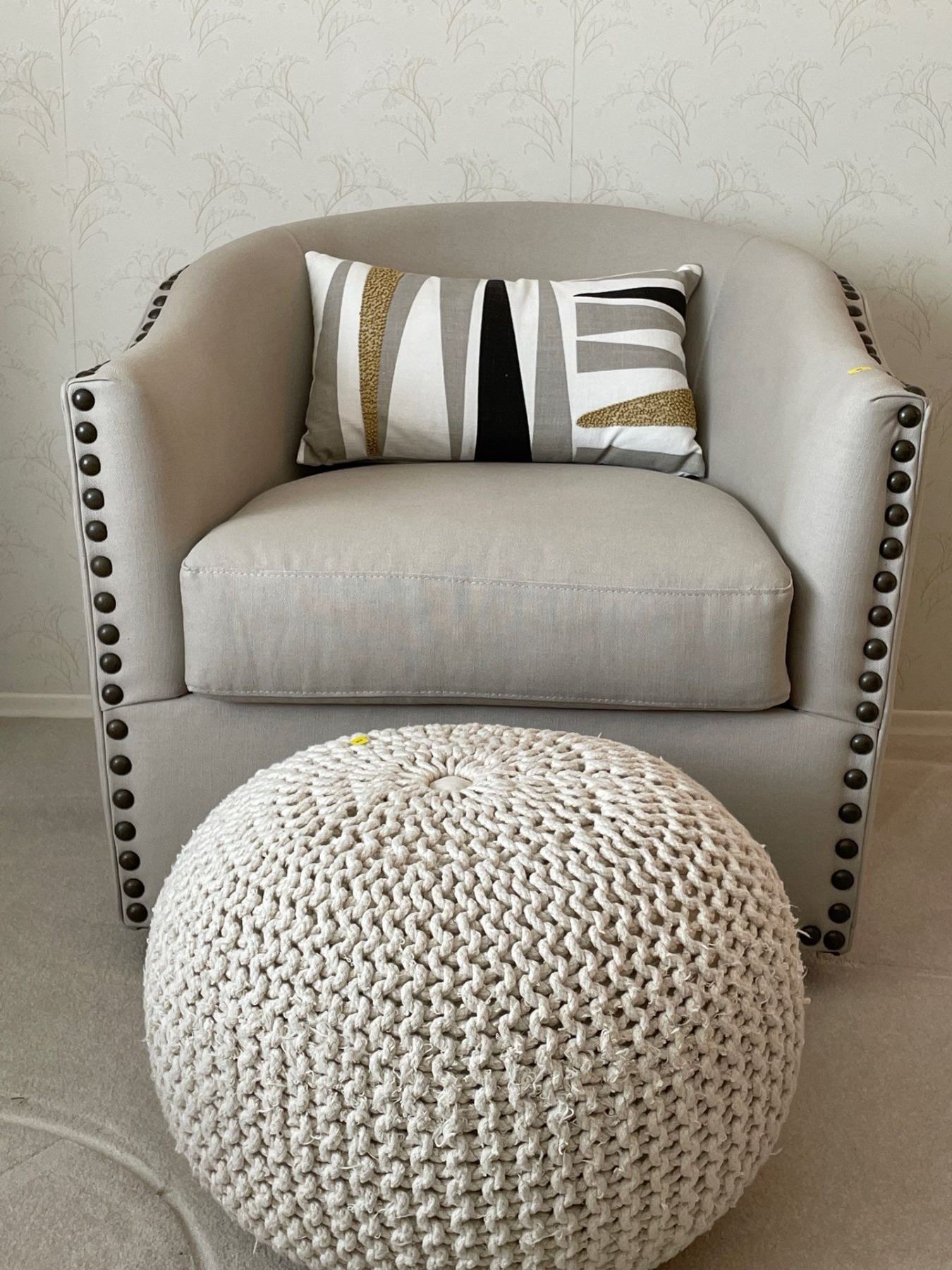 Modern Designer Beige Fabric Accent Chair w/ Decorative Pillow & Pouf Foot Rest