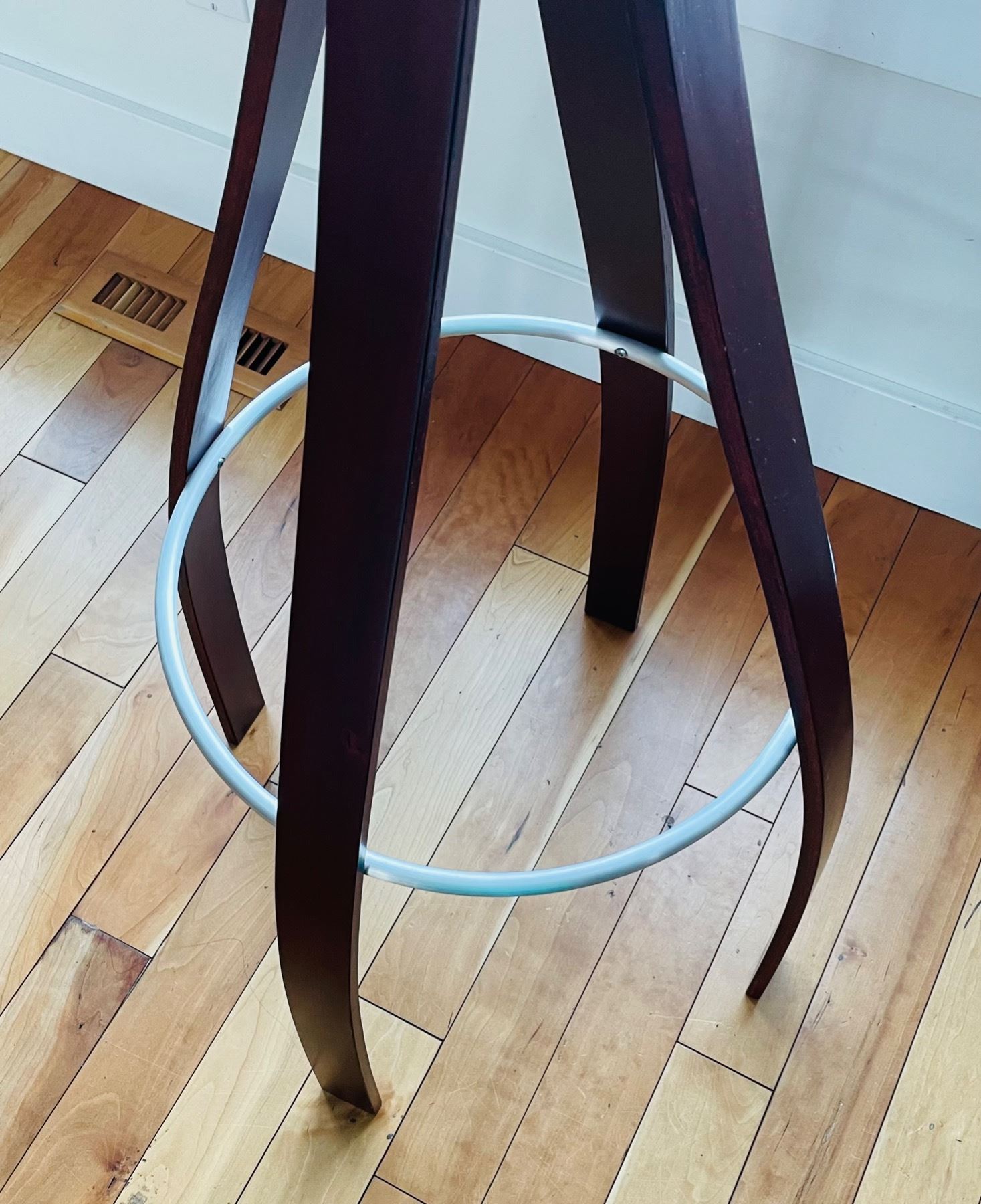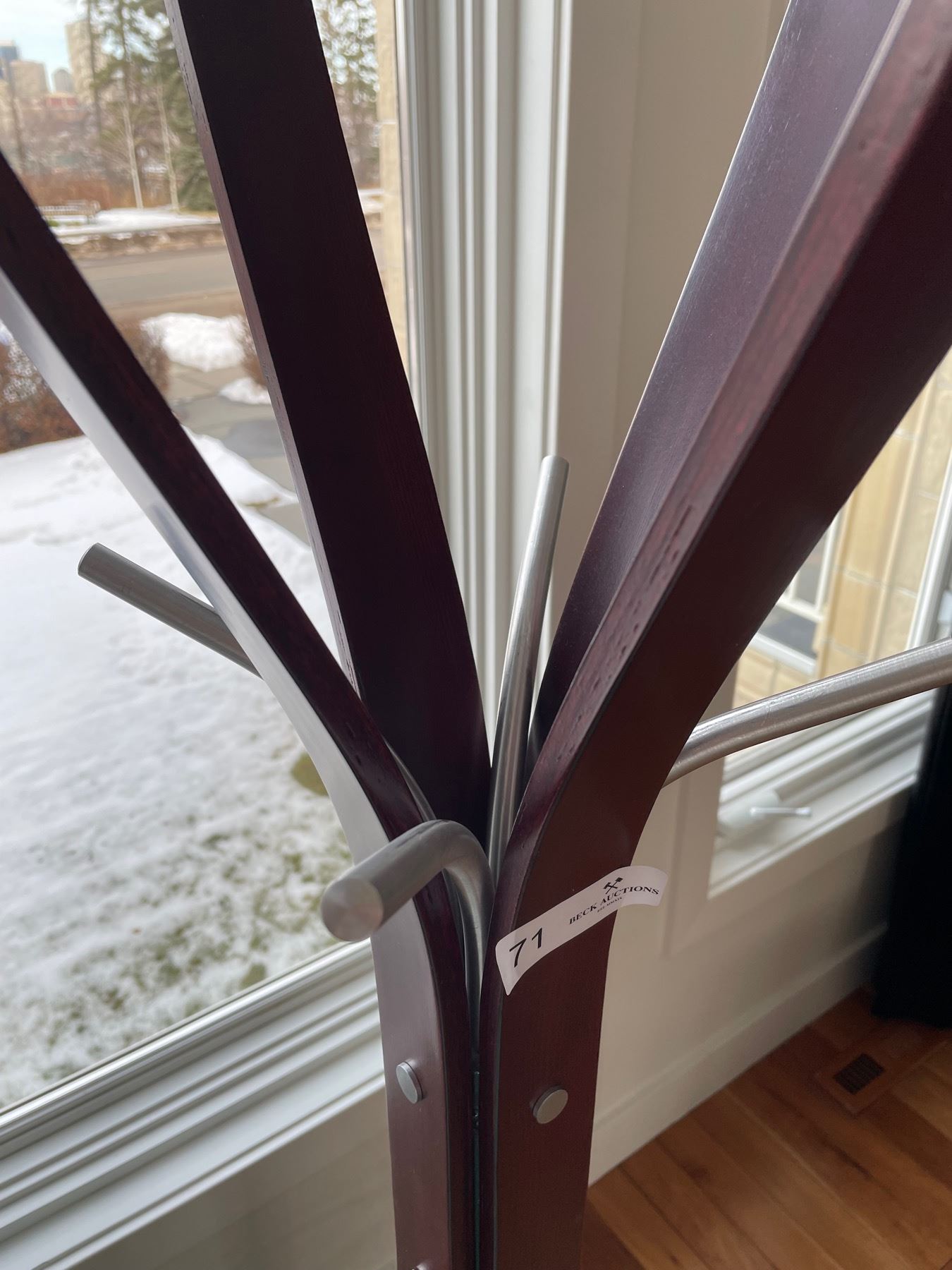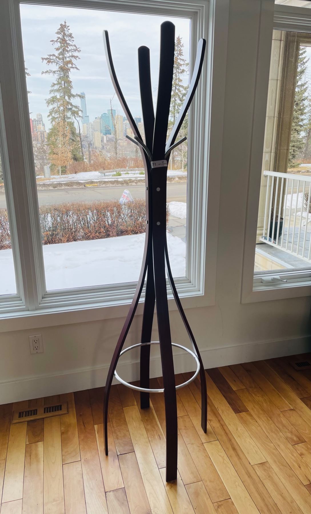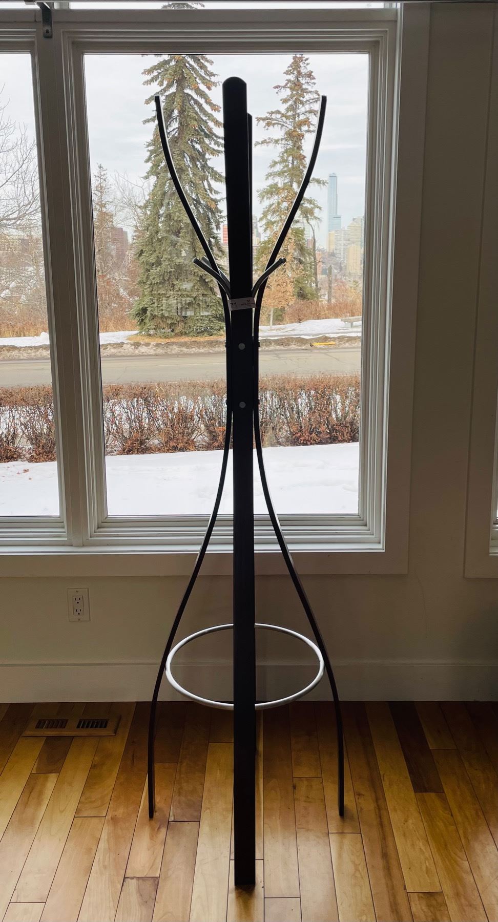 Clean looking and modern coat rack in like new condition. Measures 70 inches tall and base is 20 inches across.