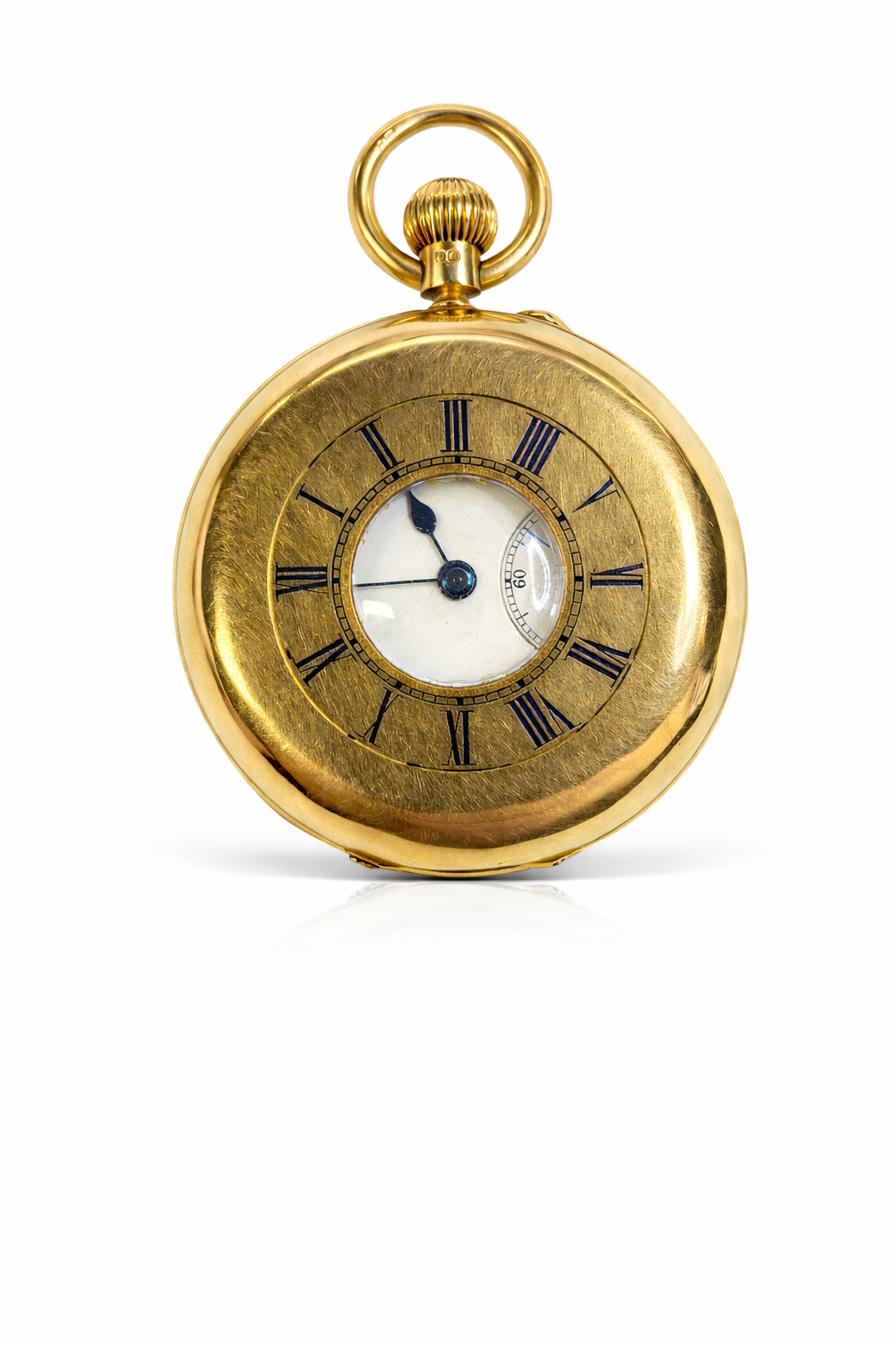 The gilt Swiss movement features jewelled bearings, blued screws, and a cut bi-metallic balance, typical of quality export watches supplied to the British market during this period. White enamel dial with Roman numerals and subsidiary seconds, fitted with blued steel hands. Hinged front and back covers.