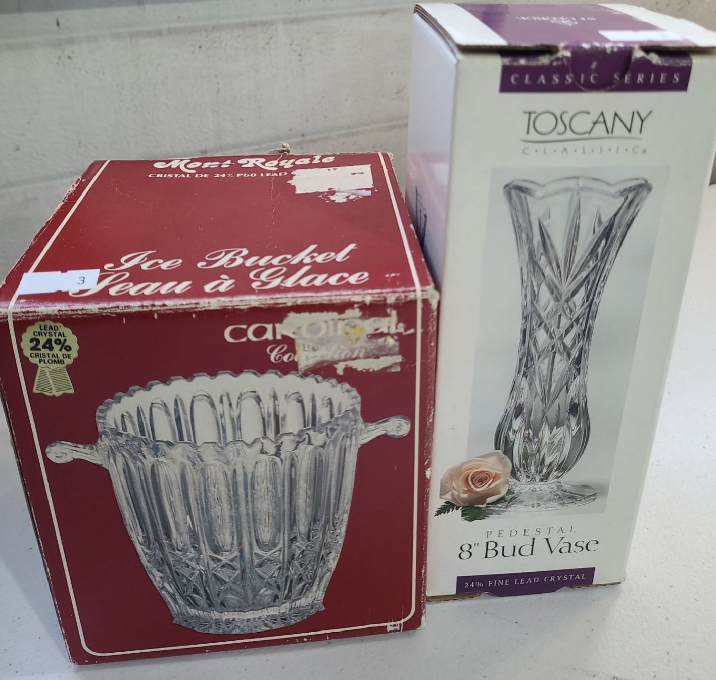 Mont Royale Crystal Ice Bucket 5" Diameter Top, 5.5 T and St George 8" Crystal Pedestal Bud Vase
