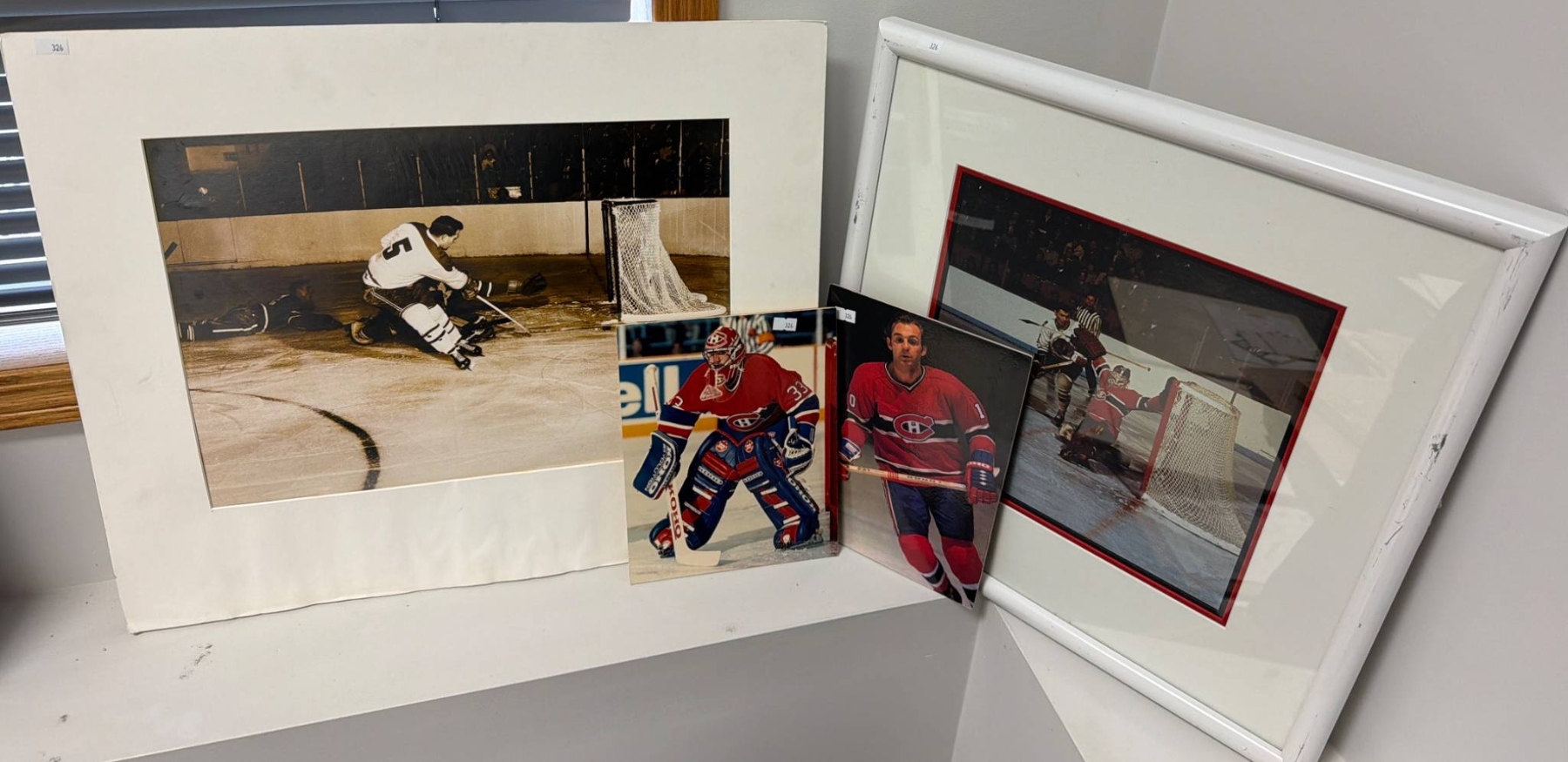 Montreal Canadiens hockey-themed images and prints, including one framed 24x20" photo, unframed prints, and an array of iconic player imagery. This lot is perfect for Canadiens fans and hockey enthusiasts, celebrating the team's rich history and legendary moments. A great addition to any sports memorabilia collection or as decorative pieces for a fan's space.