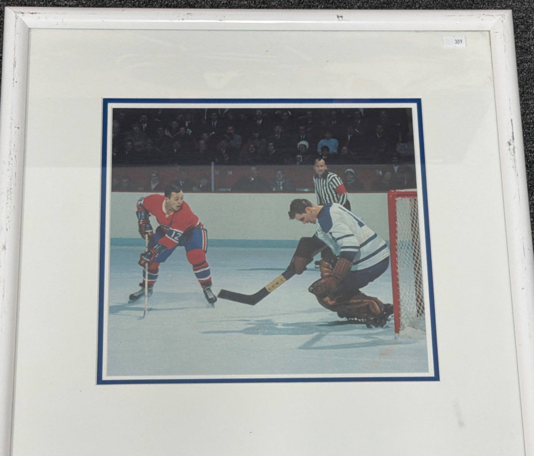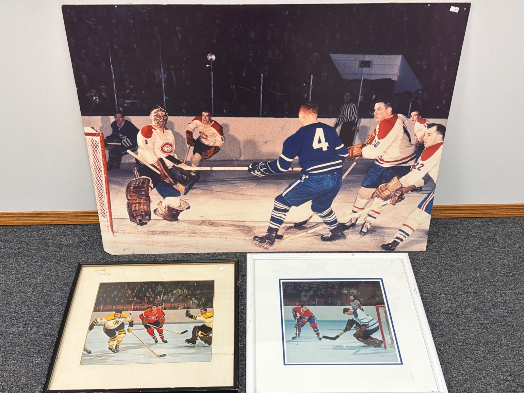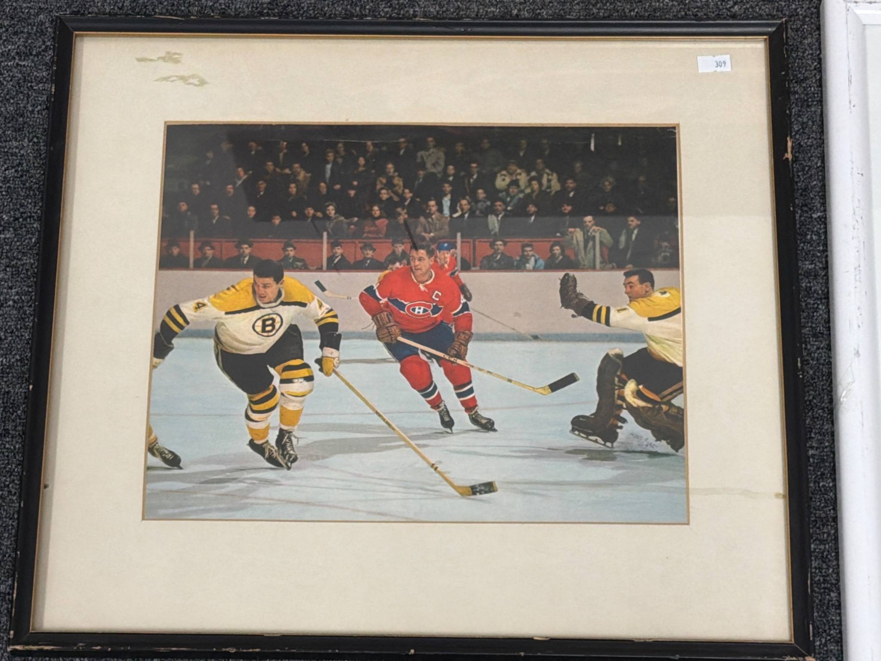 Large 40"x 30" artwork depicting an intense hockey moment featuring the Montreal Canadiens in action. Perfect for sports enthusiasts or collectors of hockey memorabilia. Includes vibrant colors and dynamic composition that capture historical NHL gameplay. Ideal as a showcase piece for a game room or office.