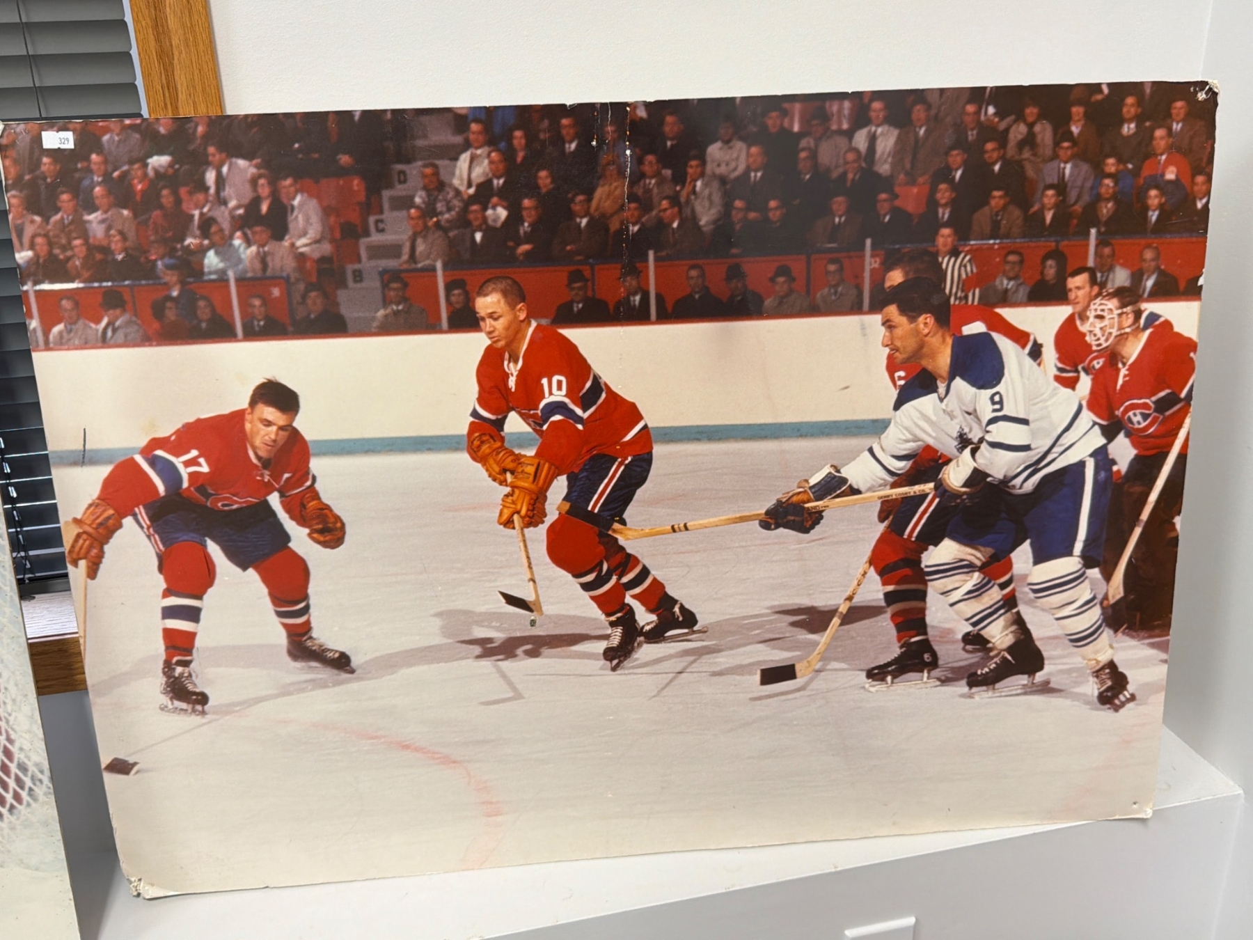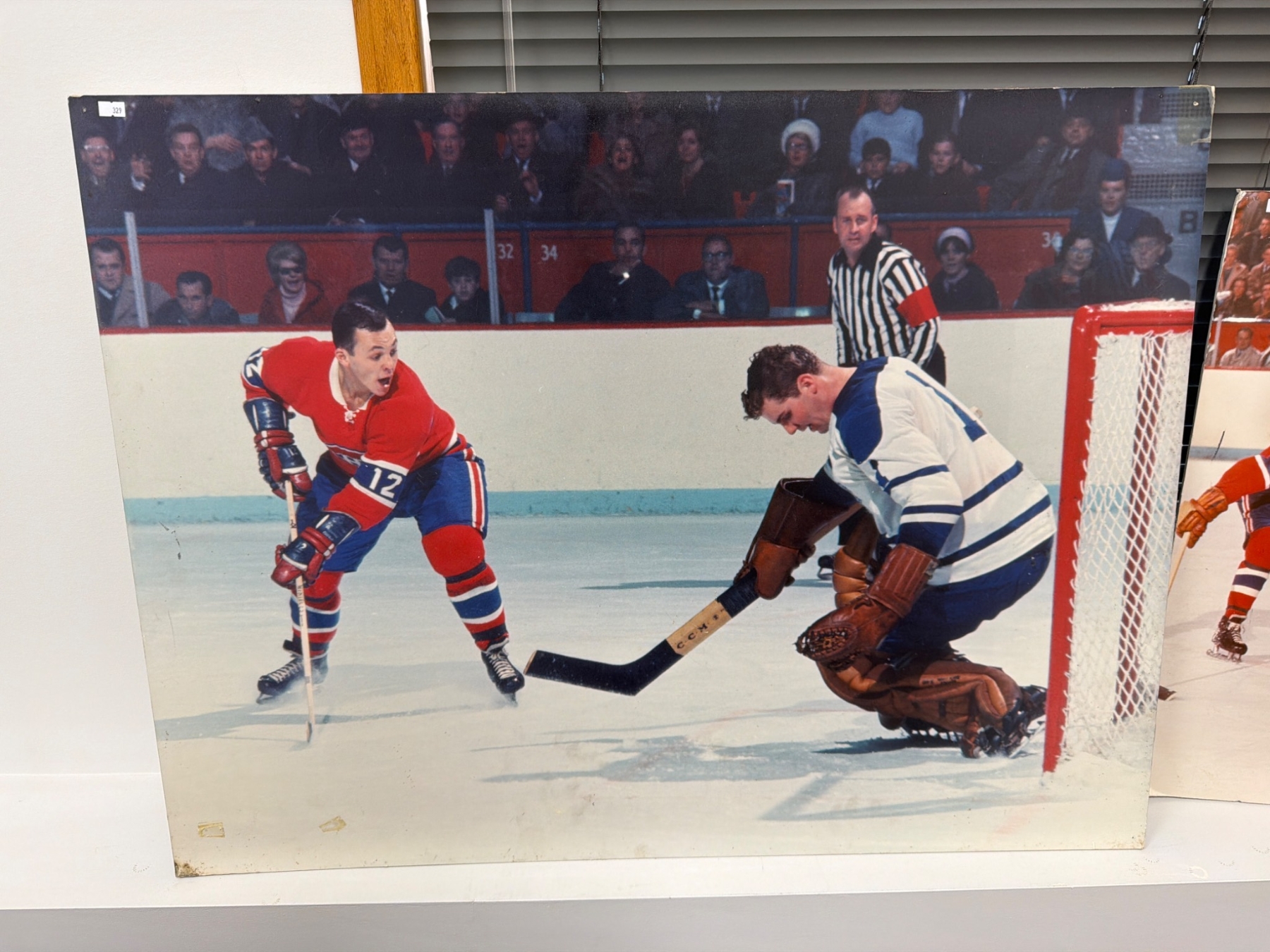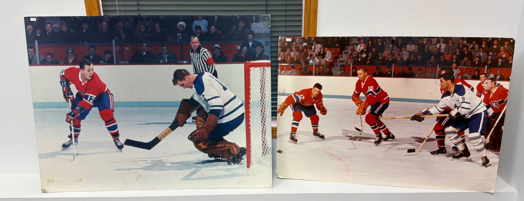 Two large 40x30 prints featuring iconic Montreal Canadiens hockey action against the Toronto Maple Leafs. The vibrant images showcase intense in-game moments, capturing the passion of the sport. Documented names on the reverse include players like J.G. Talbot, Ted Harris, and Andy Bathgate. Perfect for sports enthusiasts or collectors of hockey memorabilia.