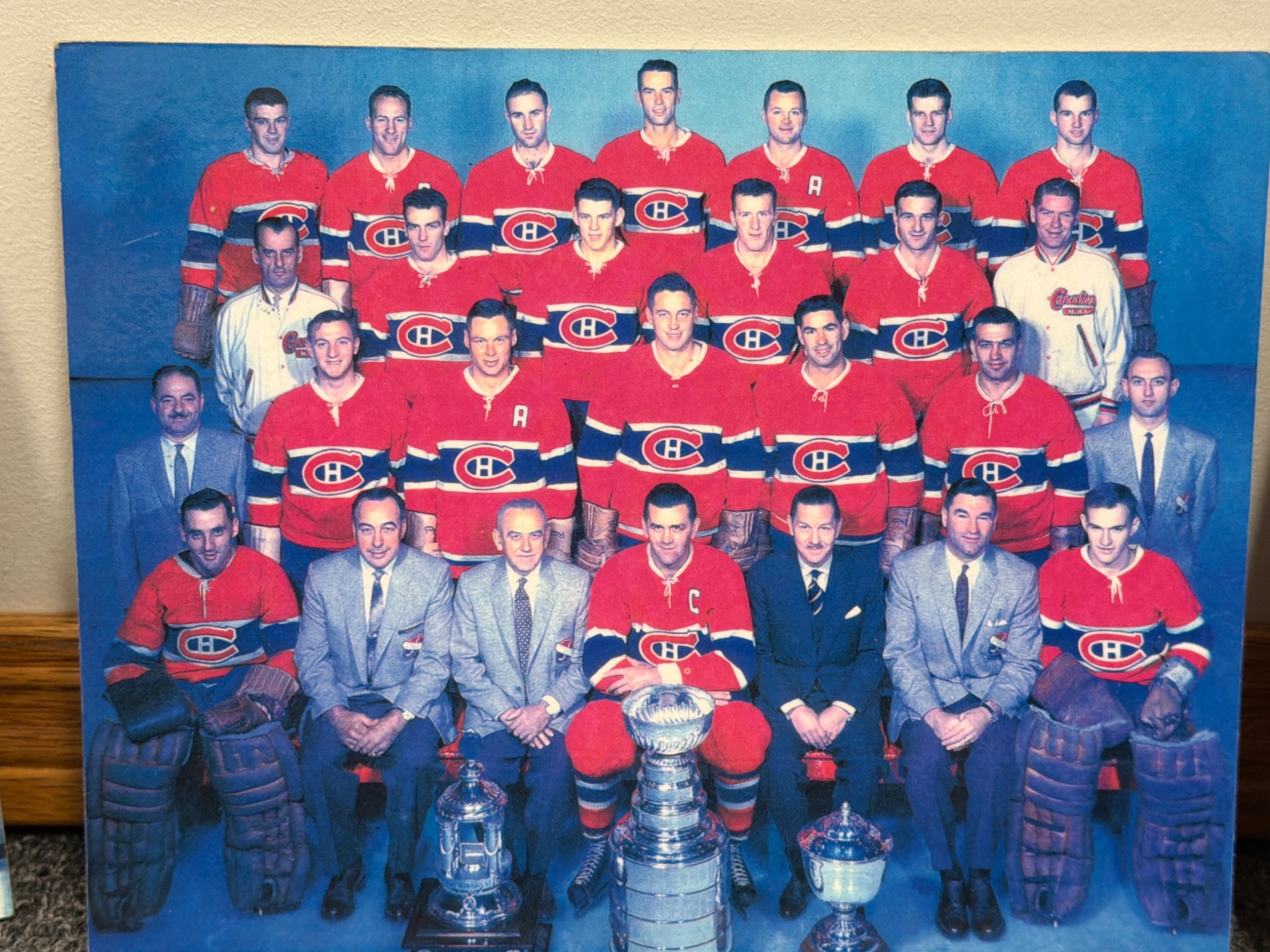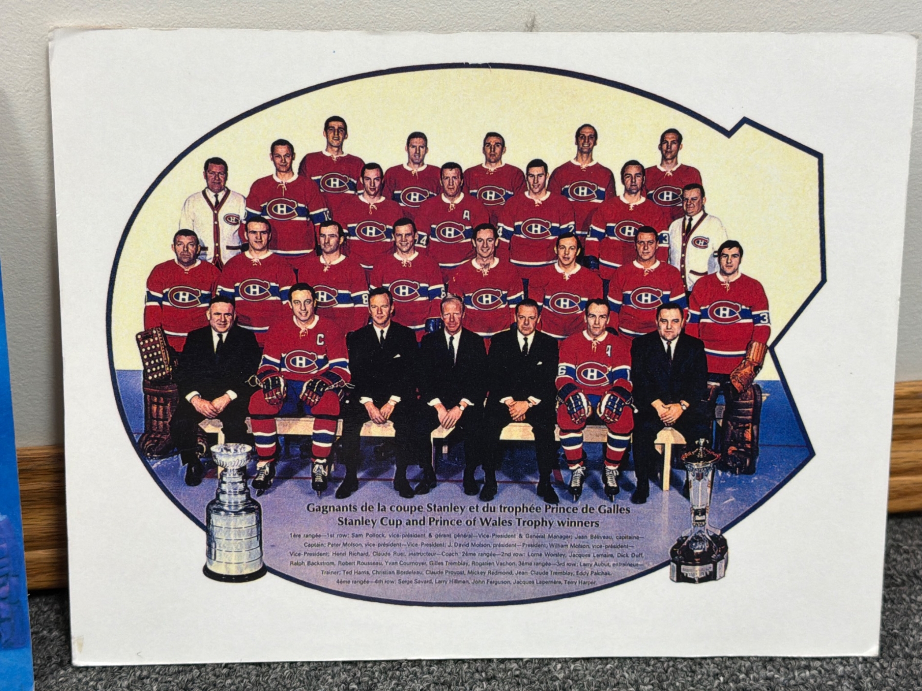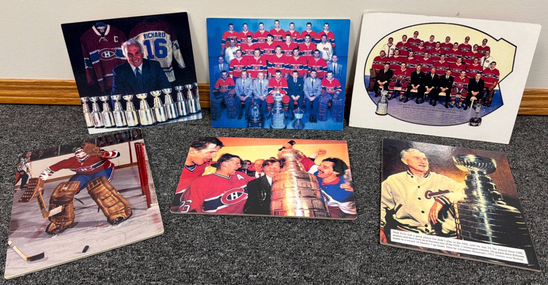 A unique set of six photographs showcasing the rich history of the Montreal Canadiens with the Stanley Cup. Included are team portraits, moments of victory, and iconic players. Highlights include legendary figures like Dick Irvin and representations of championship wins. Ideal for hockey fans or collectors of NHL memorabilia.